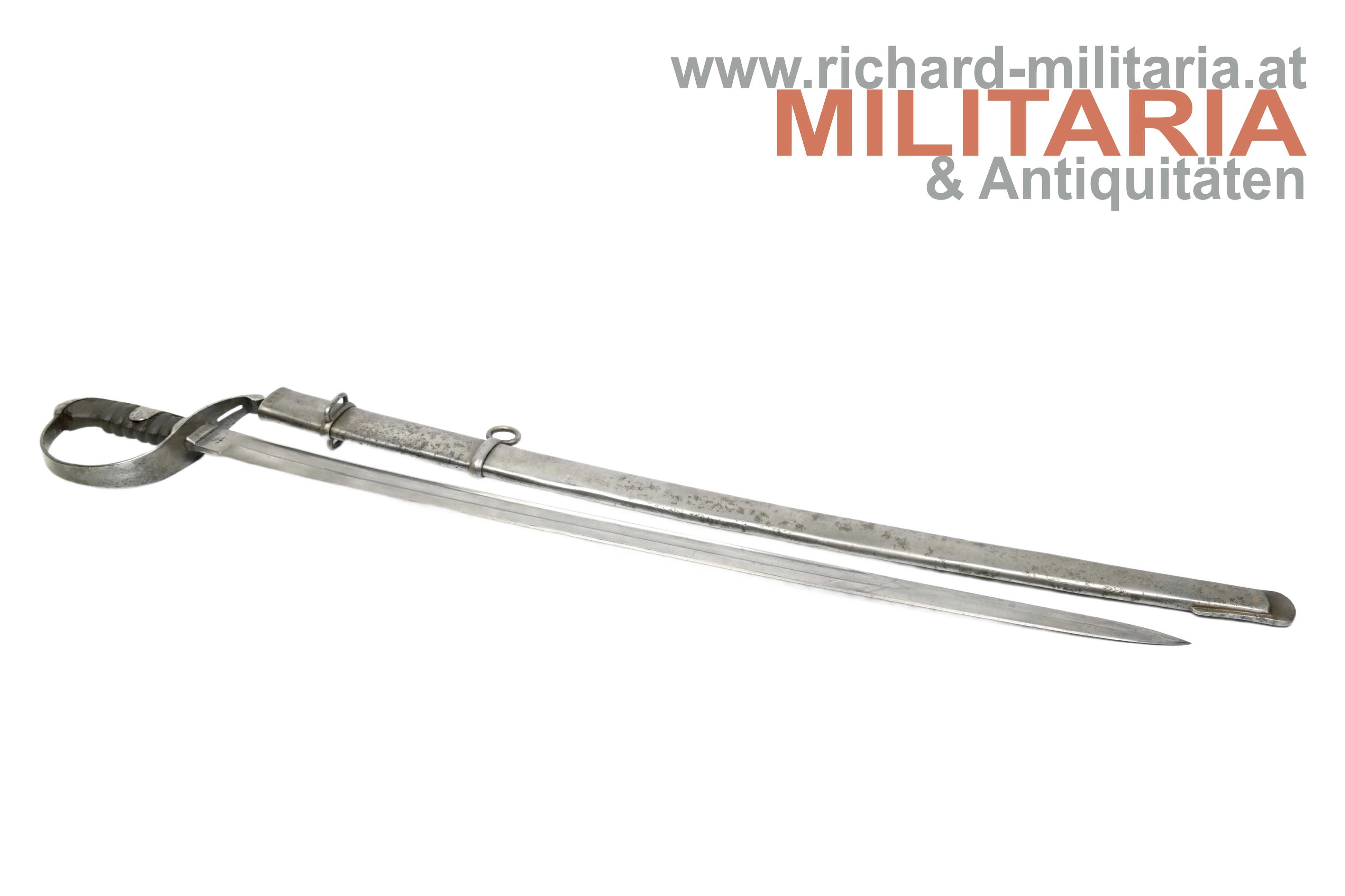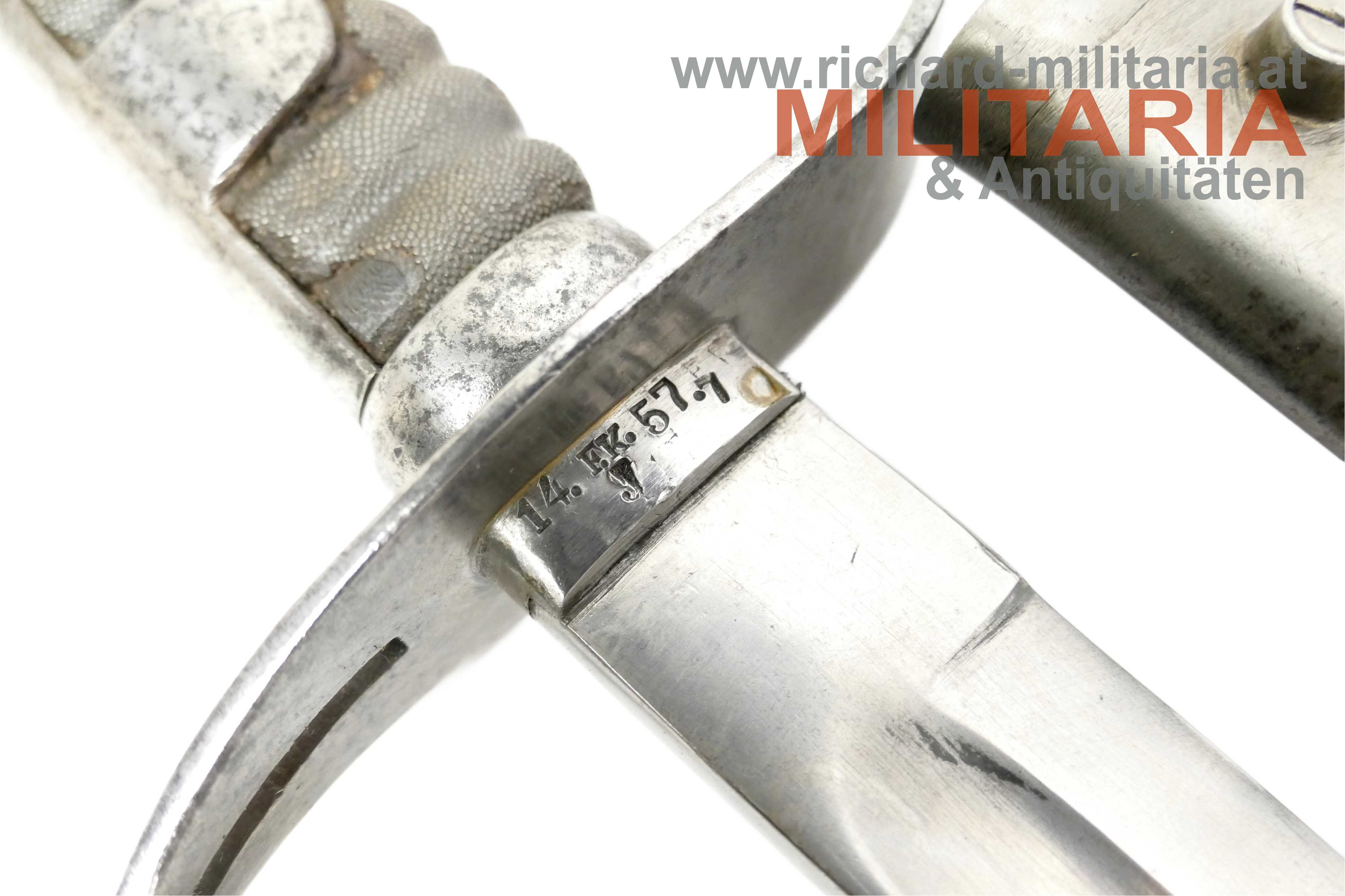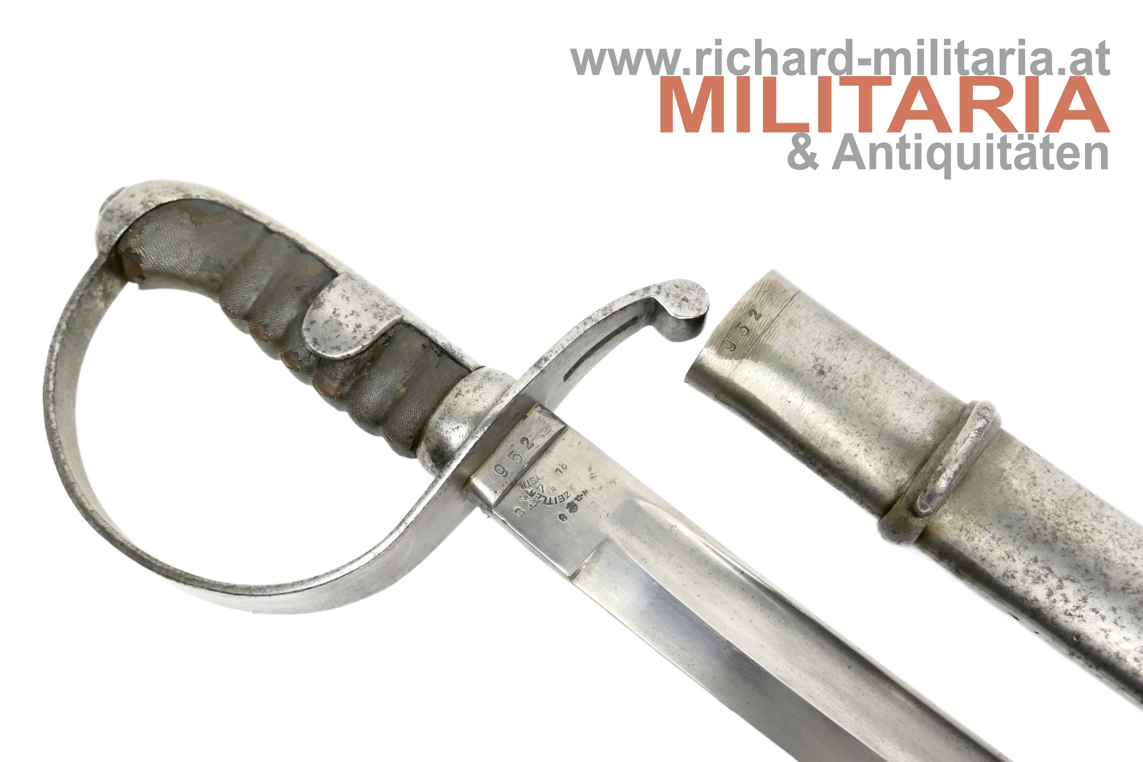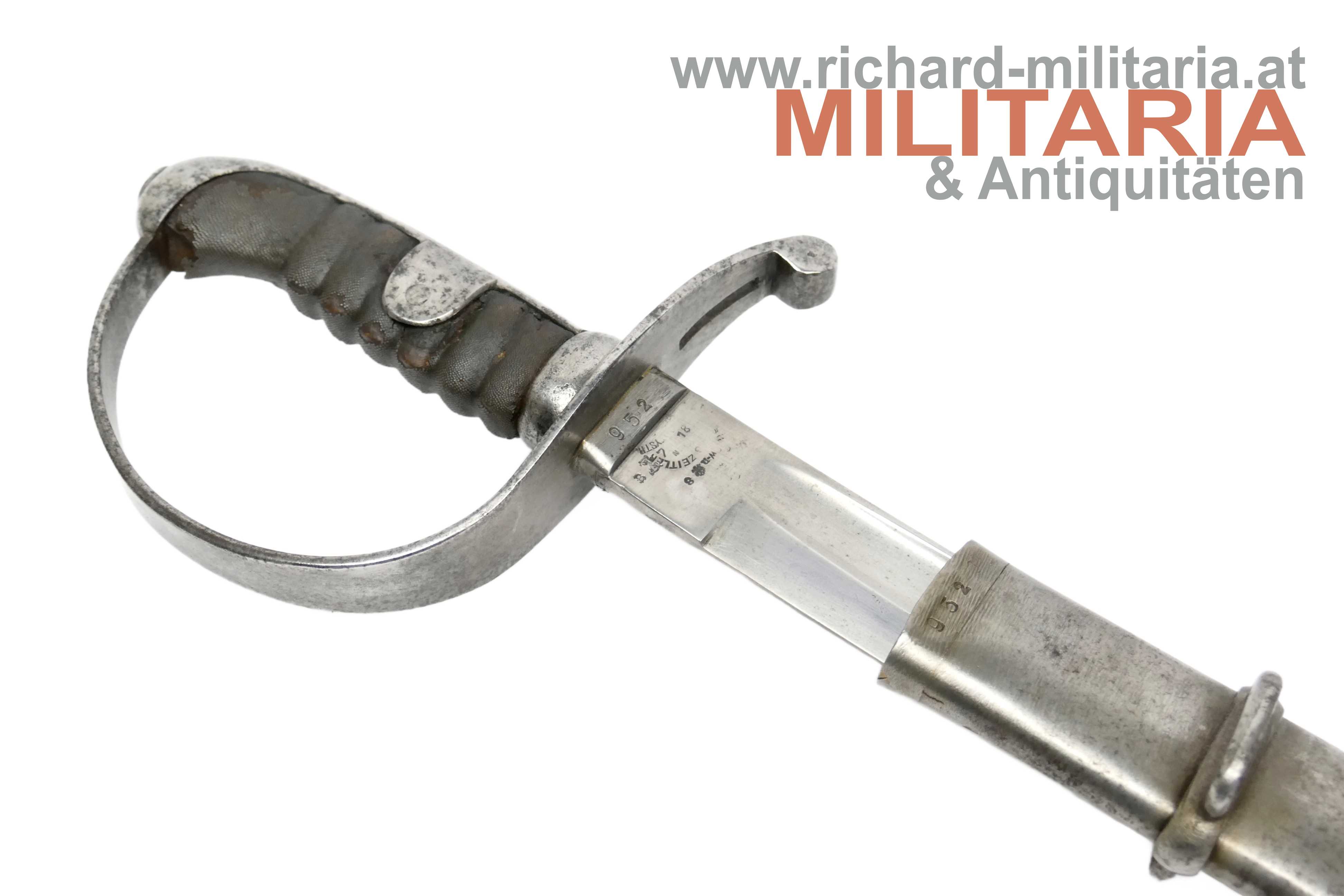 k.u.k. Kavallerie-Mannschaftssäbel M1877 "leichter Gattung"; beidseitig gekehlte Rückenklinge in sehr guter Erhaltung; Vielzahl von Stempelungen auf der Fehlschärfe; unter anderem Herstellerstempel "Zeitler" und Armeeabnahme "W-n Doppeladler 8"; darüber die Waffennummer "952" - Scheide und Säbel nummerngleich (!); auf der anderen Seite des Säbels die Truppenkennung "14. FK. 57xx" (Feldkanonenregiment Nr. 14); Fischhautgriff stärker beschädigt; gereinigte narbige Scheide; Scheide am unteren Ende undeutlich gestempelt; am Scheidenansatz abgesehen von der Waffennummer mit "J 7" gestempelt;