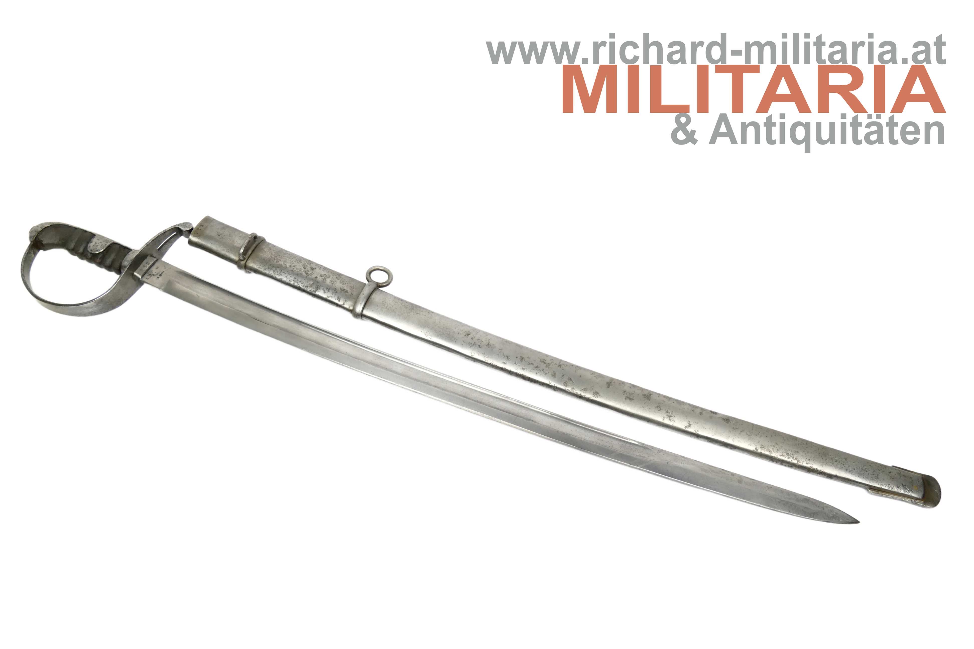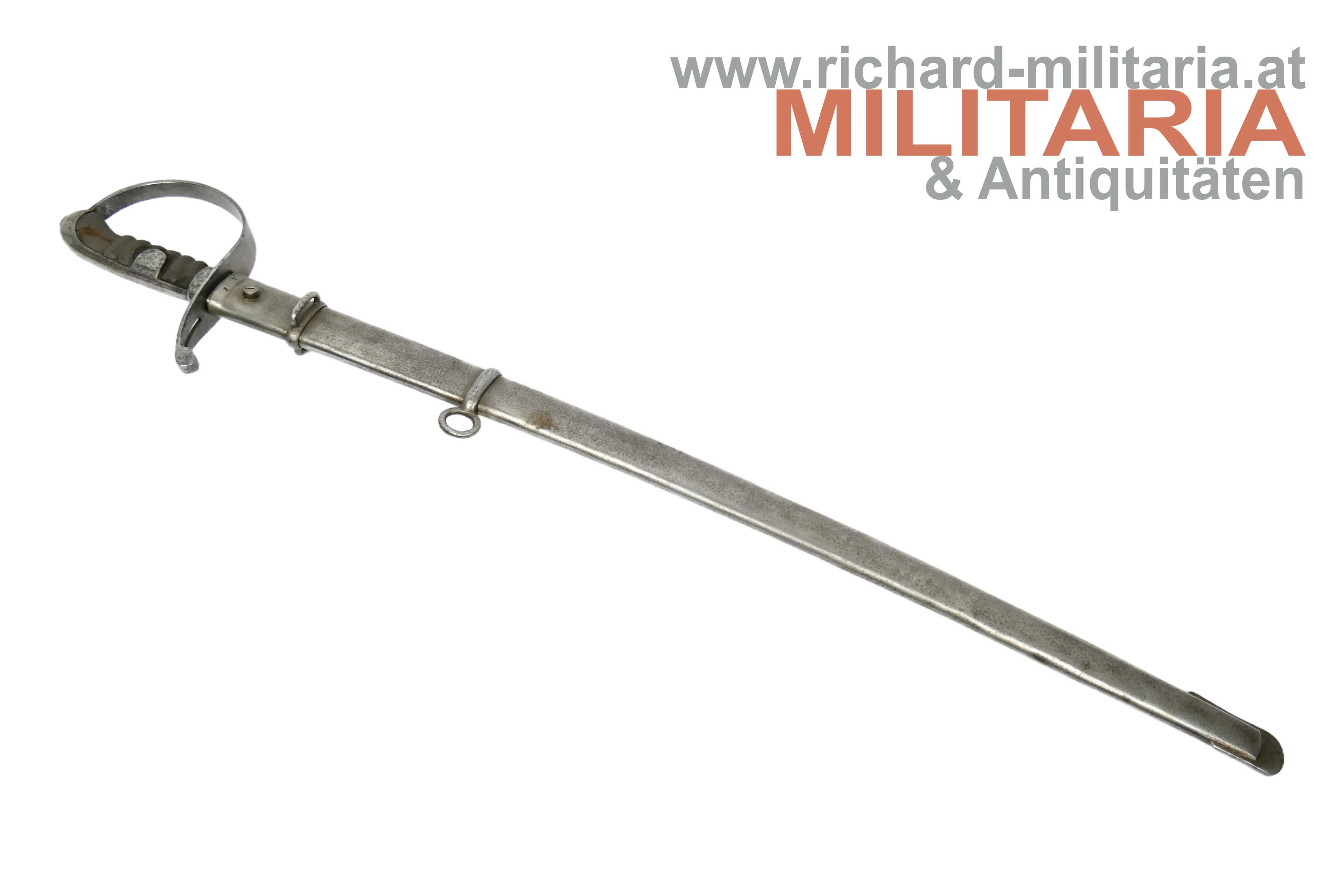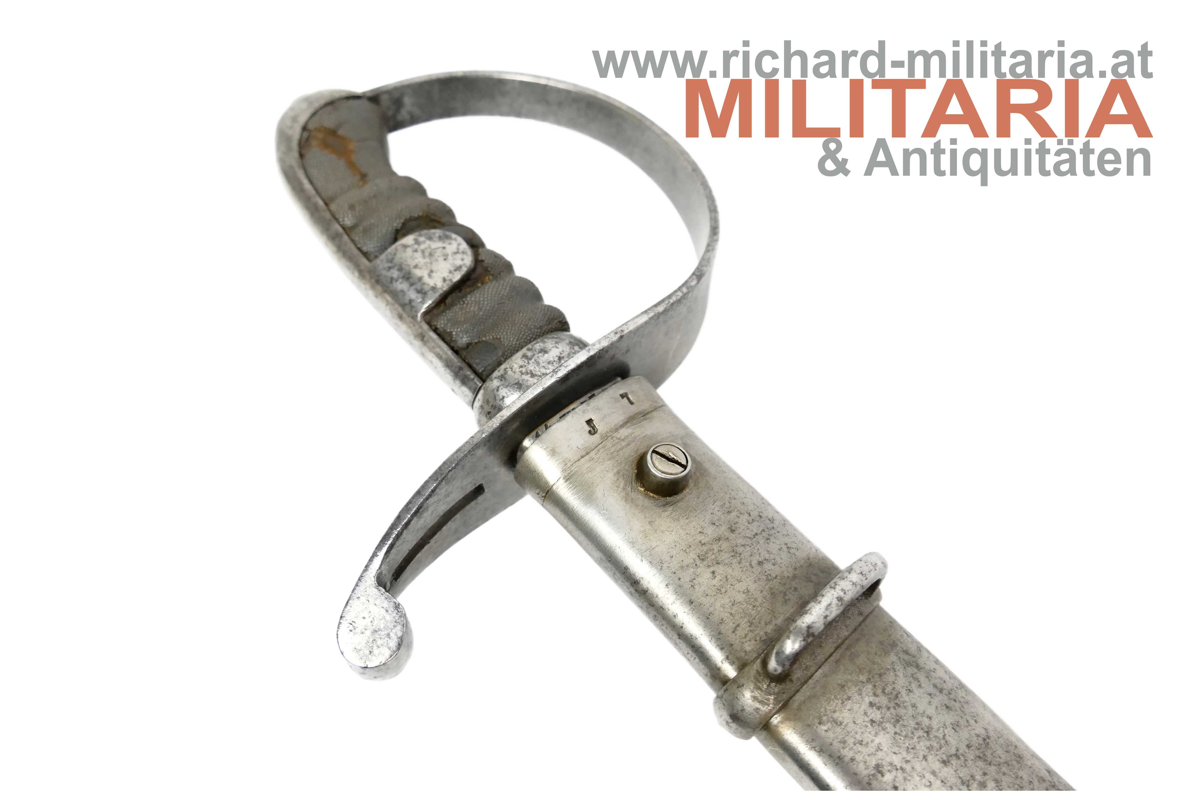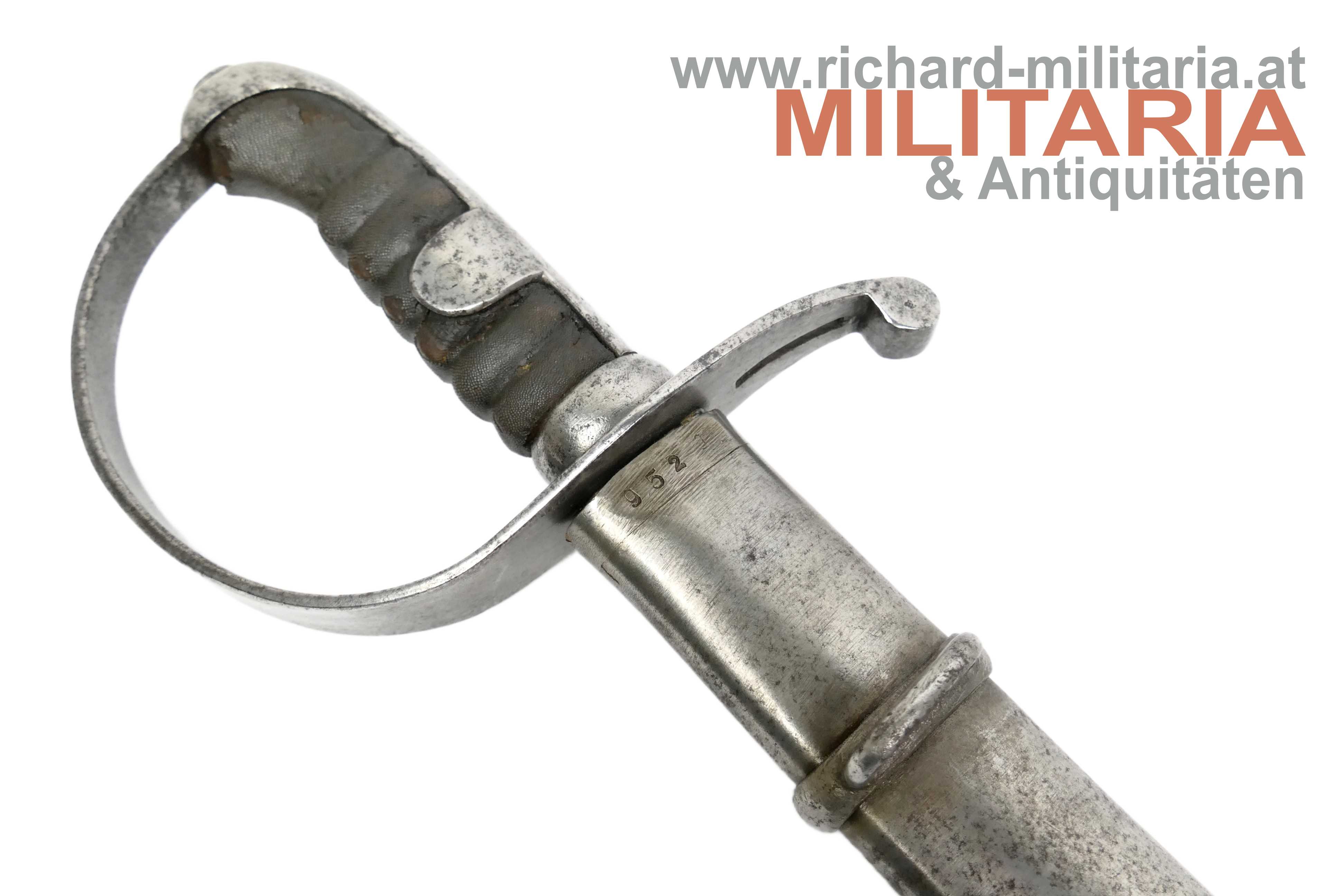 k.u.k. Kavallerie-Mannschaftssäbel M1877 "leichter Gattung"; beidseitig gekehlte Rückenklinge in sehr guter Erhaltung; Vielzahl von Stempelungen auf der Fehlschärfe; unter anderem Herstellerstempel "Zeitler" und Armeeabnahme "W-n Doppeladler 8"; darüber die Waffennummer "952" - Scheide und Säbel nummerngleich (!); auf der anderen Seite des Säbels die Truppenkennung "14. FK. 57xx" (Feldkanonenregiment Nr. 14); Fischhautgriff stärker beschädigt; gereinigte narbige Scheide; Scheide am unteren Ende undeutlich gestempelt; am Scheidenansatz abgesehen von der Waffennummer mit "J 7" gestempelt;