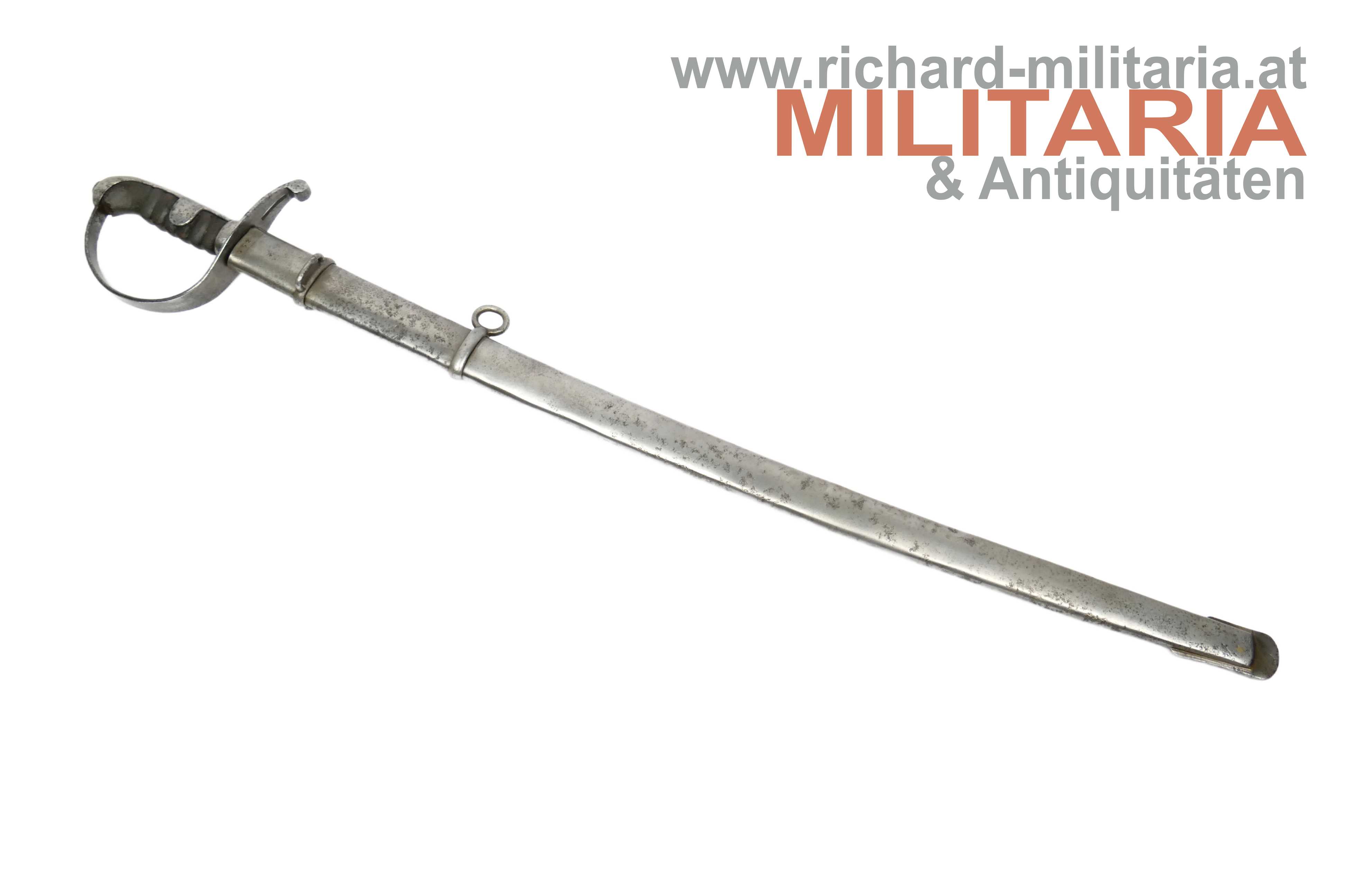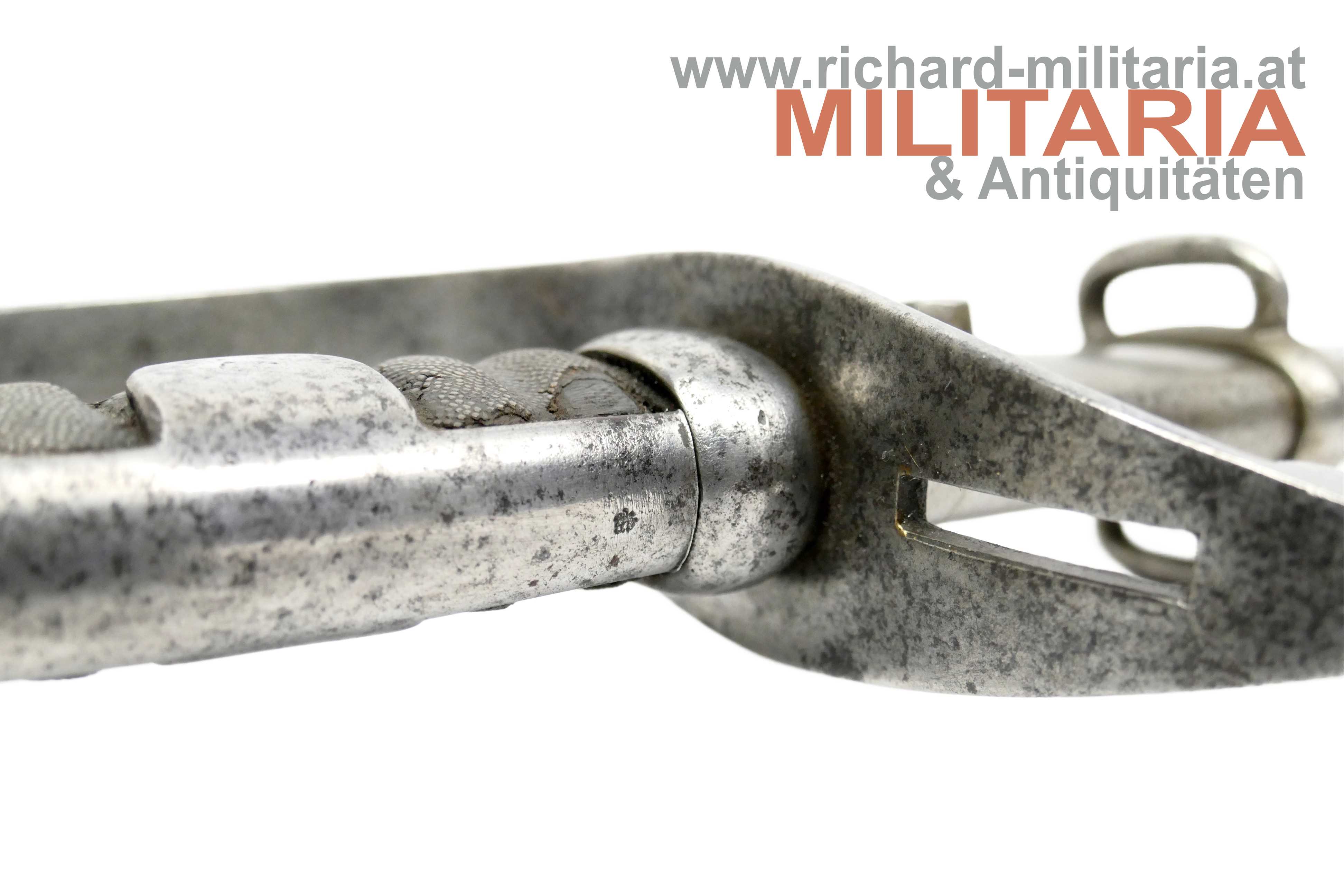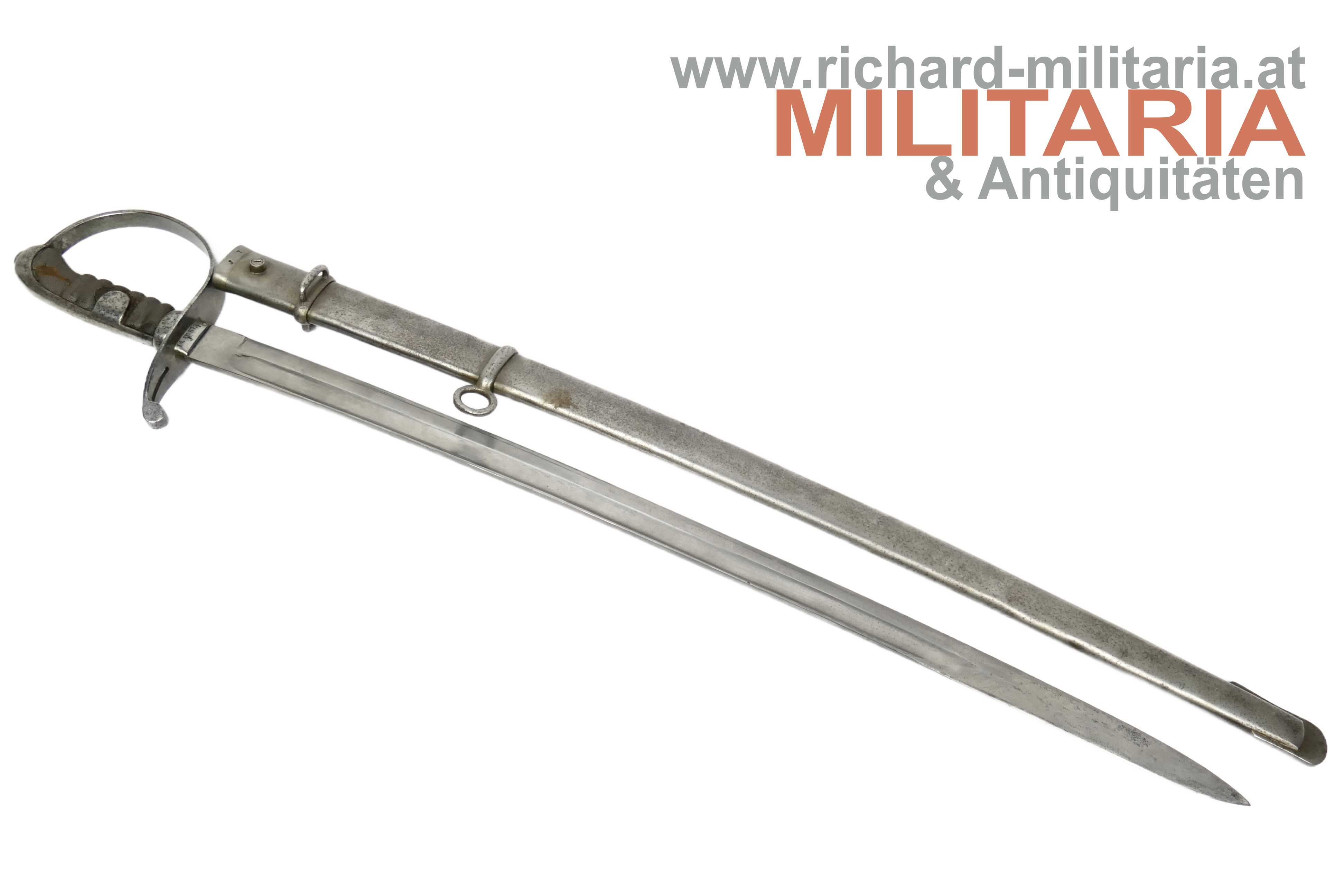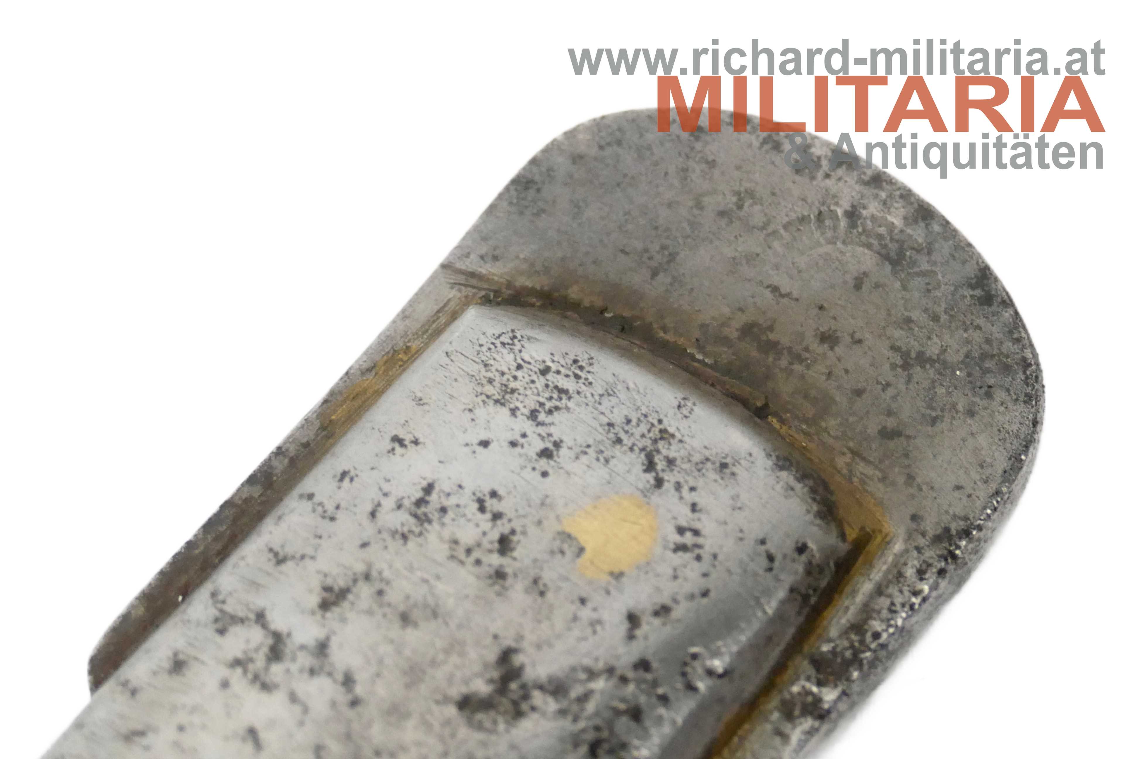k.u.k. Kavallerie-Mannschaftssäbel M1877 "leichter Gattung"; beidseitig gekehlte Rückenklinge in sehr guter Erhaltung; Vielzahl von Stempelungen auf der Fehlschärfe; unter anderem Herstellerstempel "Zeitler" und Armeeabnahme "W-n Doppeladler 8"; darüber die Waffennummer "952" - Scheide und Säbel nummerngleich (!); auf der anderen Seite des Säbels die Truppenkennung "14. FK. 57xx" (Feldkanonenregiment Nr. 14); Fischhautgriff stärker beschädigt; gereinigte narbige Scheide; Scheide am unteren Ende undeutlich gestempelt; am Scheidenansatz abgesehen von der Waffennummer mit "J 7" gestempelt;