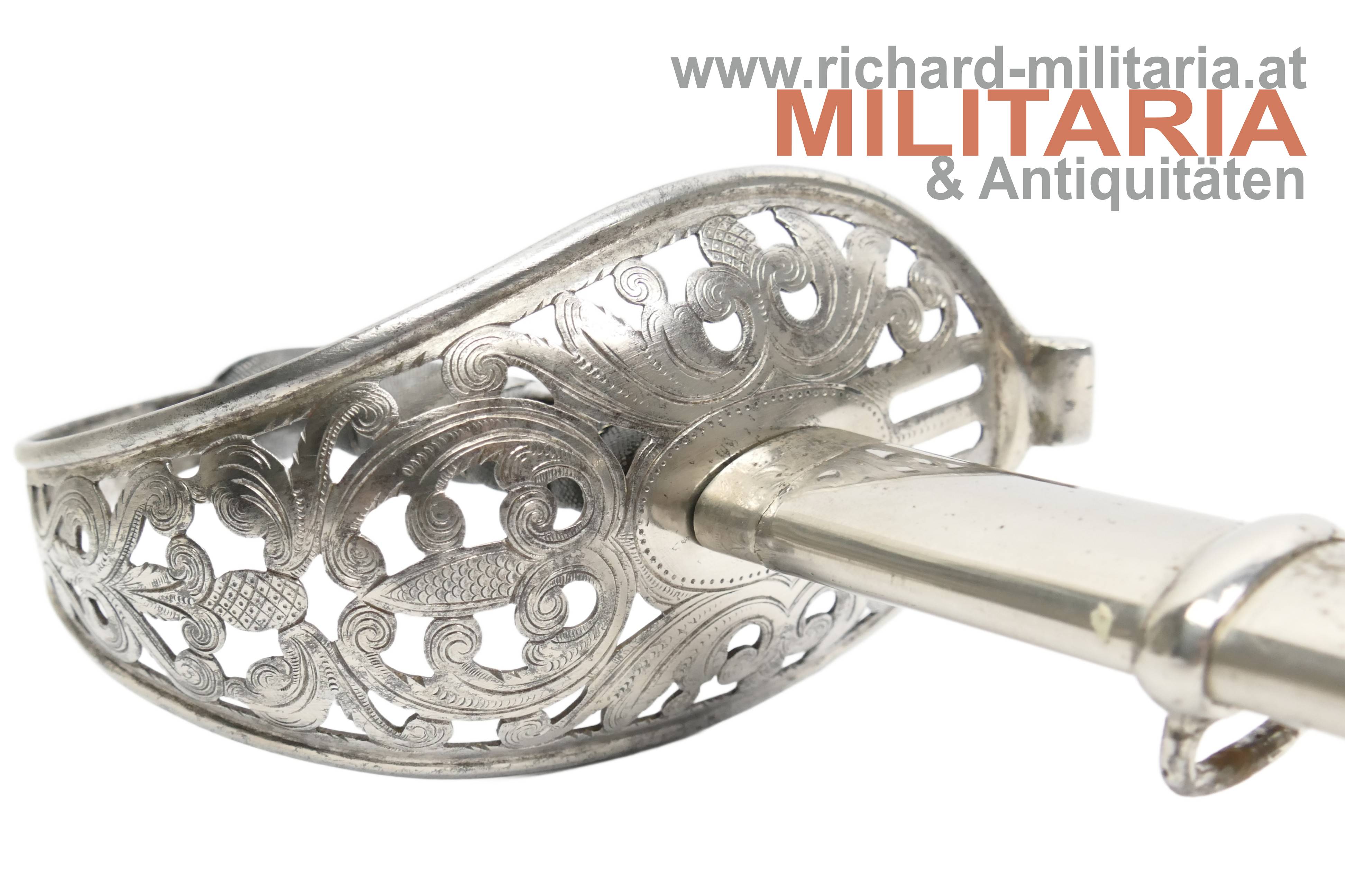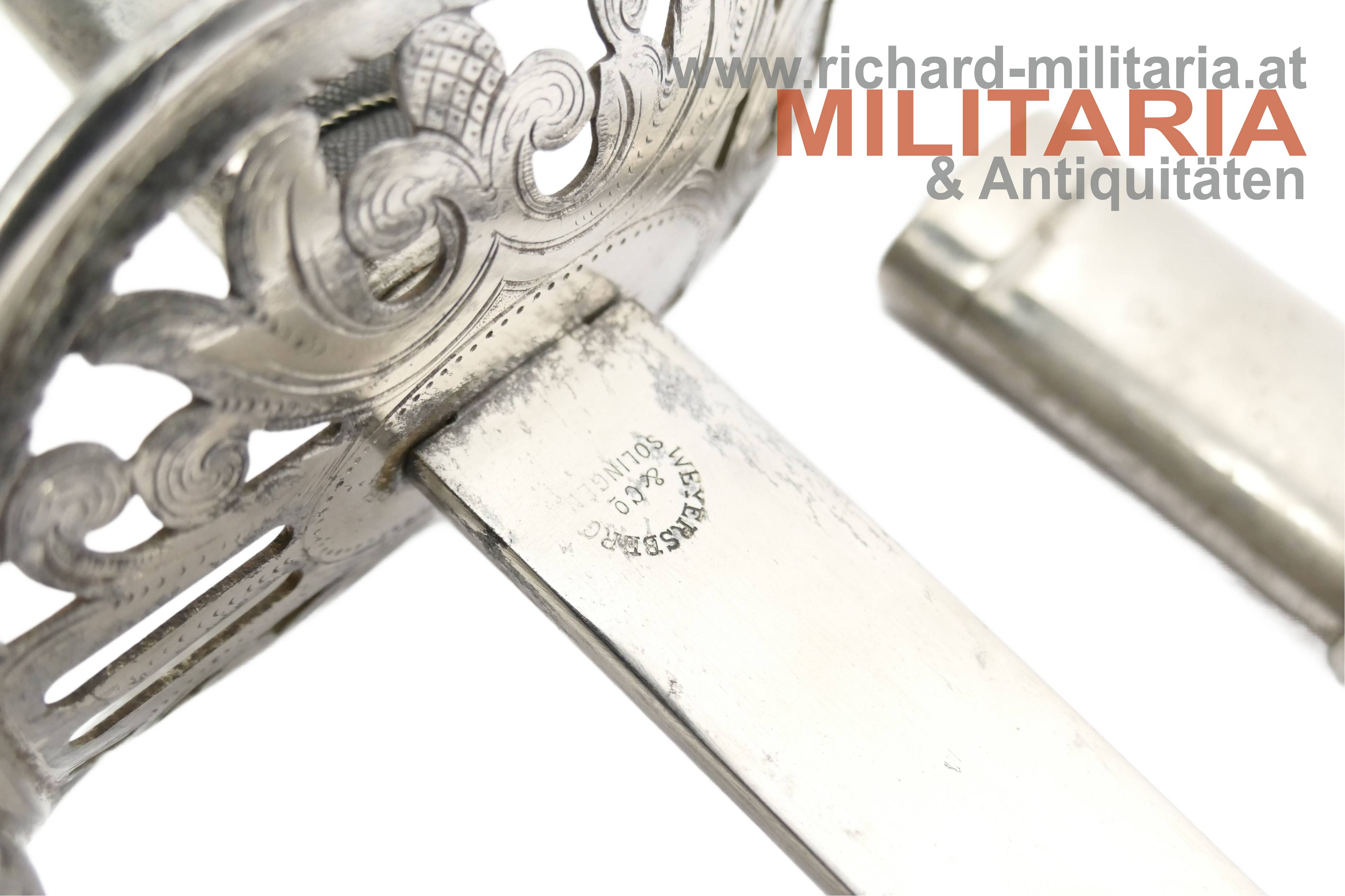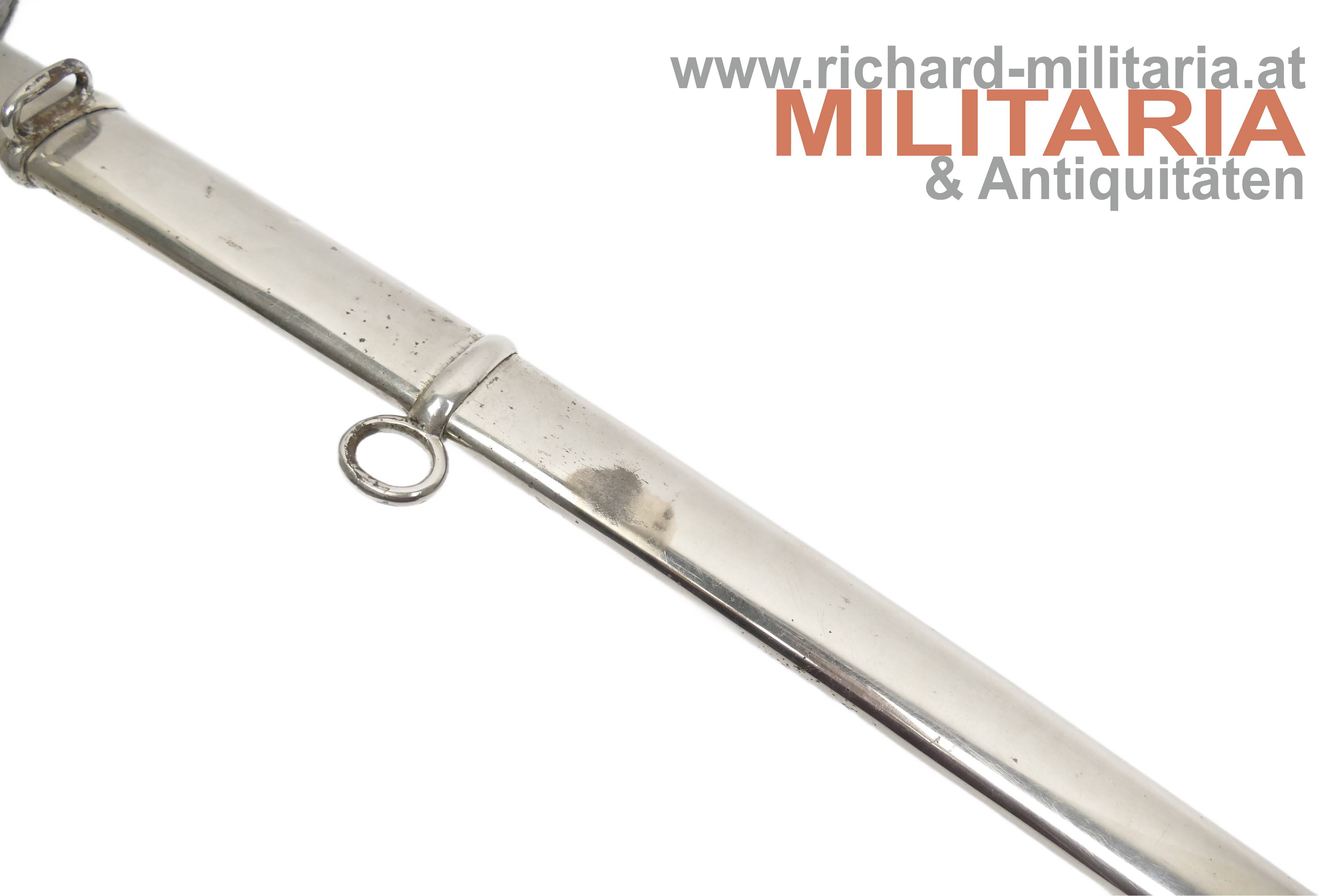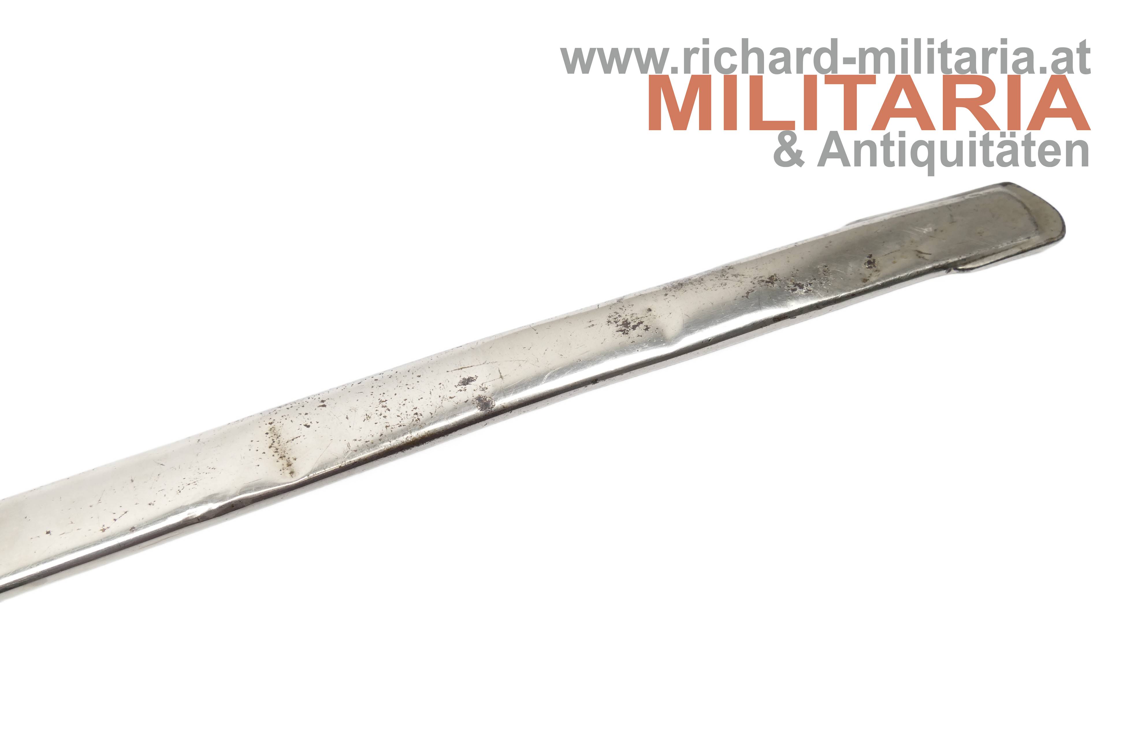 k.u.k. Kavallerie-Offizierssäbel M1869; vernickelte einseitig gekehlte Klinge in guter Erhaltung; auf der Fehlschärfe "Officiers-Verein Kolowratring Wien"; auf der nicht gekehlten Seite "Weyersberg & Co Solingen"; durchbrochener floral verzierter Korb; Korb und Griffeinfassung etwas fleckig; Griff aus Fischhaut mit einfacher gedrillter Silberdrahtwicklung; zugehörige vernickelte Scheide - leicht flugrsotig und im unteren Bereich mit Dellen;