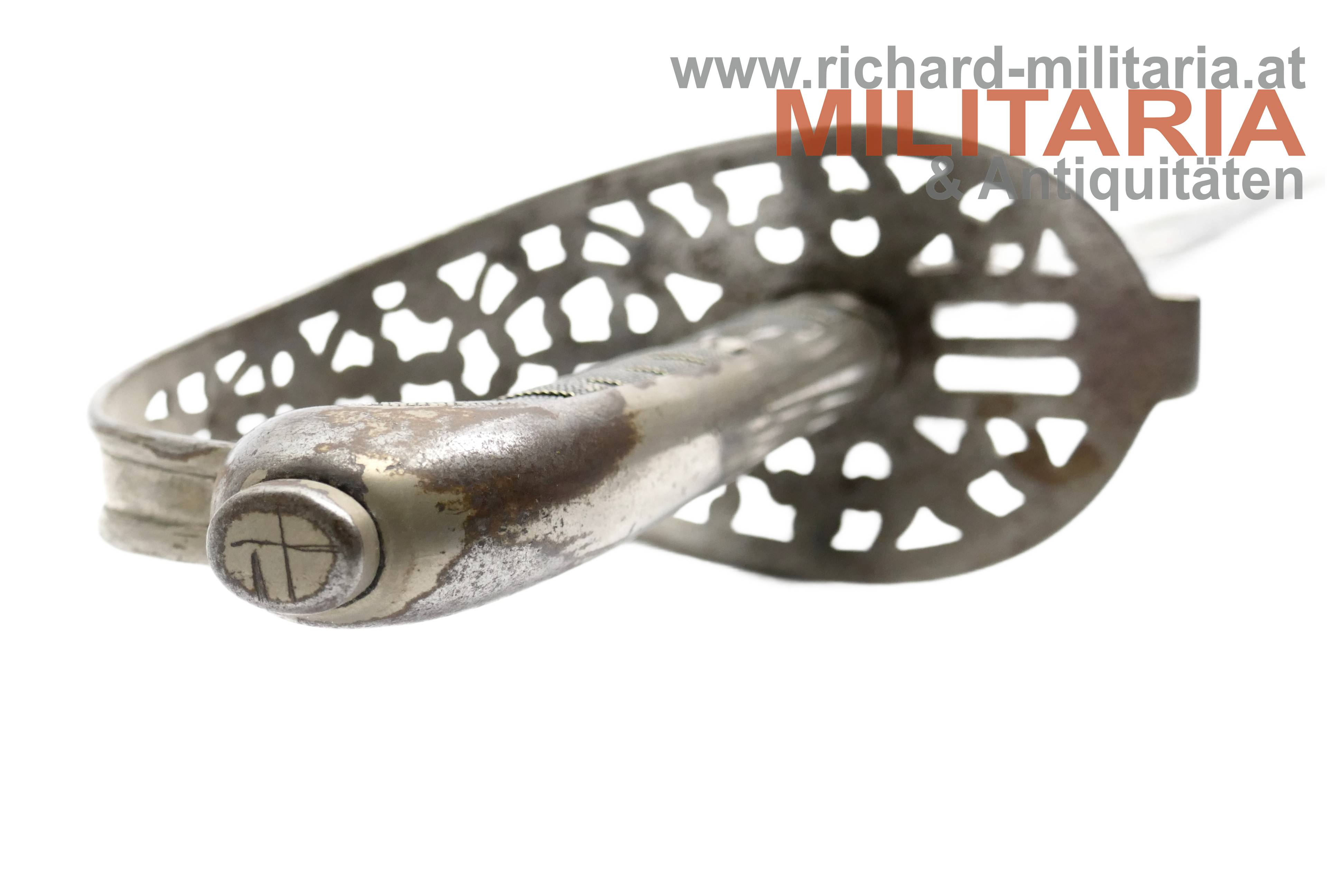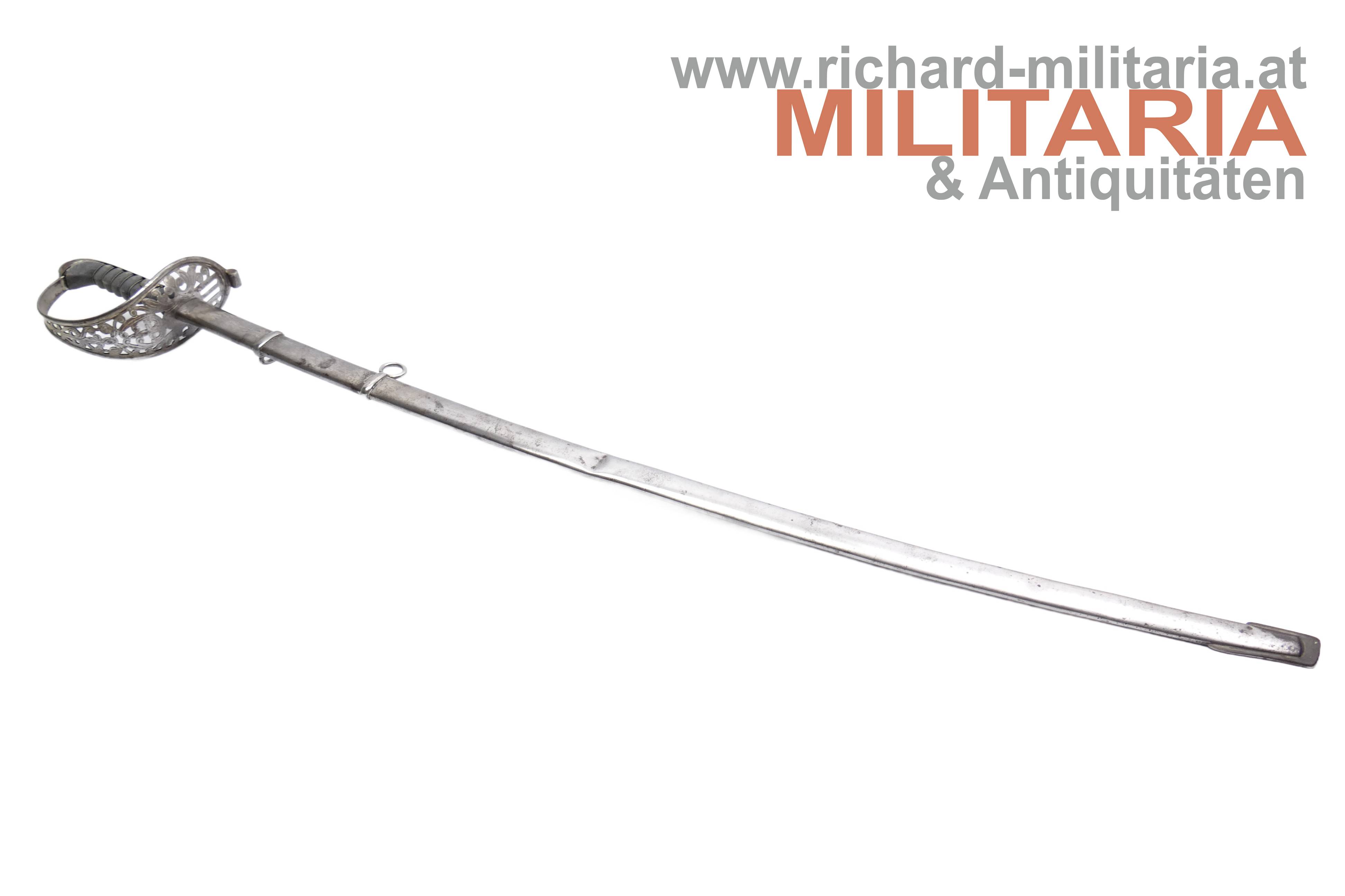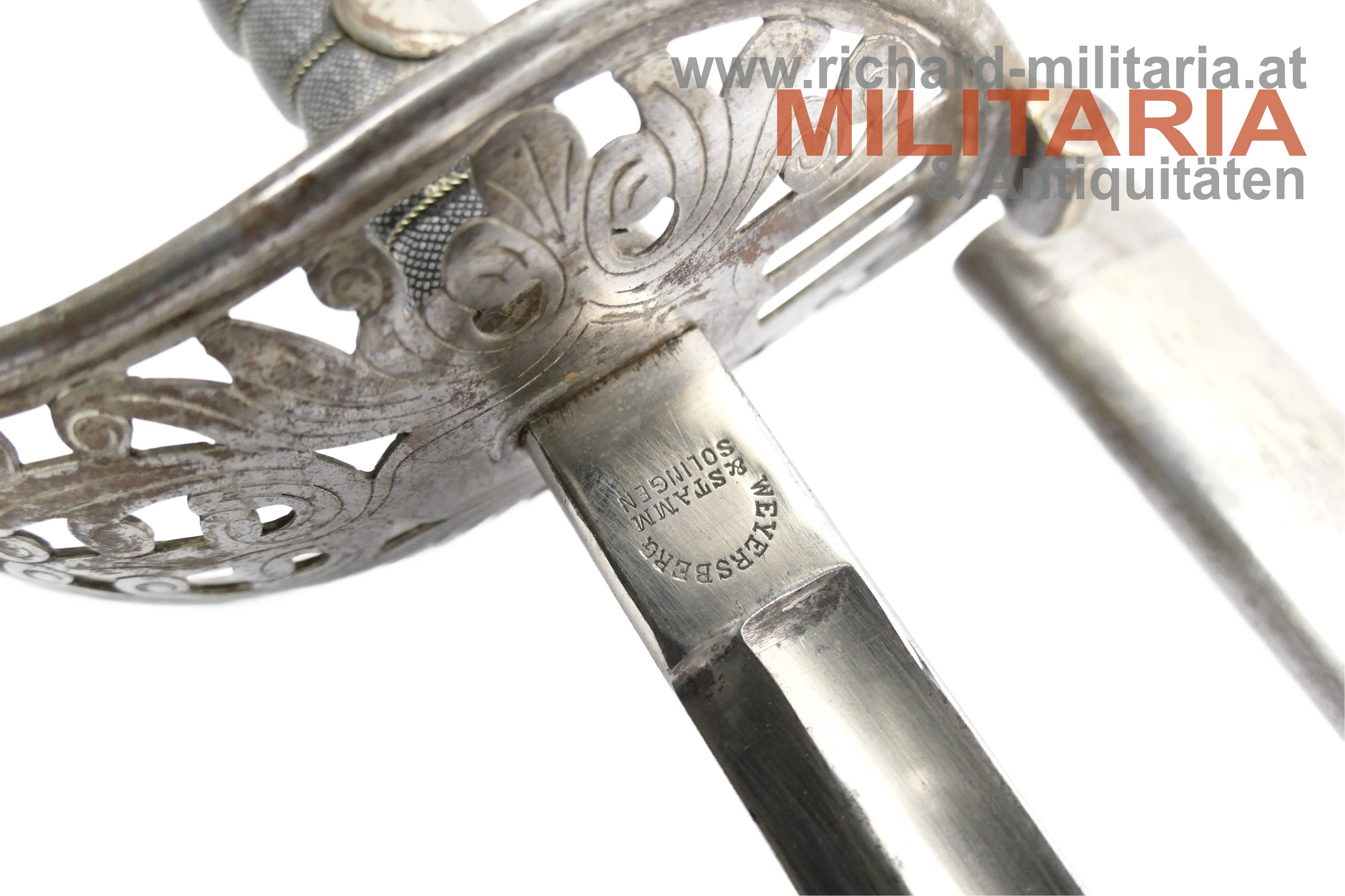 k.u.k. Kavallerie-Offizierssäbel M1869; schmale, einseitig gekehlte und vernickelte Klinge; auf der Fehlschärfe "Weyersberg & Stamm Solingen"; durchbrochener floral verzierter Korb; Griff aus Fischhaut mit einfacher gedrillter Silberdrahtwicklung; Griffeinfassung und Korb teilweise flugrostig; Scheide mit mehreren Dellen und etwas flugrostig;