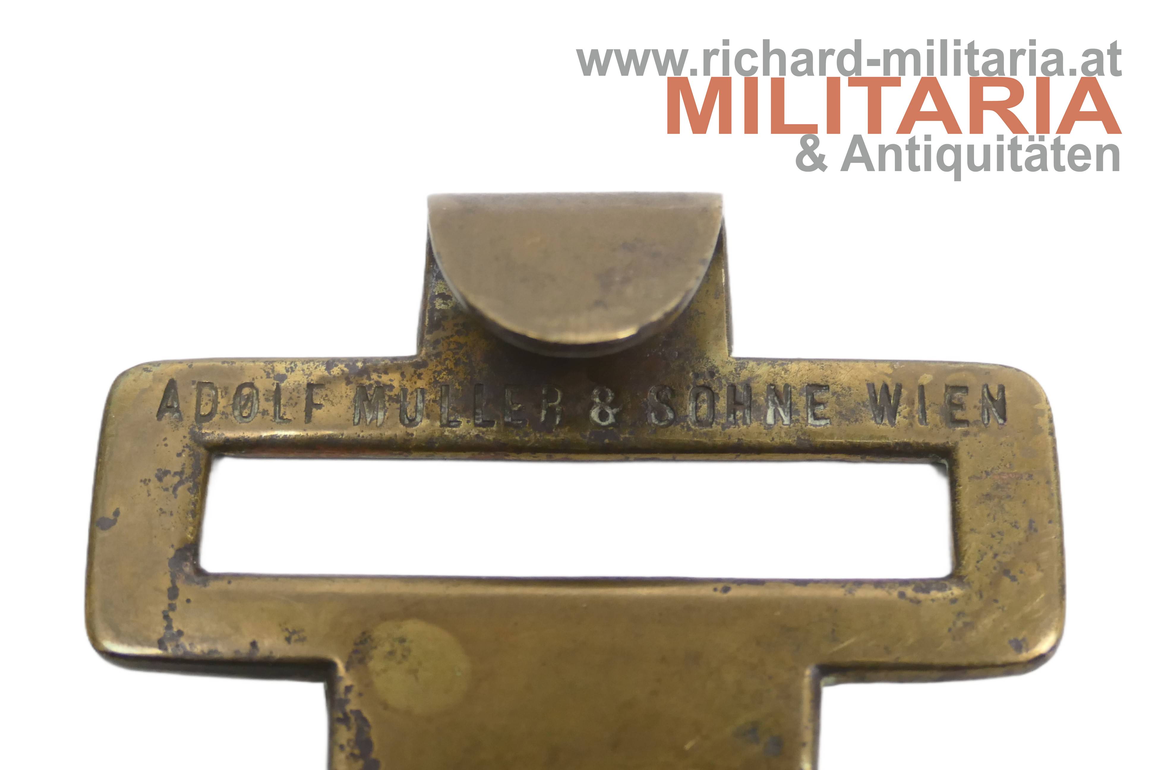 Koppelschloss für Mannschaften und Unteroffiziere der k.u.k. Armee aus dem 1. Weltkrieg MIT ORIGINALEM GEGENHAKEN, Gegenhaken mit Hersteller "Adolf Müller & Söhne Wien"; Messing durchgeprägt und mit Resten der Vergoldung;
