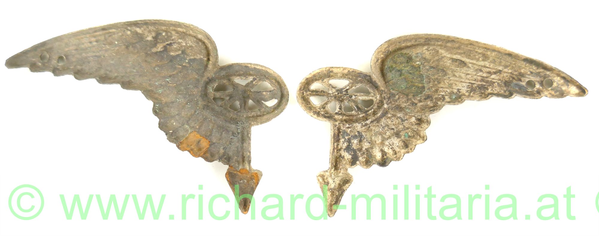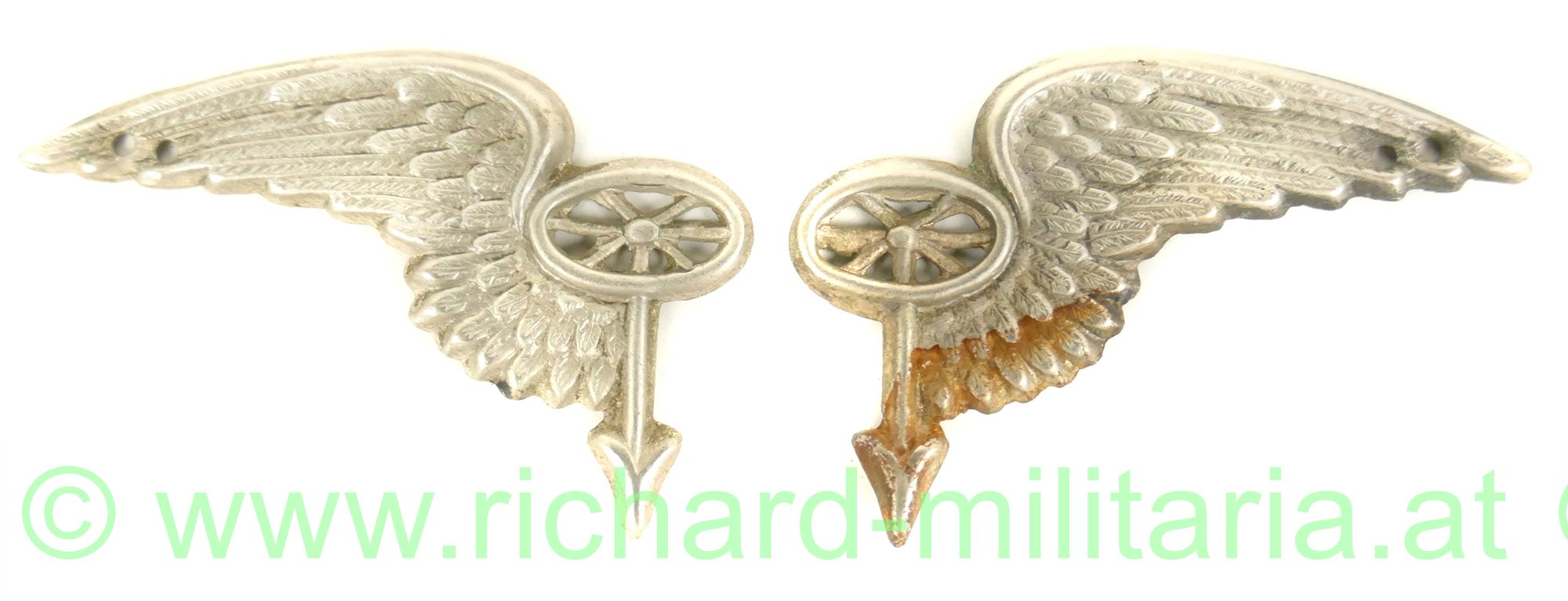 Paar zusammengehörige Kragenspiegelauflagen für Mannschaften und UO der k.u.k. Kraftfahrtruppe, Tombak versilbert, zum Aufnähen; große Form mit 47,2 mm Breite;