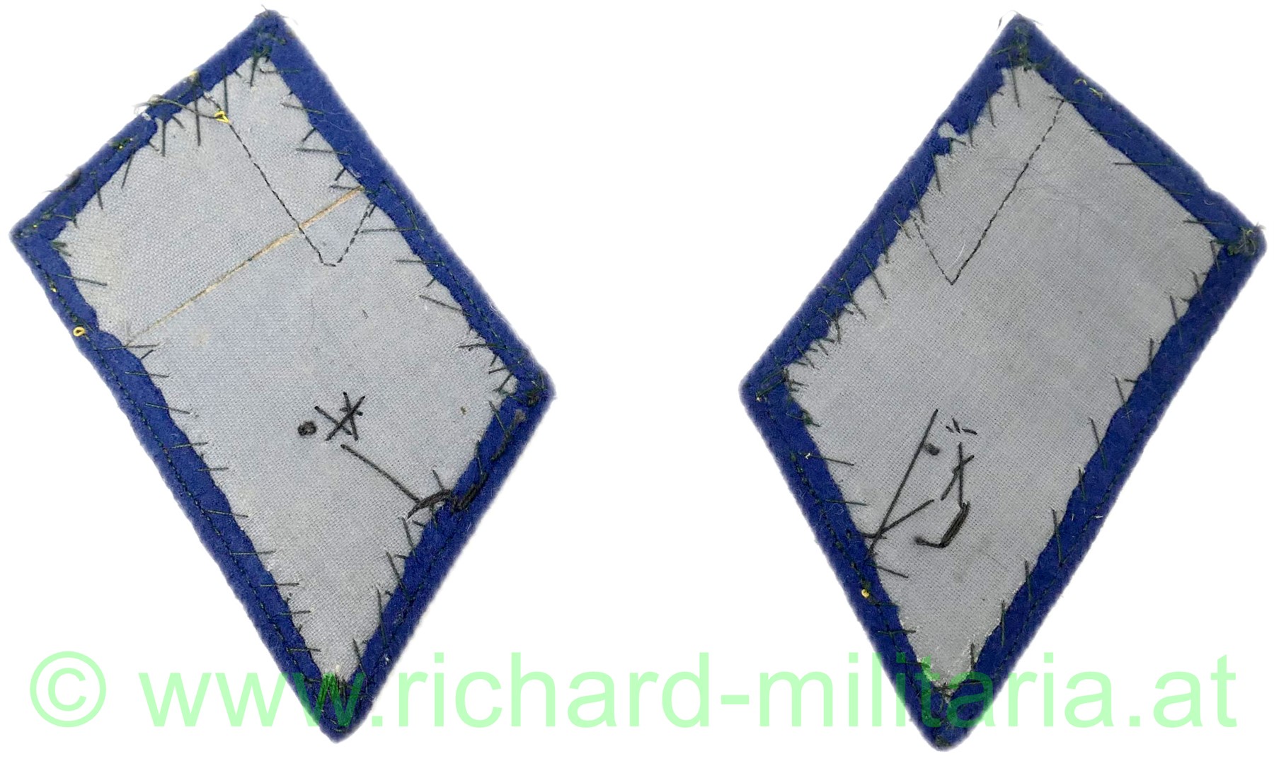 Paar zusammengehörige Kragenspiegel für einen Militärbeamten der VIII. Rangklasse (Major), für den Distinktionssterne normiert waren (z.B. Militärzahlmeister, Artilleriezeugsverwalter, Militär-Baurechnungsrat, Militärmedikamentenverwalter, etc.); himmelblaue Waffenfarbe mit goldener Borte für Militärbeamte, für die Distinktionssterne normiert waren und je 1 silberner Offiziersstern;
