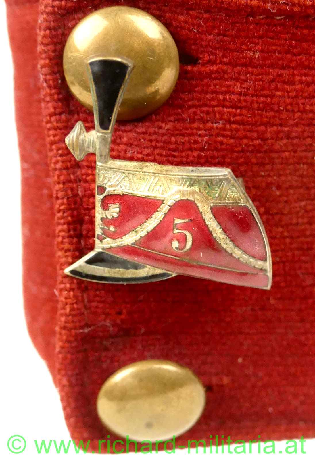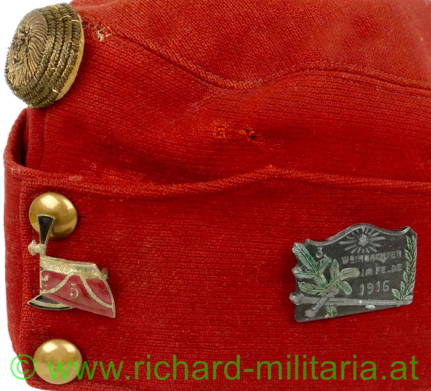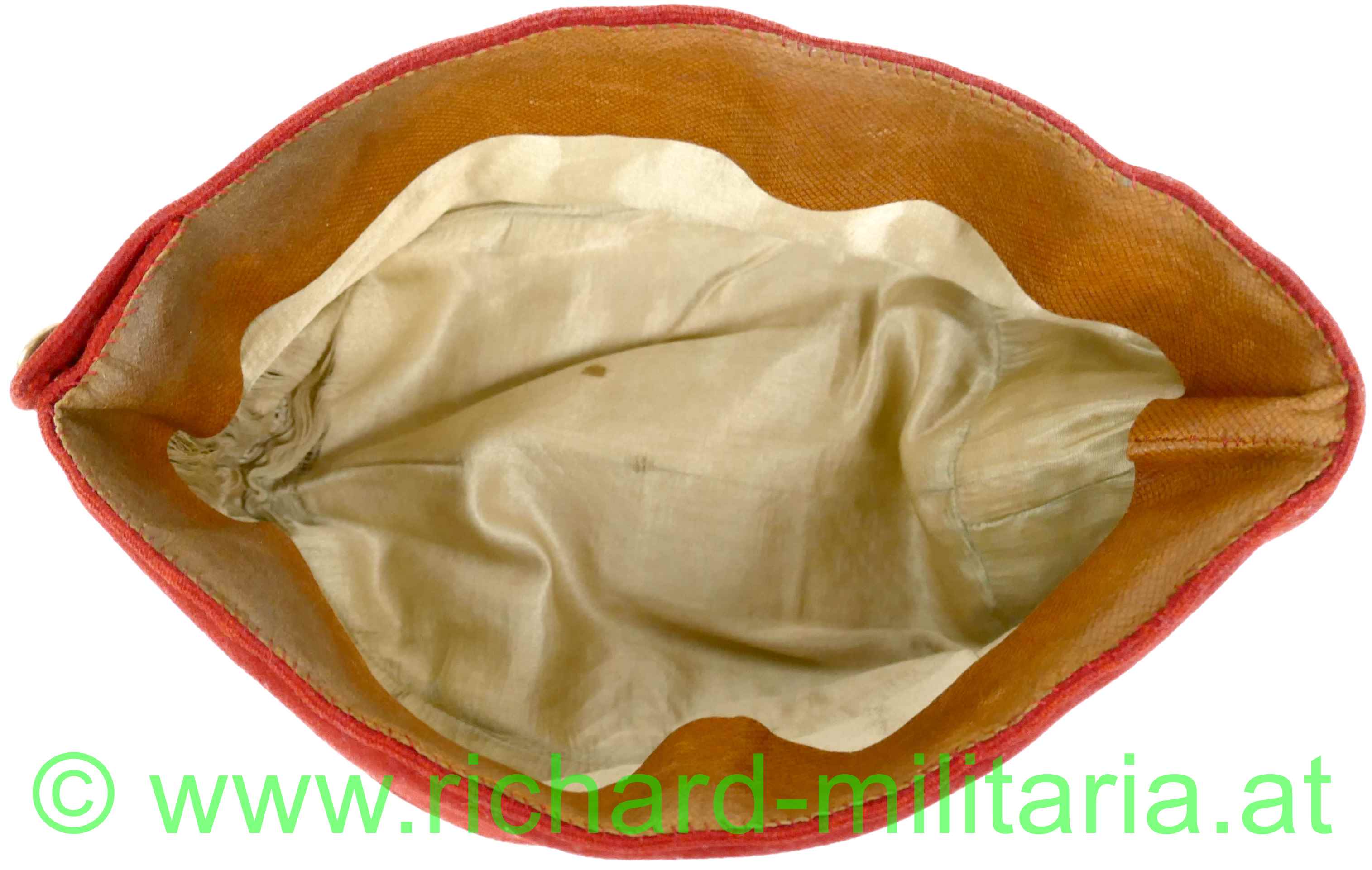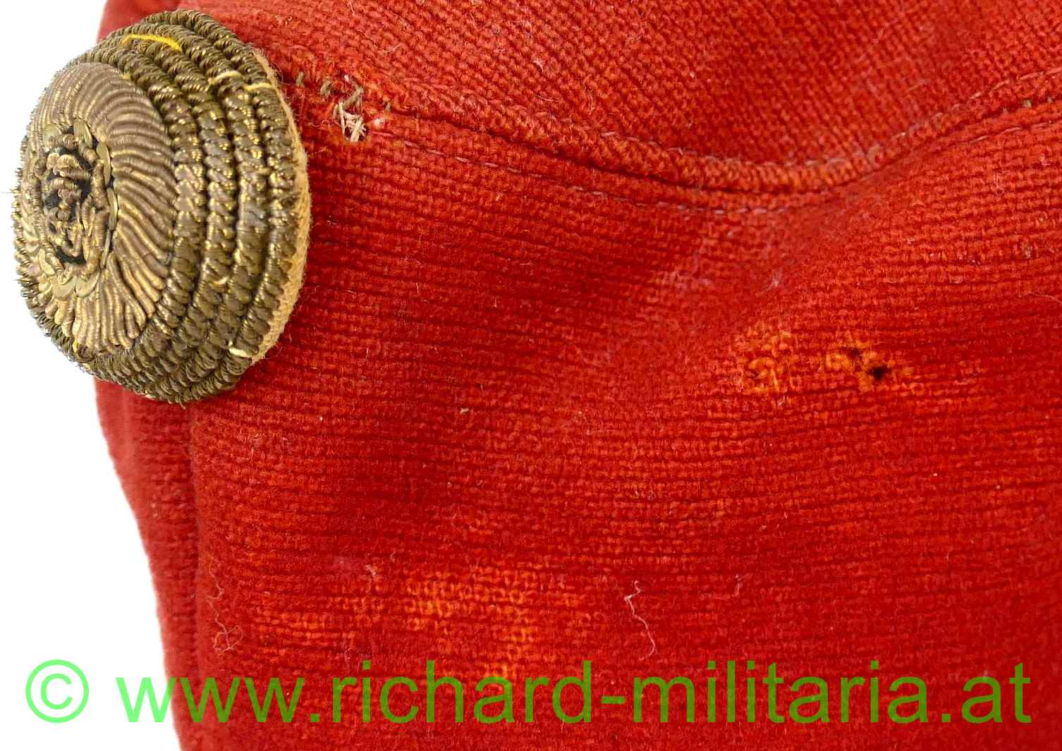 k.u.k. krapprote schirmlose Kavalleriekappe für Offiziere, krapprotes feines Tuch mit Metallfaden gestickter Kokarde "FJ1"; vorne 2 goldene Knöpfe; innen mit beigem Seidenfutter ausgeschlagen; braunes weiches und verziertes Schweißleder; 2 sichtbare kleine Mottenlöcher; auf der linken Seite 2 angebrachte Kappenabzeichen: 5er Husaren u. Weihnachten im Felde 1916 (beide in sehr gutem Zustand!);
