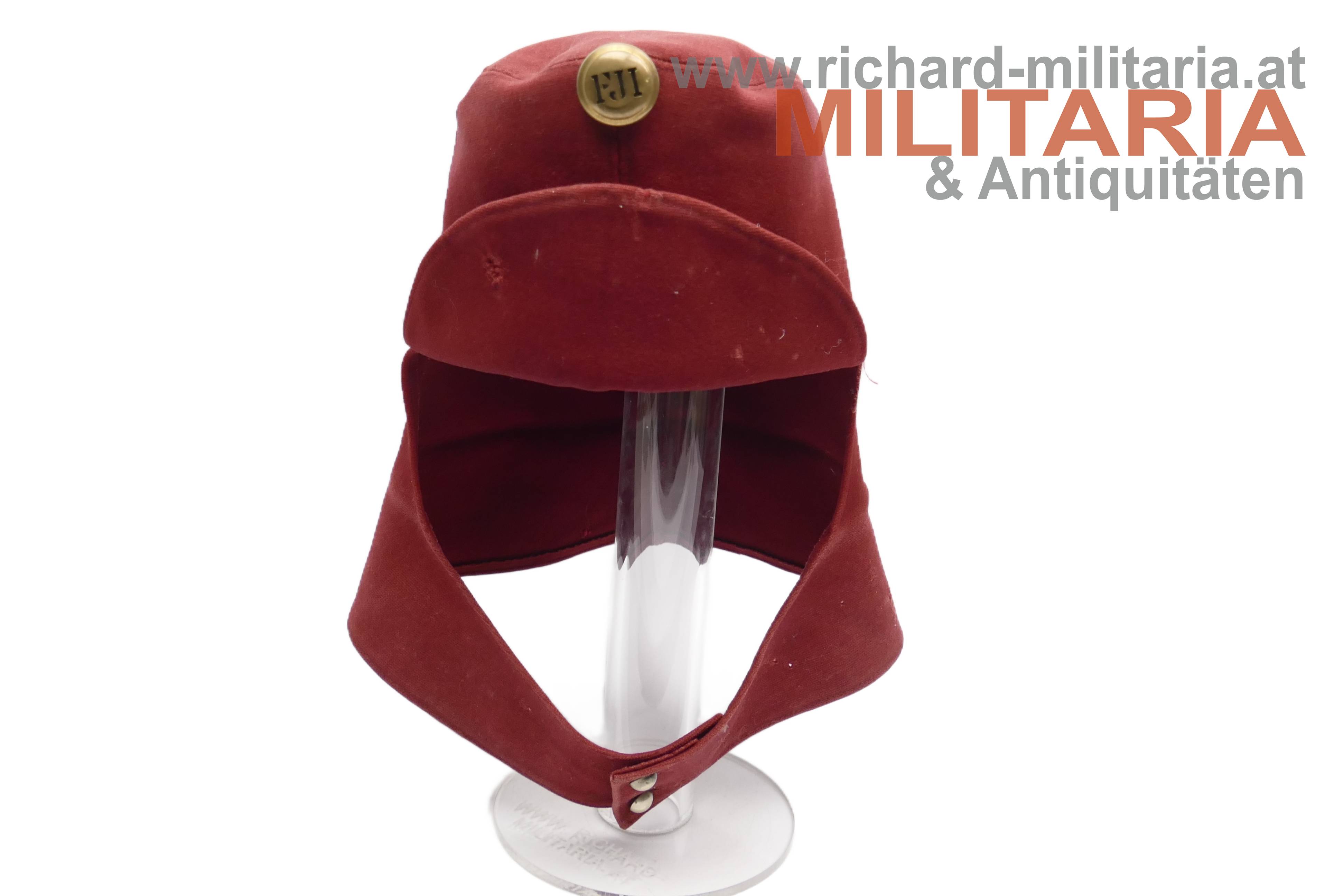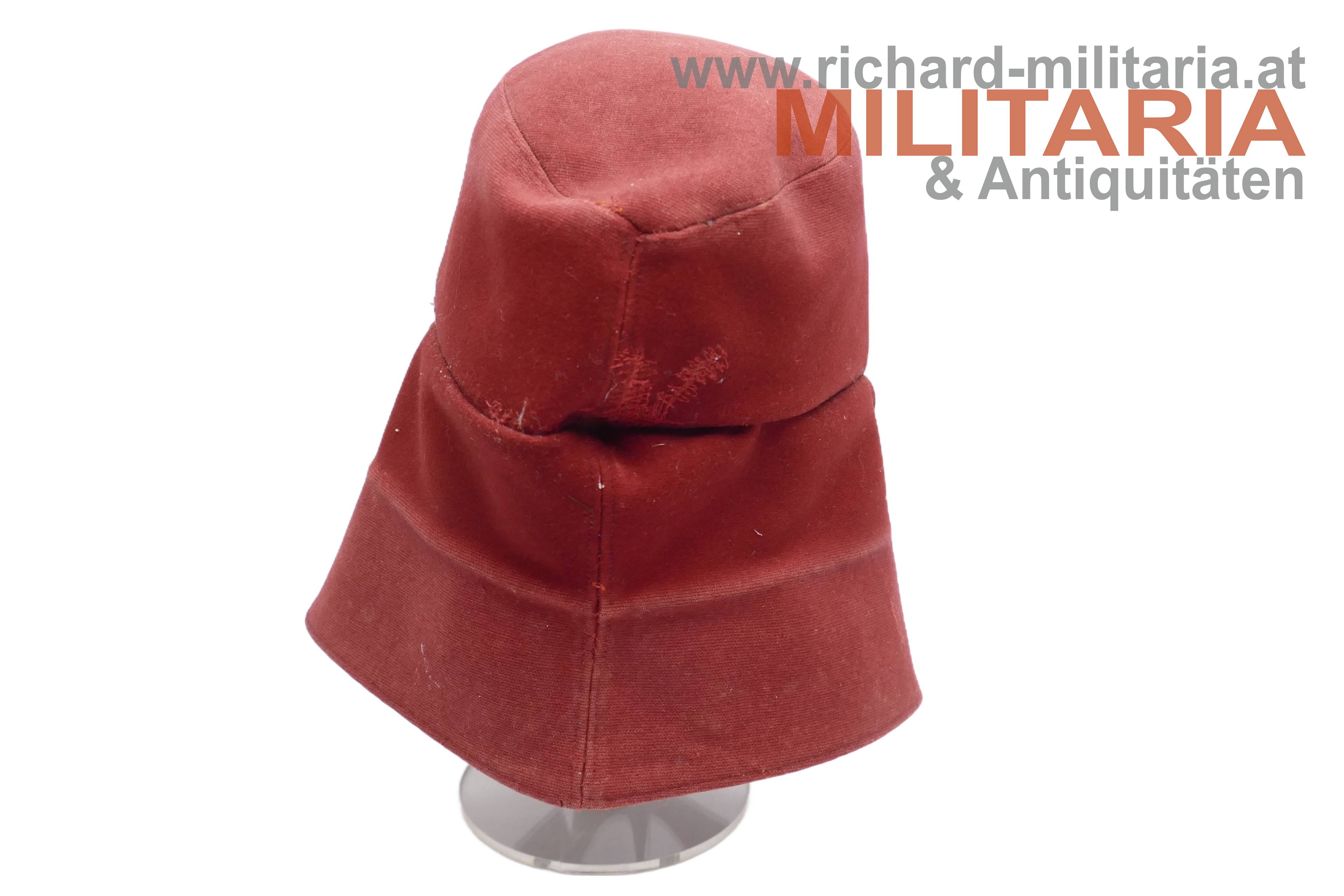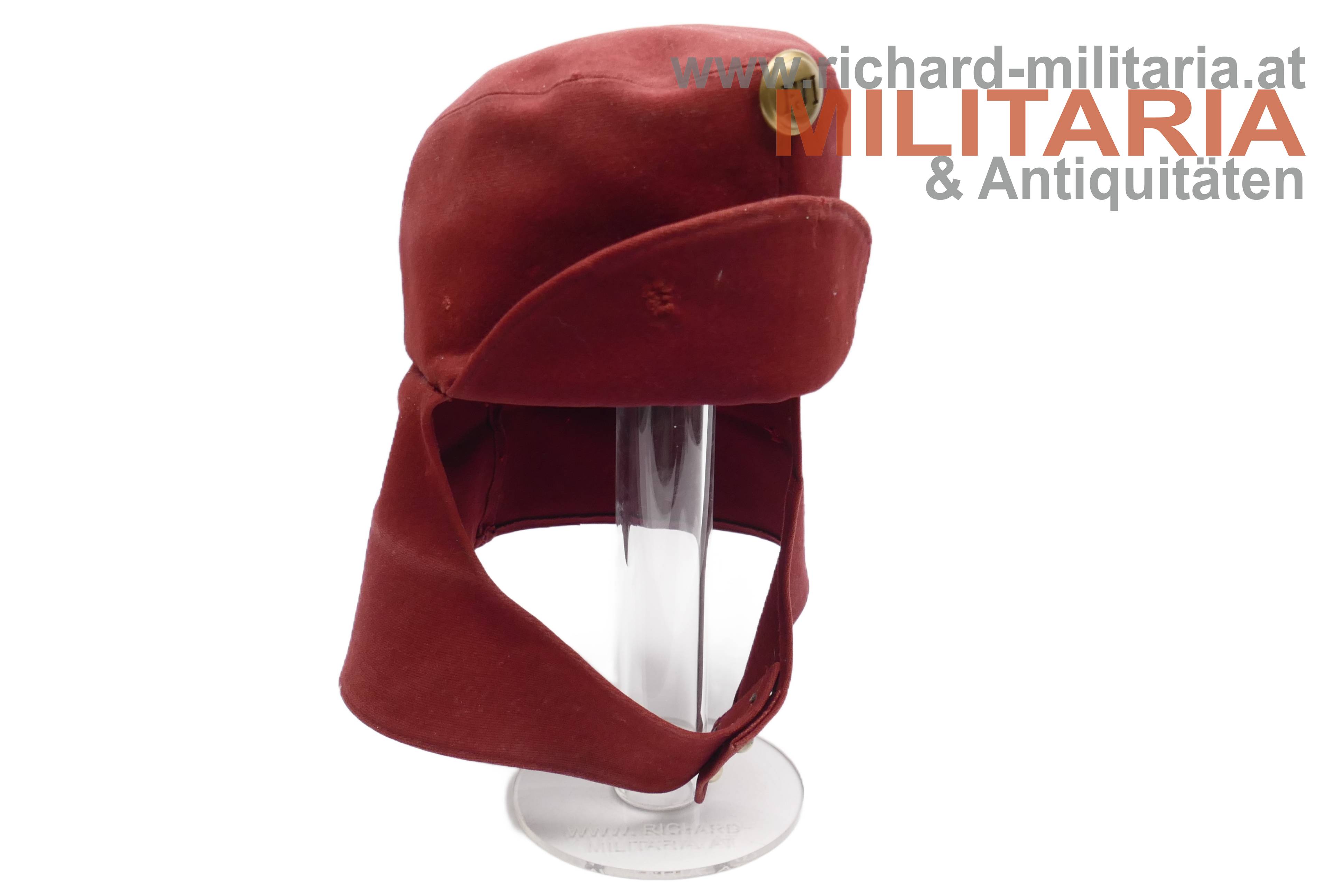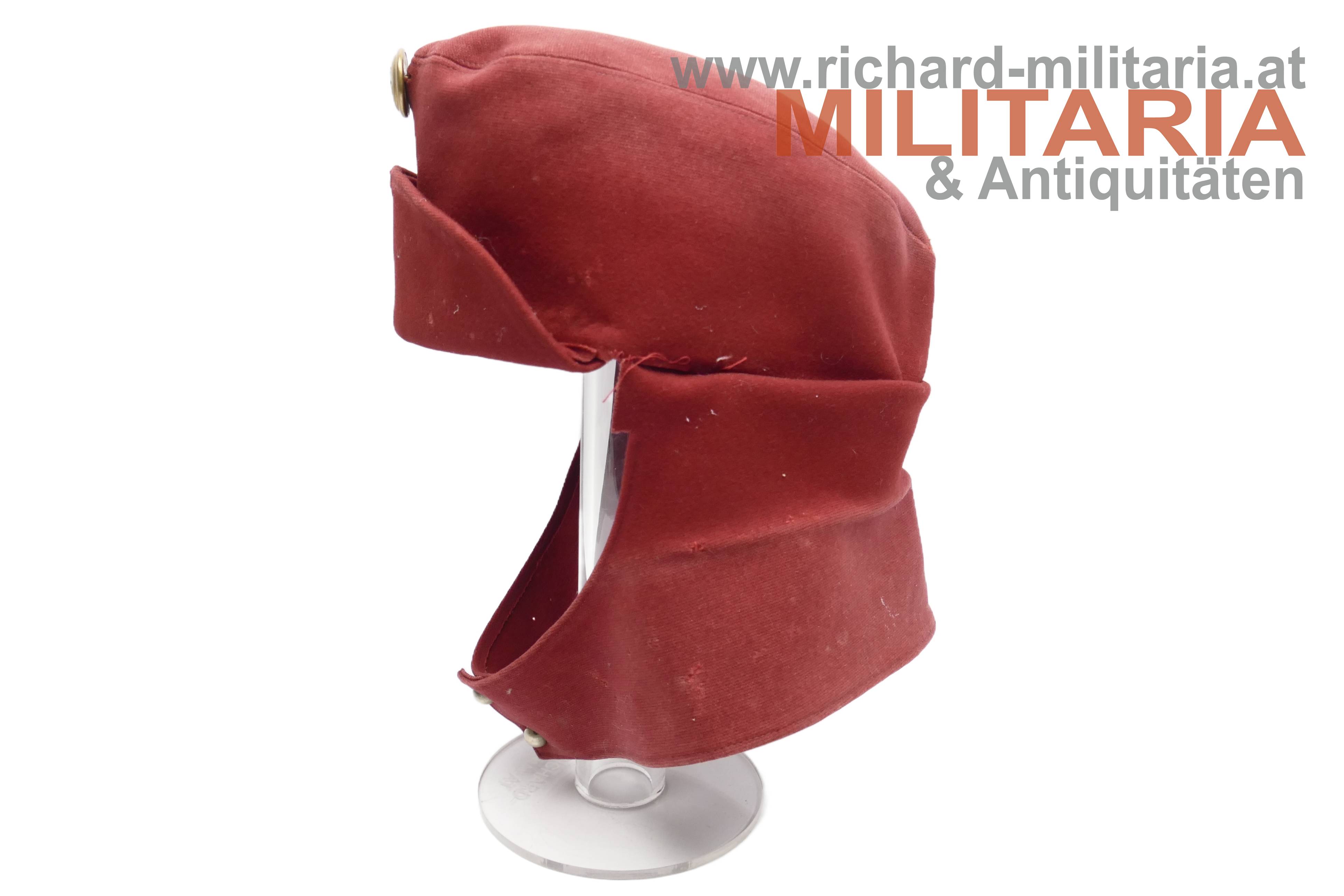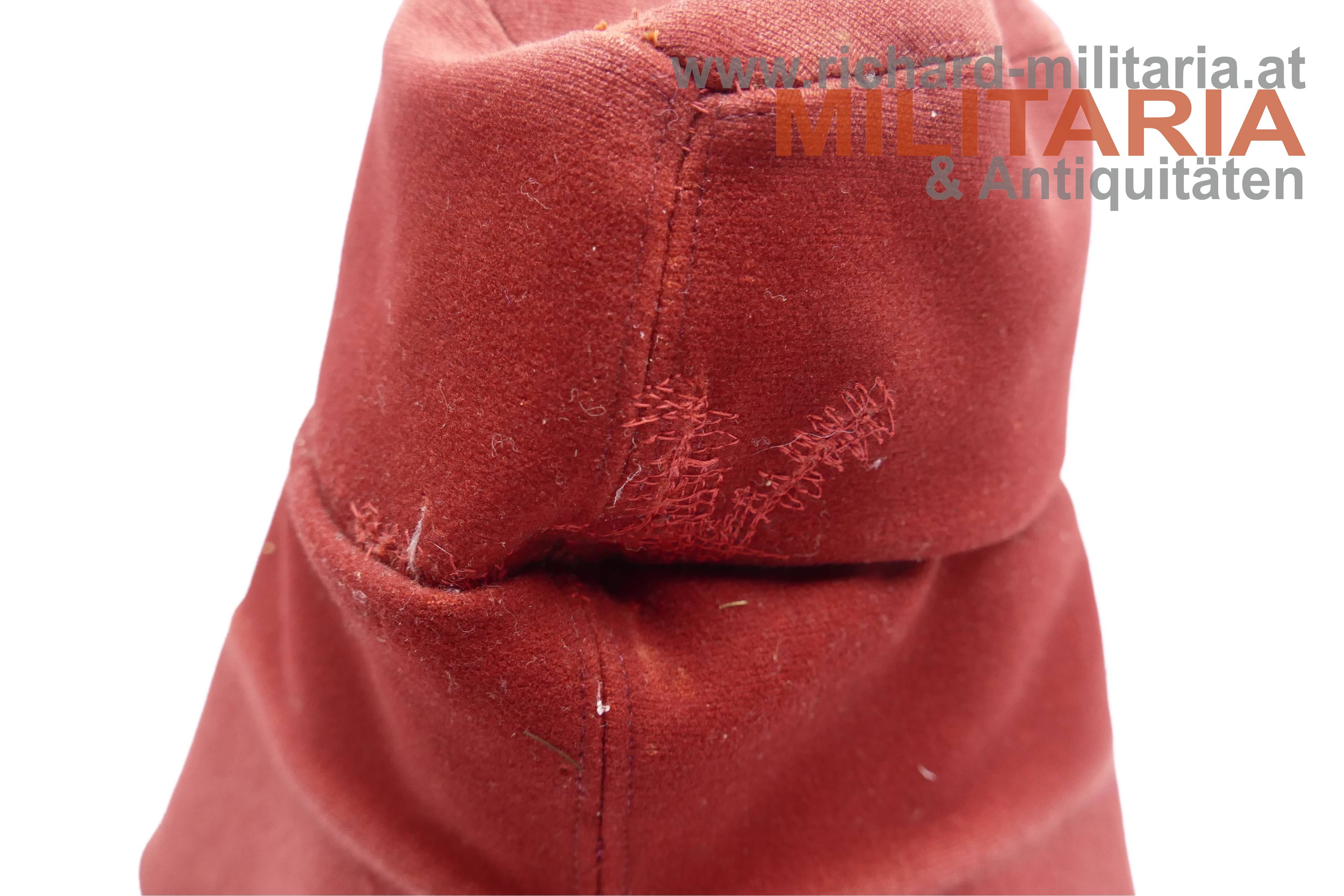 k.u.k. krapprote schirmlose Lagerkappe für Ulanen - Mannschaft; krapproter Tuchstoff; doppelt gelegter herunterklappbarer Nackenschutz; unter dem Nackenschutz deutlich erkennbarer Farbunterschied; Nackenschutz vorne mittig geschlossen mit zwei silbernen Kompasseln (Ulanan-Regimenter); darüber die Mannschaftskokarde in Ausführung für Kaiser Franz Joseph; innen ohne Stirnleder; kleinere Mottenschäden und ausgebesserte Stellen;