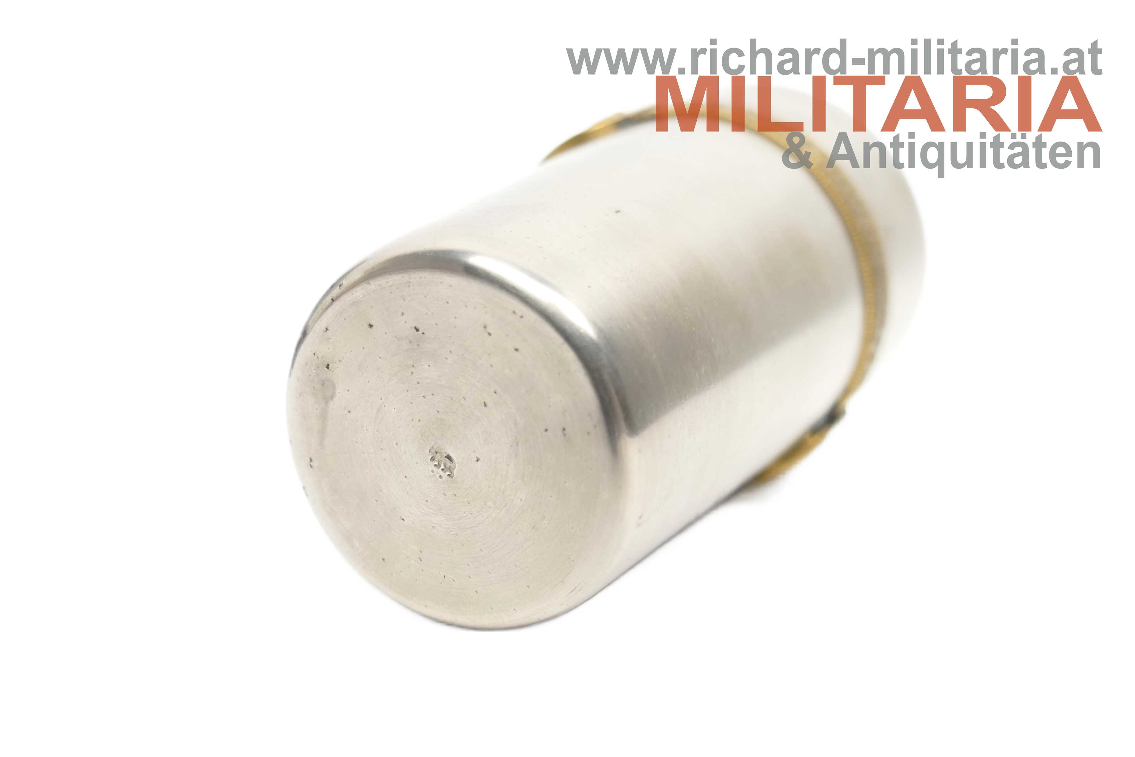 k.u.k. Kriegsbecher - kleine Ausführung - im originalen Geschenketui; Becher aus Eisen gebürstet und mit Messingring; mittig Widmungsgravur "HJ 1914 - 1917"; Berndorfer-Bodenmarke; im originalen Etui - innen mit grünblauer Seide ausgelegt;