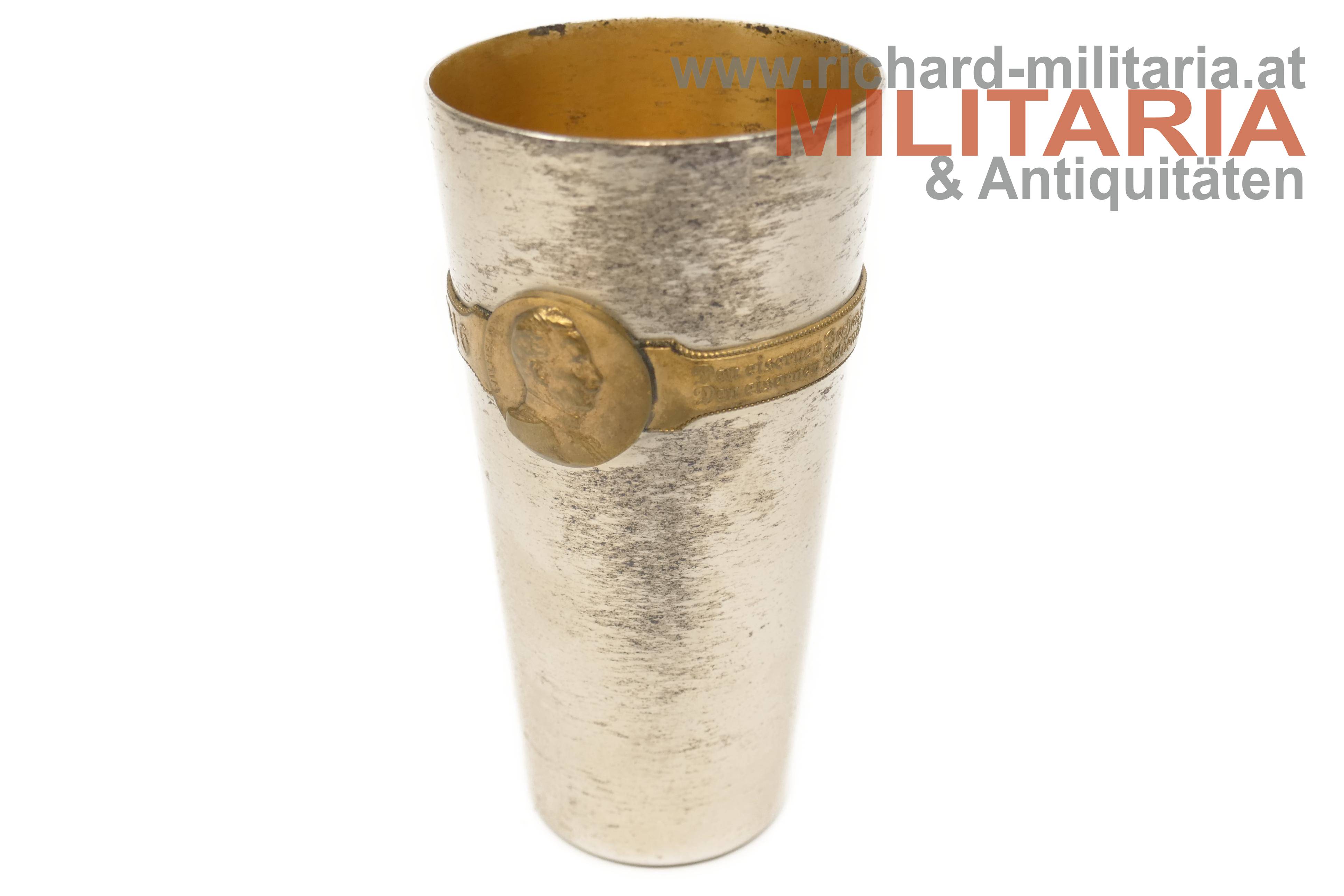 k.u.k. Kriegsfürsorge - großer Kriegsbecher - 1914-1916; Eisen vernickelt mit umlaufenden vergoldeten Spruchband; amtliche Gravur von Kaiser Franz Josef; innen vergoldet; Herstellersymbol vom Hersteller Berndorf am Becherboden; Becher flugrostig;