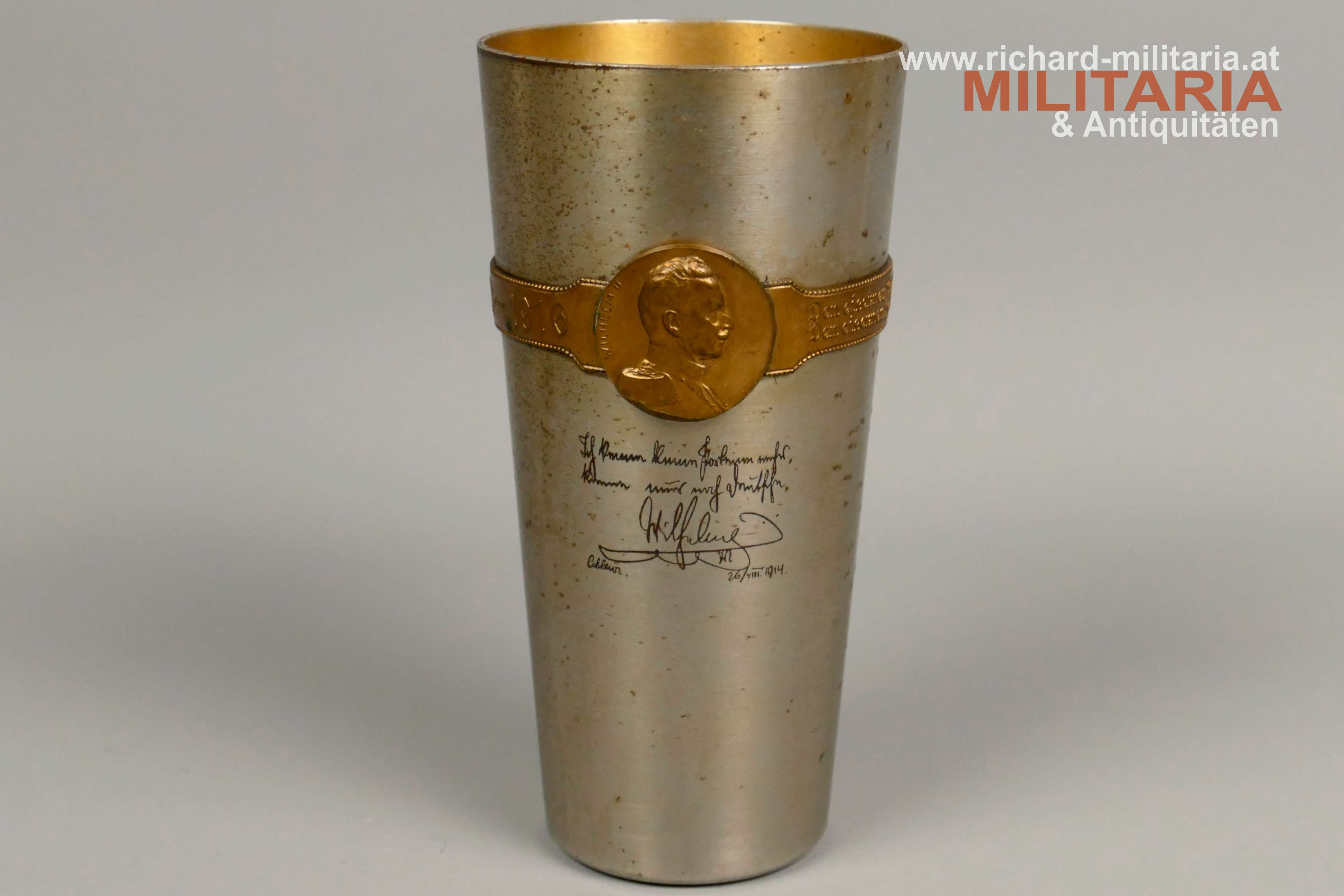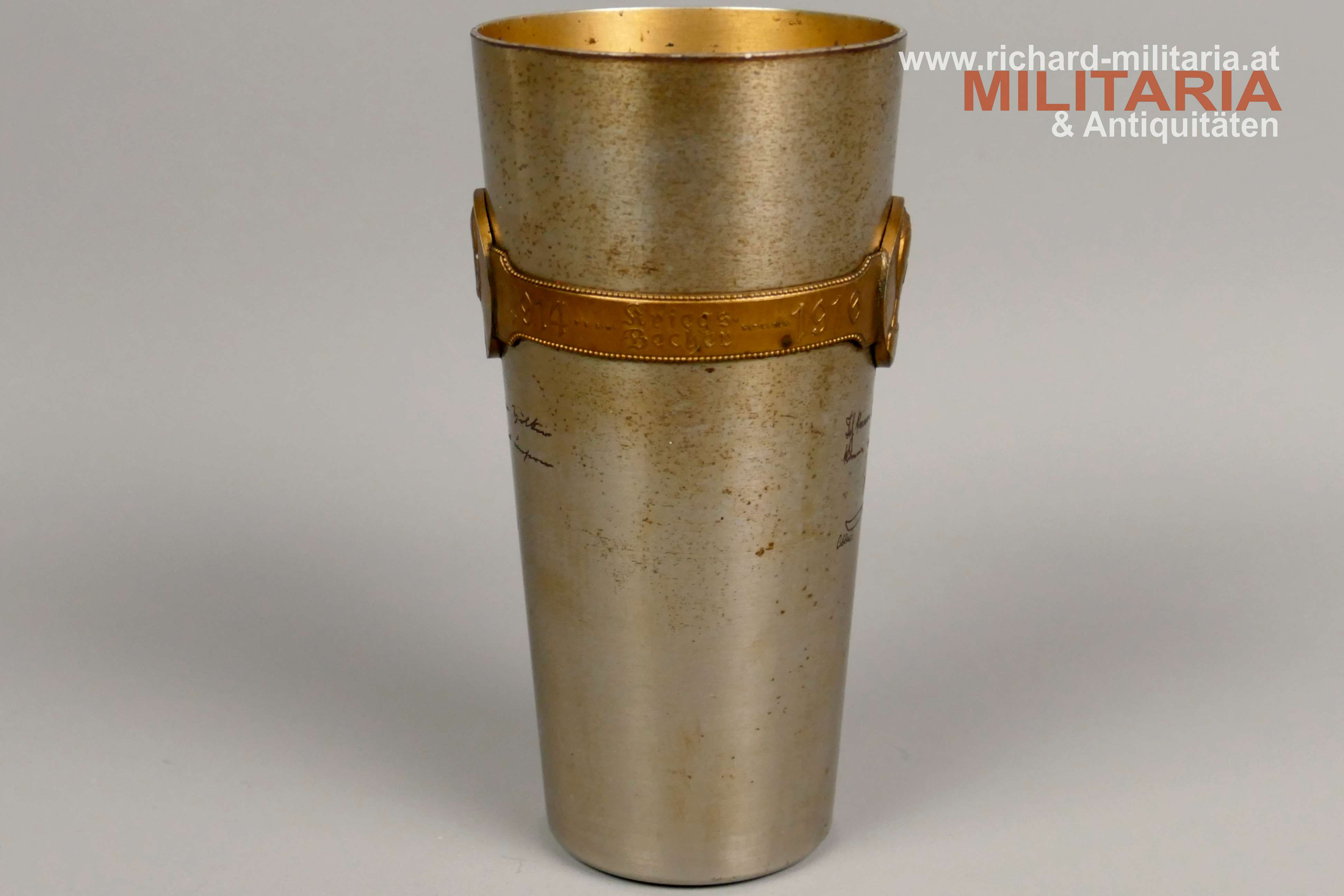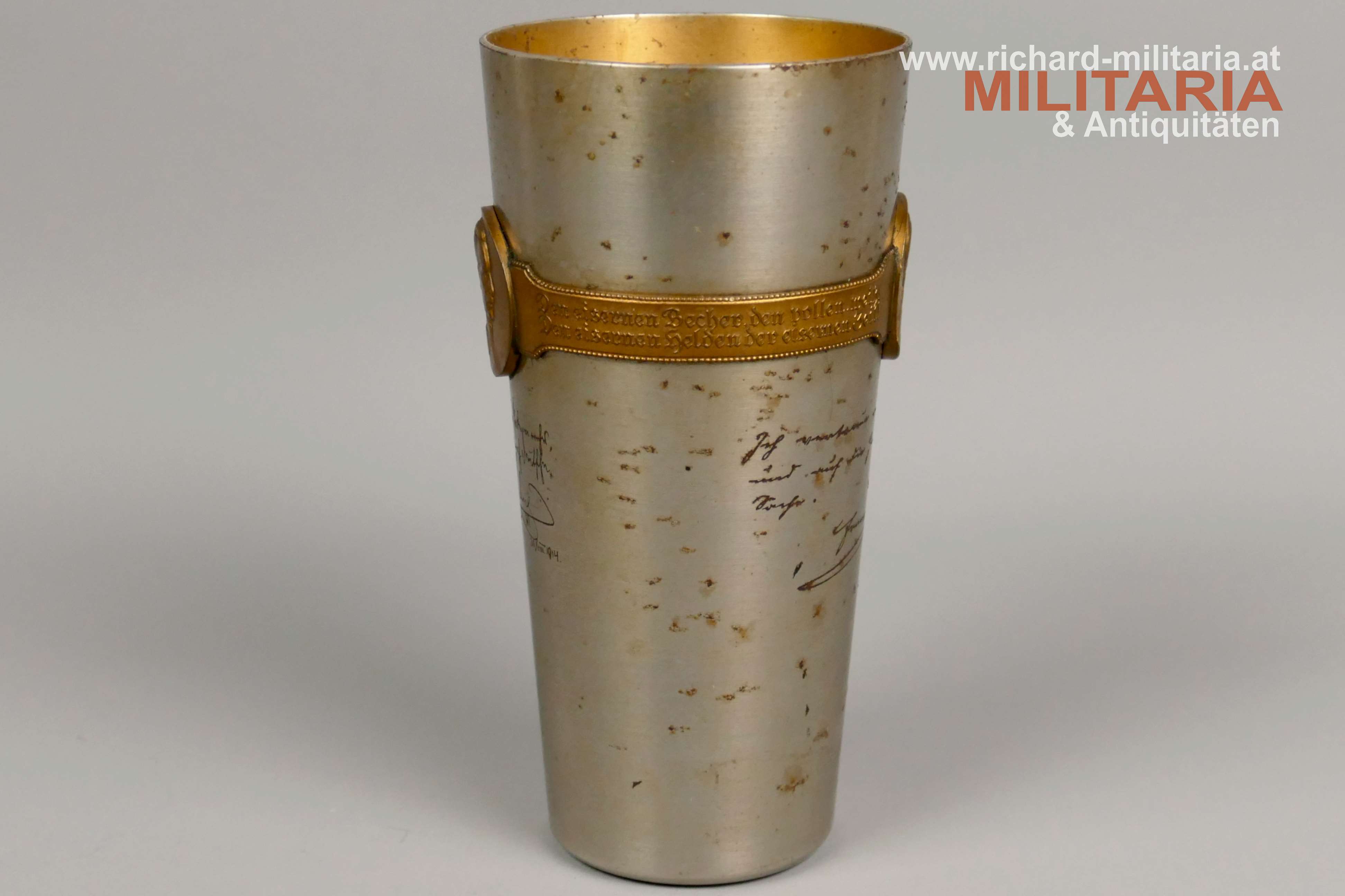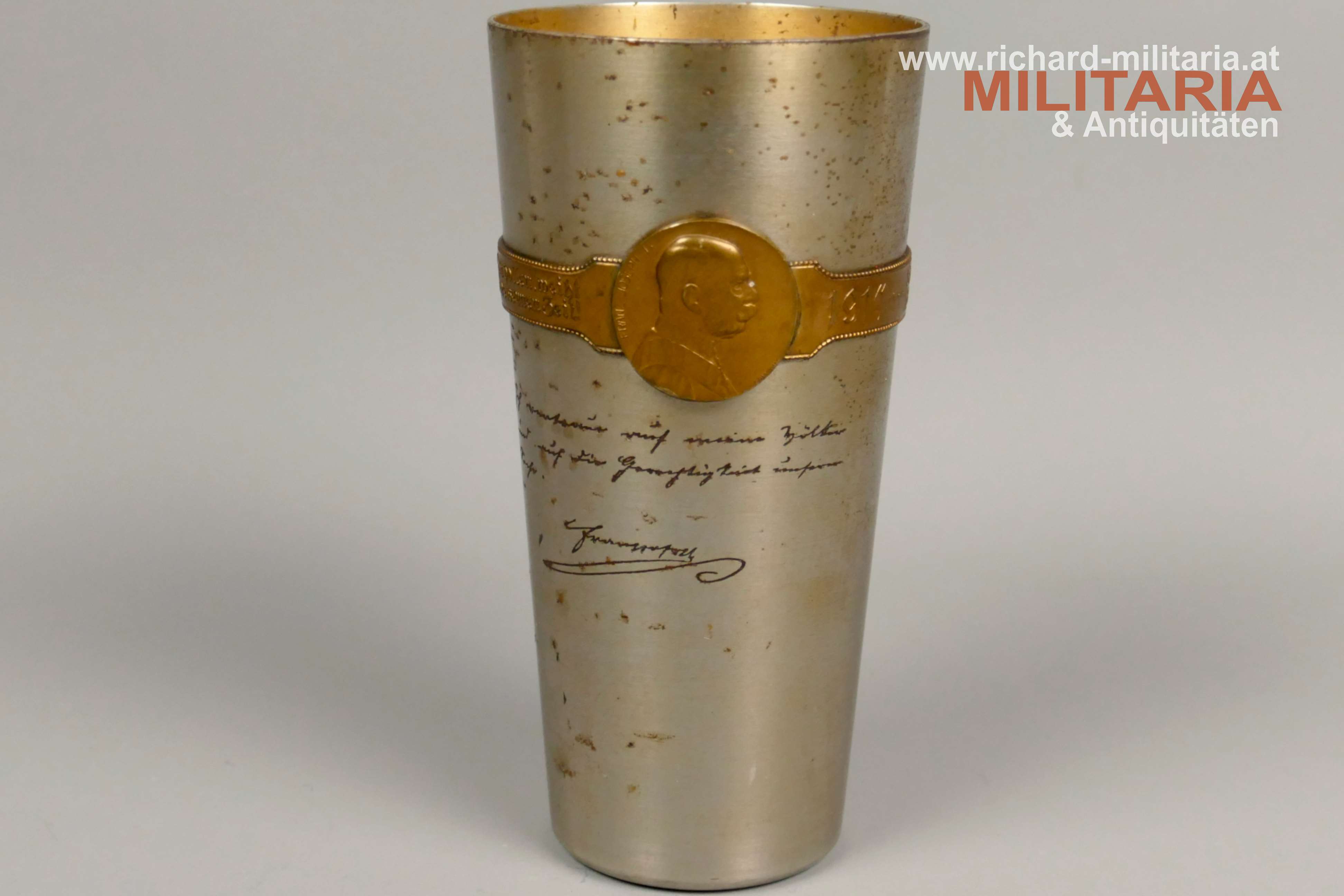 k.u.k. Kriegsfürsorge "Kriegsbecher" - 1914-1916 - amtliche Gravuren; große Variante; Eisen vernickelt - flugrostig; vergoldetes umlaufendes Spruchband (1914-1916) mit Bildnissen von Kaiser Franz Josef I. und Kaiser Wilhelm II.; amtliche Gravuren von Kaiser Franz Josef I. und Kaiser Wilhelm II.; Innenseite vergoldet und flugrostig; Herstellerpunzierung Berndorf am Becherboden;
