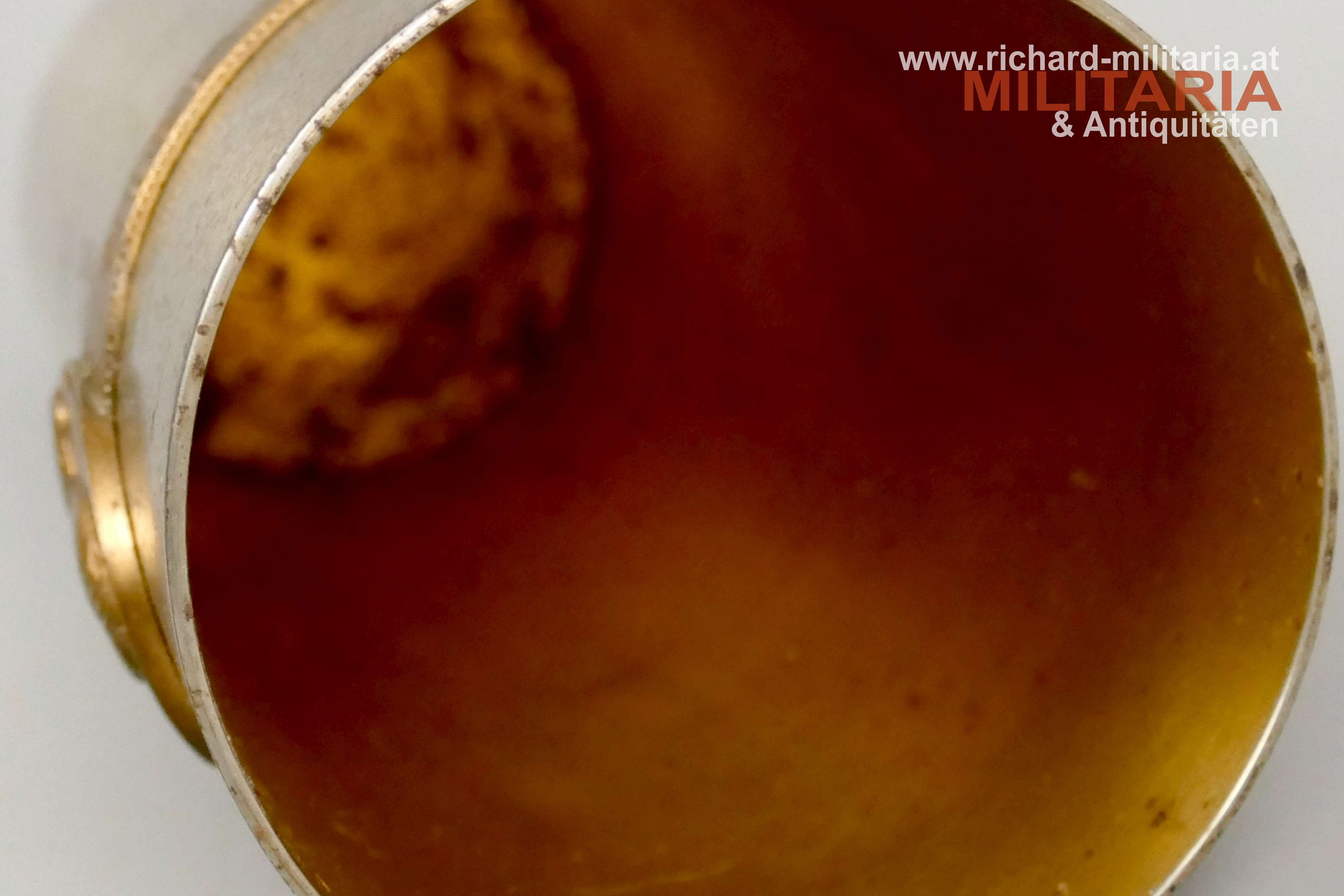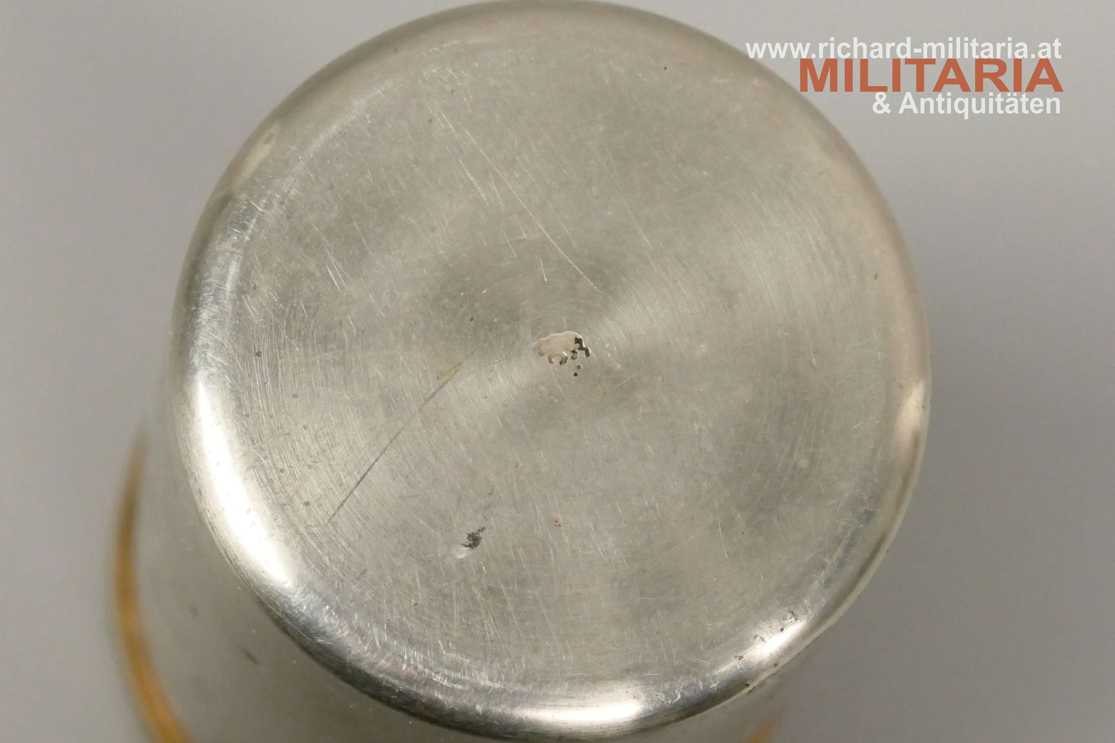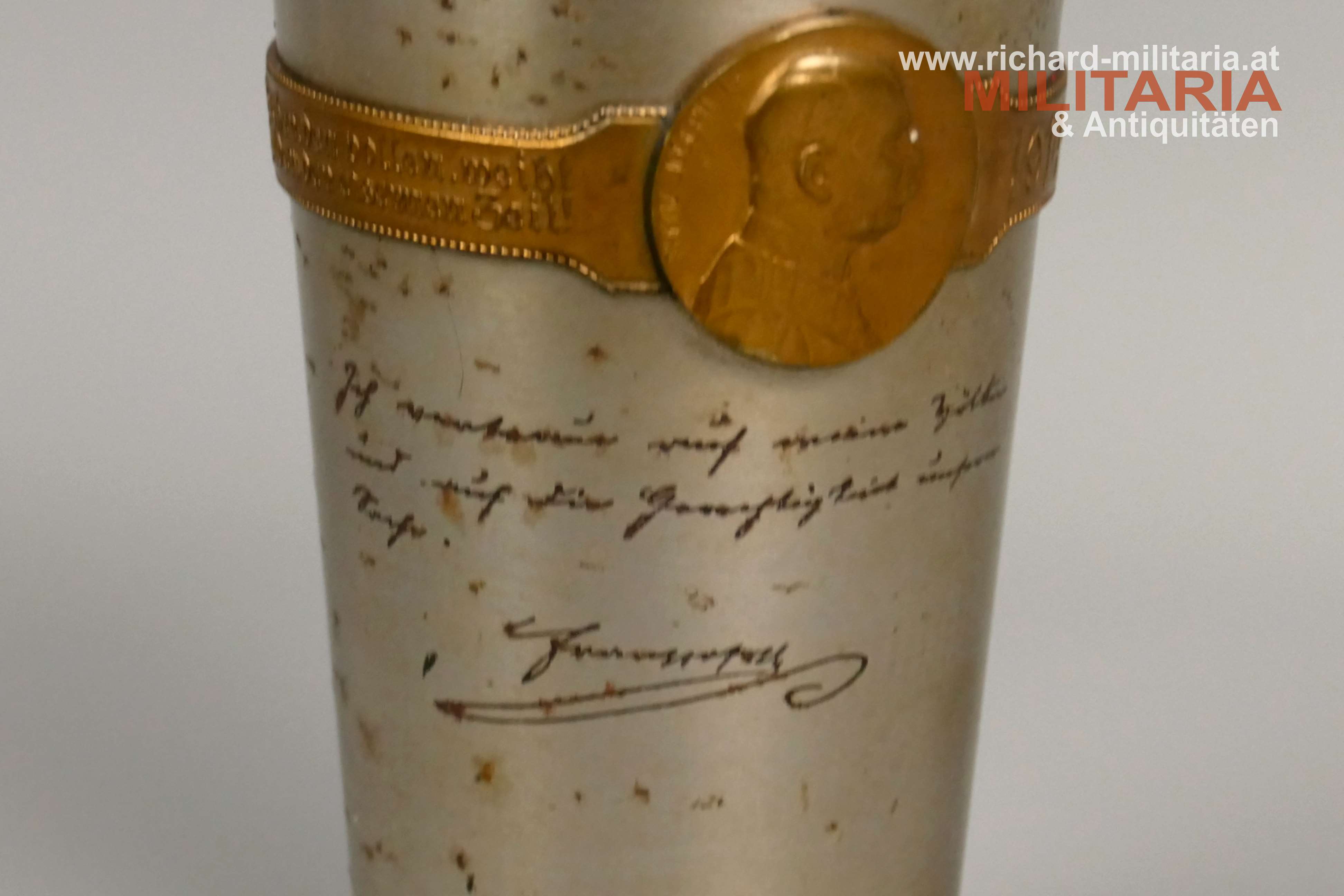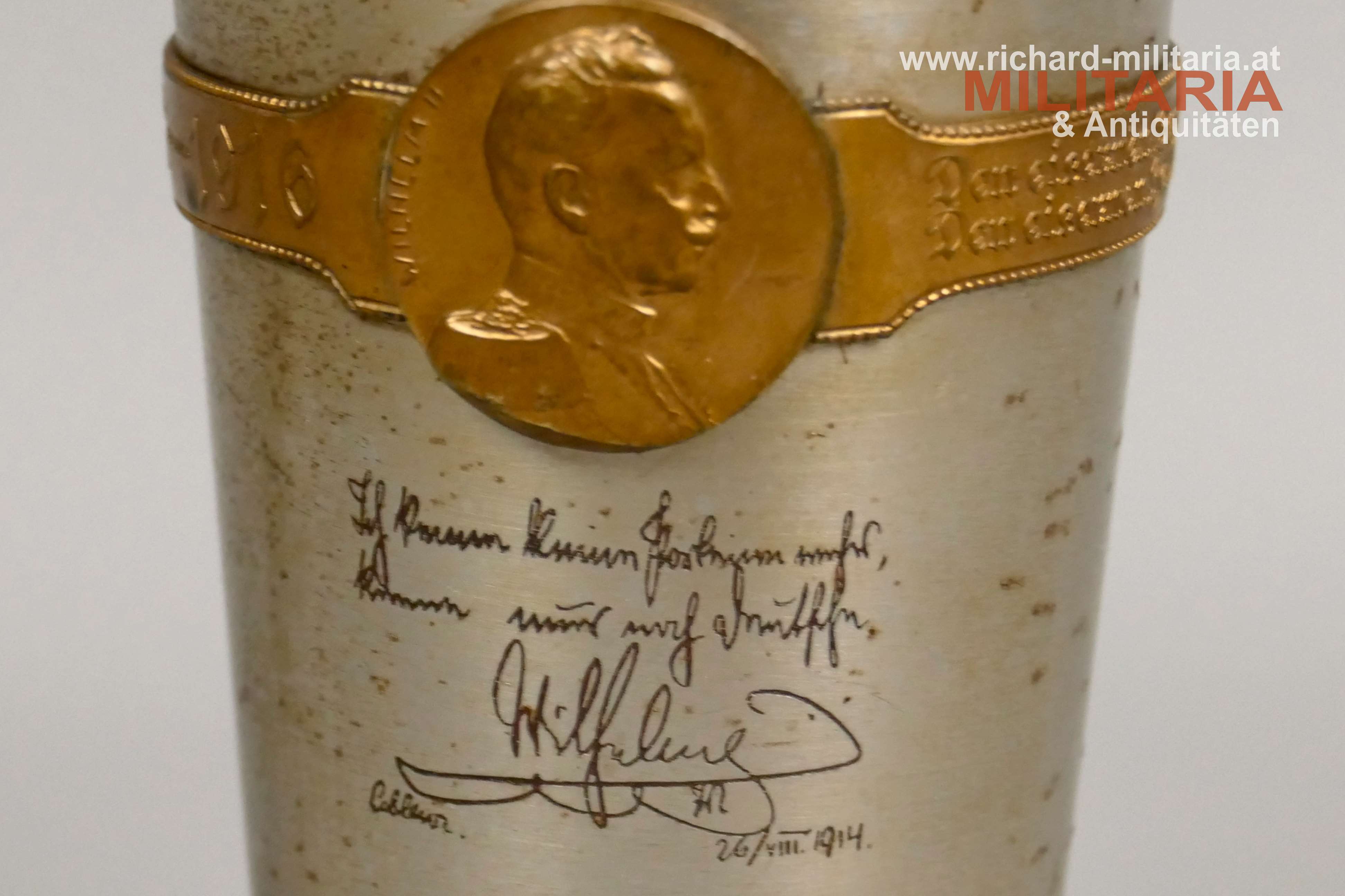 k.u.k. Kriegsfürsorge "Kriegsbecher" - 1914-1916 - amtliche Gravuren; große Variante; Eisen vernickelt - flugrostig; vergoldetes umlaufendes Spruchband (1914-1916) mit Bildnissen von Kaiser Franz Josef I. und Kaiser Wilhelm II.; amtliche Gravuren von Kaiser Franz Josef I. und Kaiser Wilhelm II.; Innenseite vergoldet und flugrostig; Herstellerpunzierung Berndorf am Becherboden;