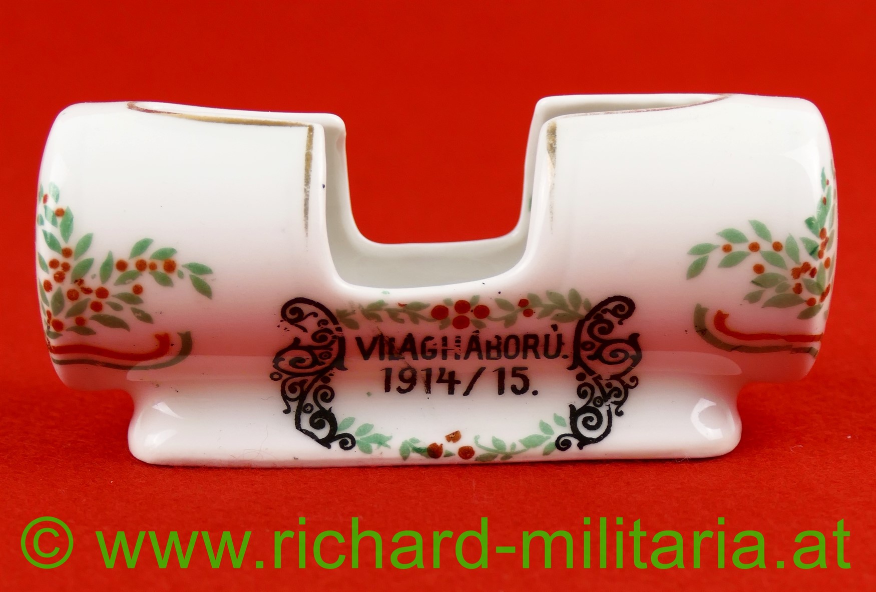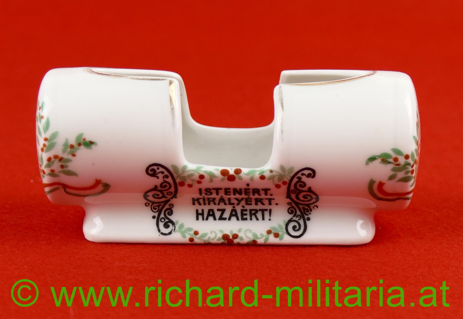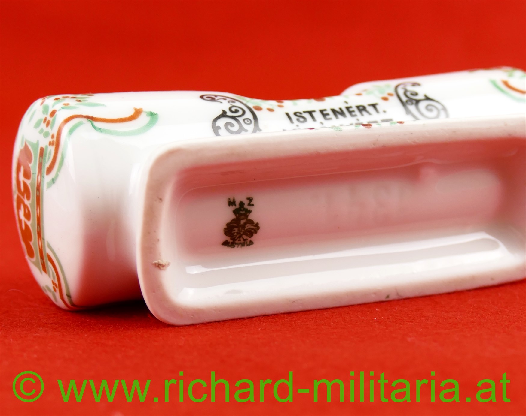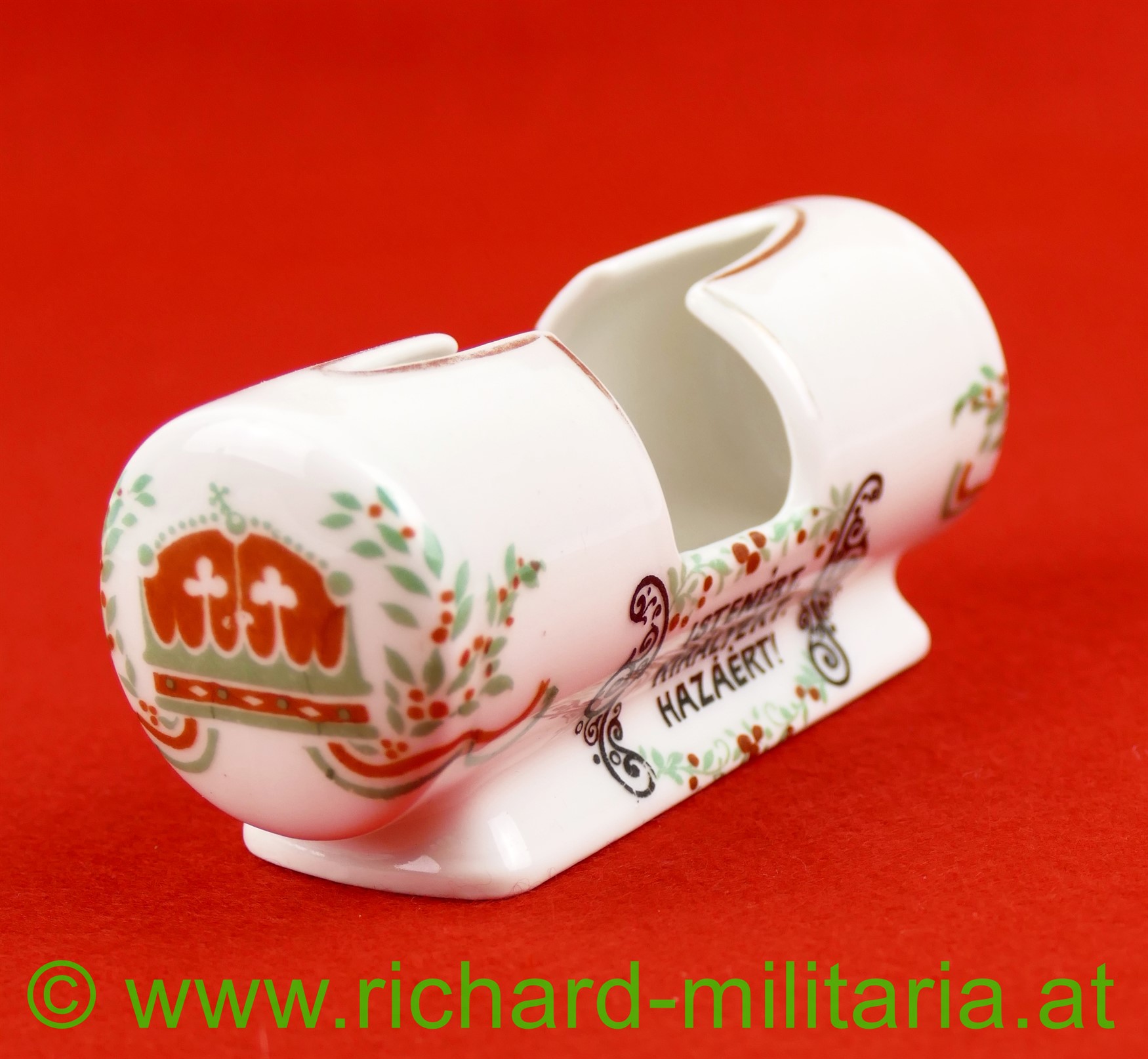 Zahnstocherbehälter aus dem Kriegsjahr 1914/15, handbemalt mit Krone und floral verzierten Eichenlaubkränzen, ungarische Schriftzüge, handgemalter Goldrand, Modellnummer: 1341, Herstellerlogo: "M. Z. Austria"