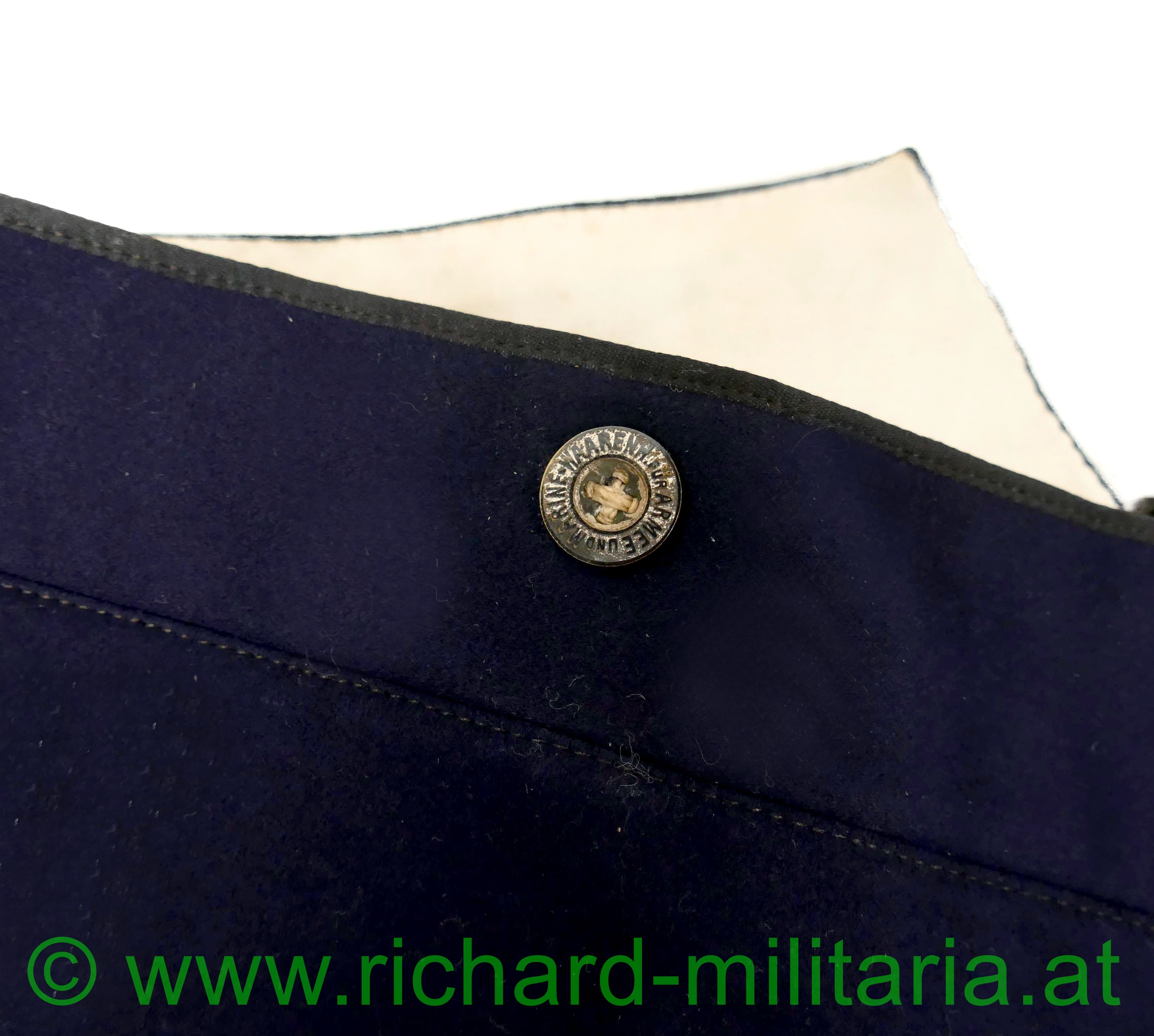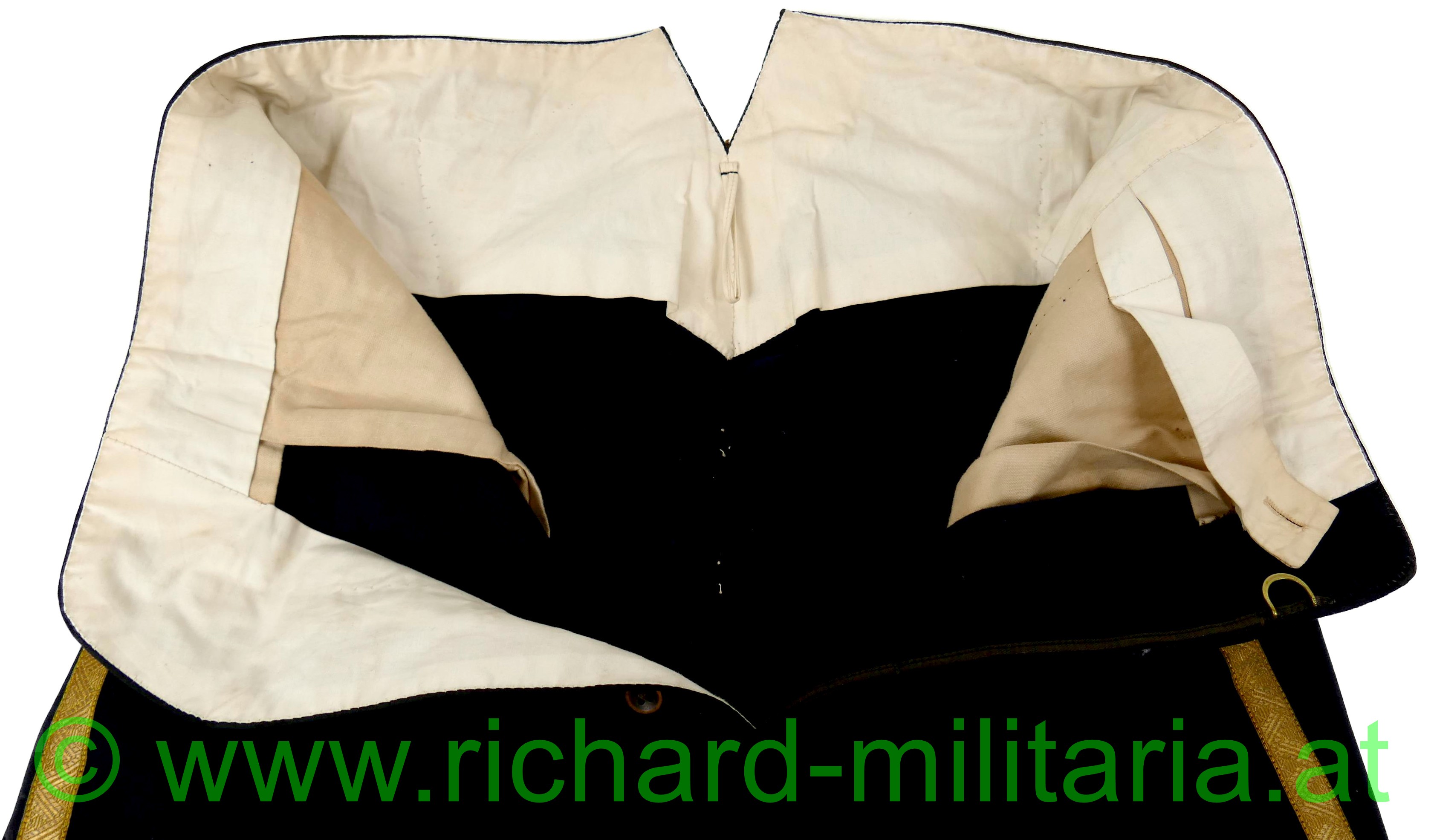 k.u.k. Kriegsmarine Hose zur Gala-Uniform für einen Offizier der III. IV. und V. Rangklasse; Pantalons aus dunkelblauem feinem Wollstoff; seitlich an den Hosenbeinen eine goldene zick-zack Borte für Offiziere der Rangklasse III. bis V. laut Adjustierungsvorschrift 1910; entlang des Hosenbundes 6 Tombakknöpfe mit der Aufschrift "Warenh. für Armee und Marine"; 4 Knöpfe im Schritt aus poliertem Holz; innen am Bund mit feinem weißen Stoff ausgelegt; Hosentaschen aus beigen Wollstoff; an den Beinenden je 2 Einhängelaschen; rückseitig ein Metallverschlusssystem zum justieren der Hose; UNGETRAGEN!