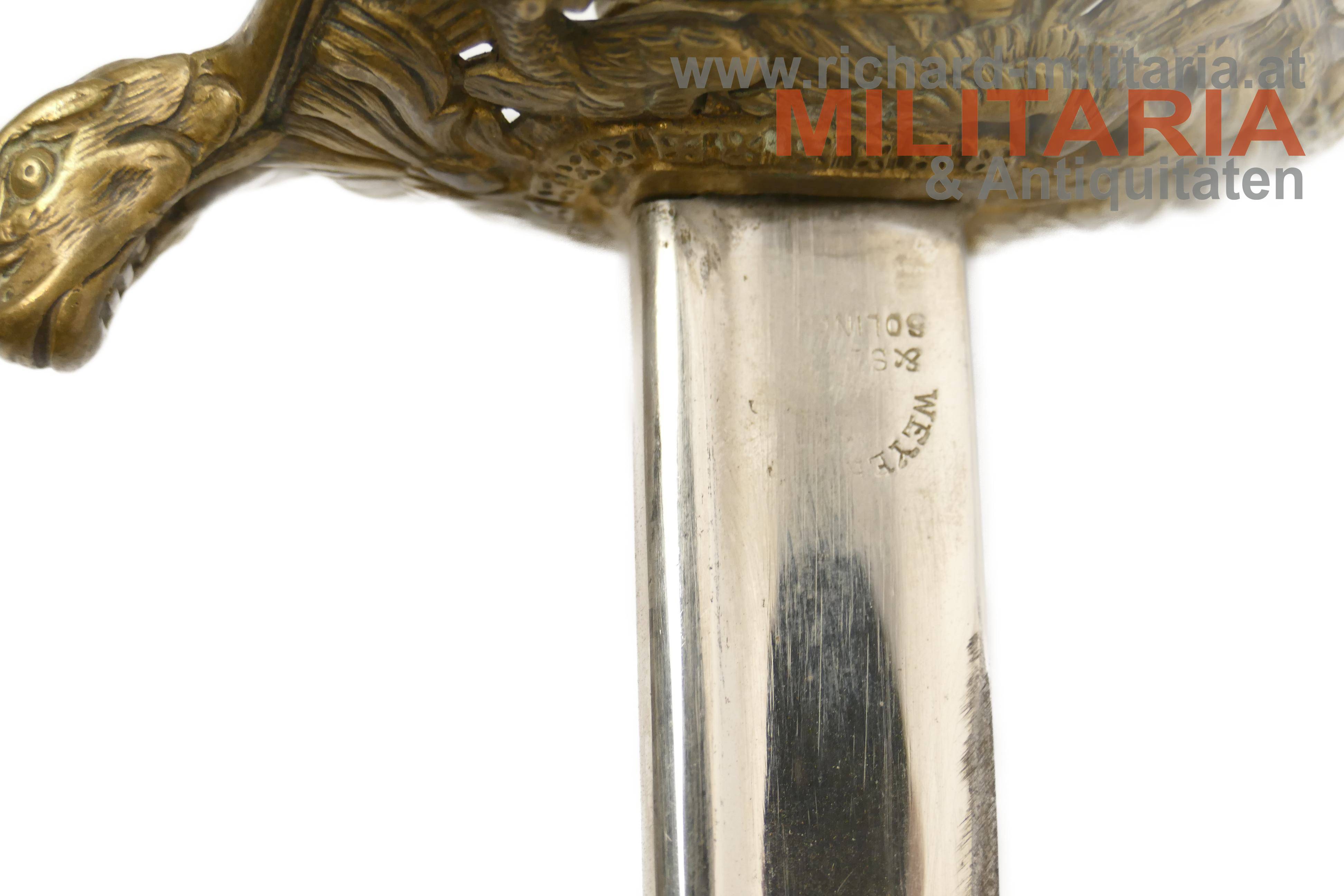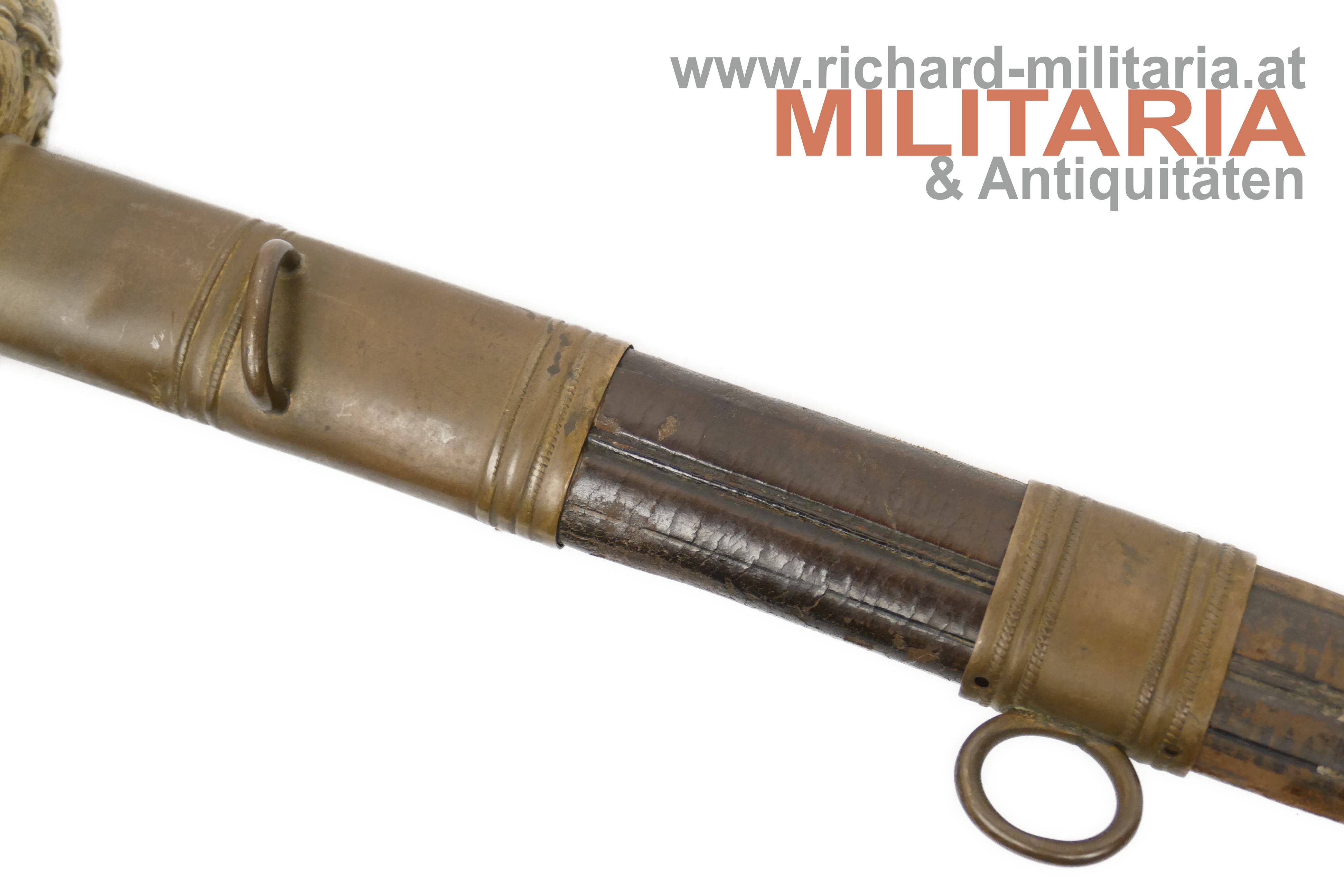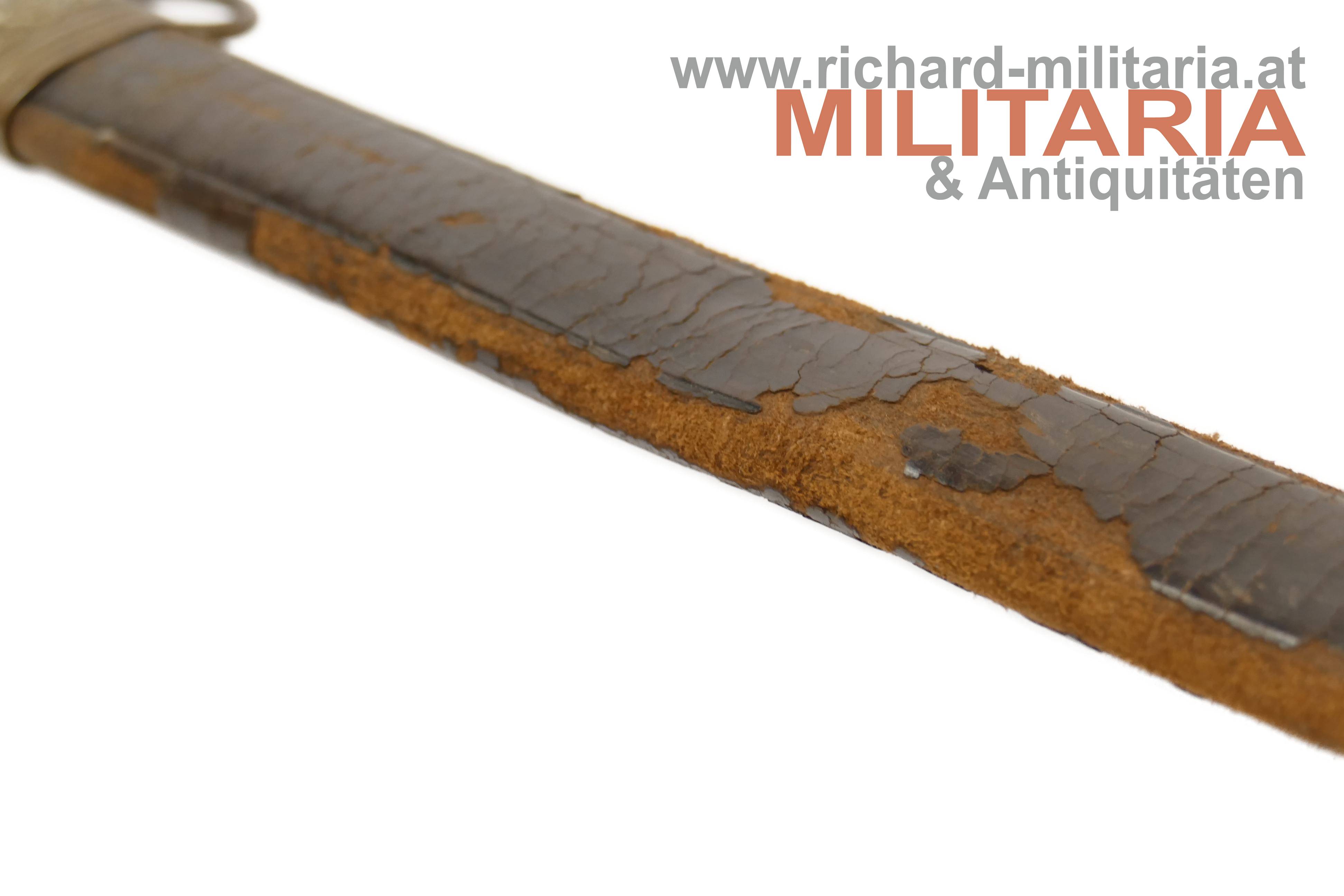 k.u.k. Kriegsmarine - Offizierssäbel M1850/71; vernickelte, leicht beschliffene und etwas flugrostige Stabrückenklinge mit Hersteller "Weyersberger"; Messingkorb mit Nixen und Neptunkopf in Standardausführung; Griff aus Fischhaut mit dreifacher Golddrahtwicklung; unberührte belederte Scheide mit Messingbeschlägen; der mittlere Beschlag lässt sich verschieben; schräger Einhängehaken für das Gehänge wie für das Muster 1850/71 vorgesehen; Leder mit stärkeren Abnutzungsspuren; Vergoldung weitgehend vergangen.