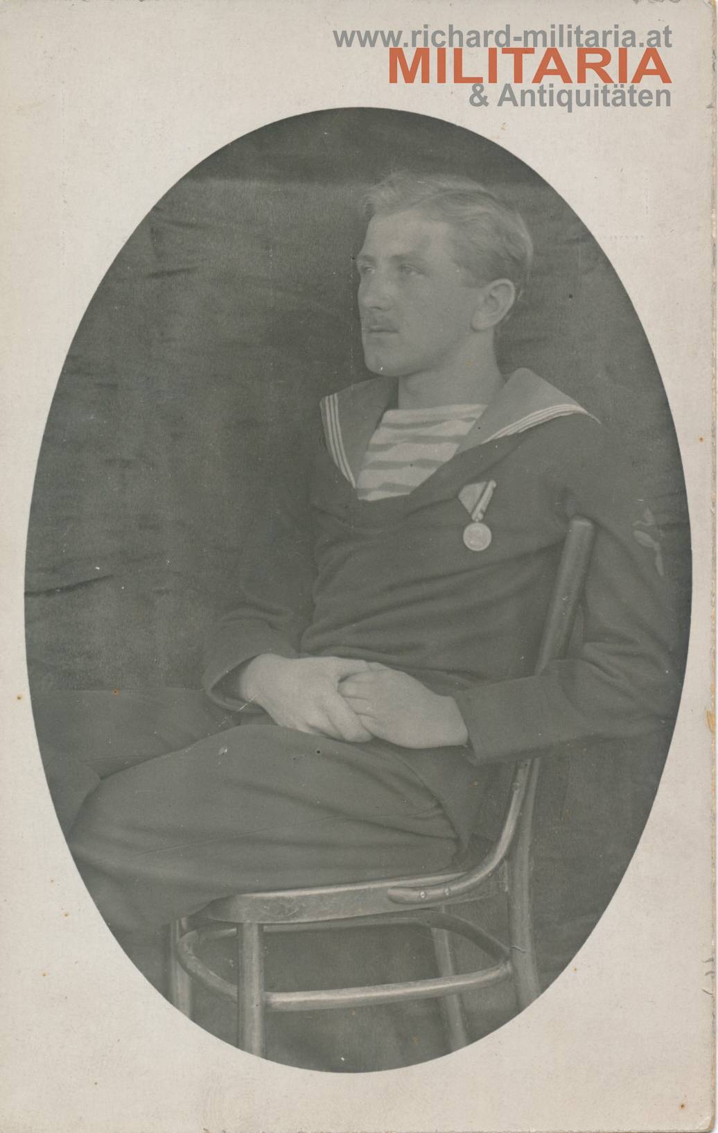k.u.k. Kriegsmarine SMS Helgoland 1916, Postkartenformat; das Ärmelabzeichen Maschinendienst gut erkennbar;