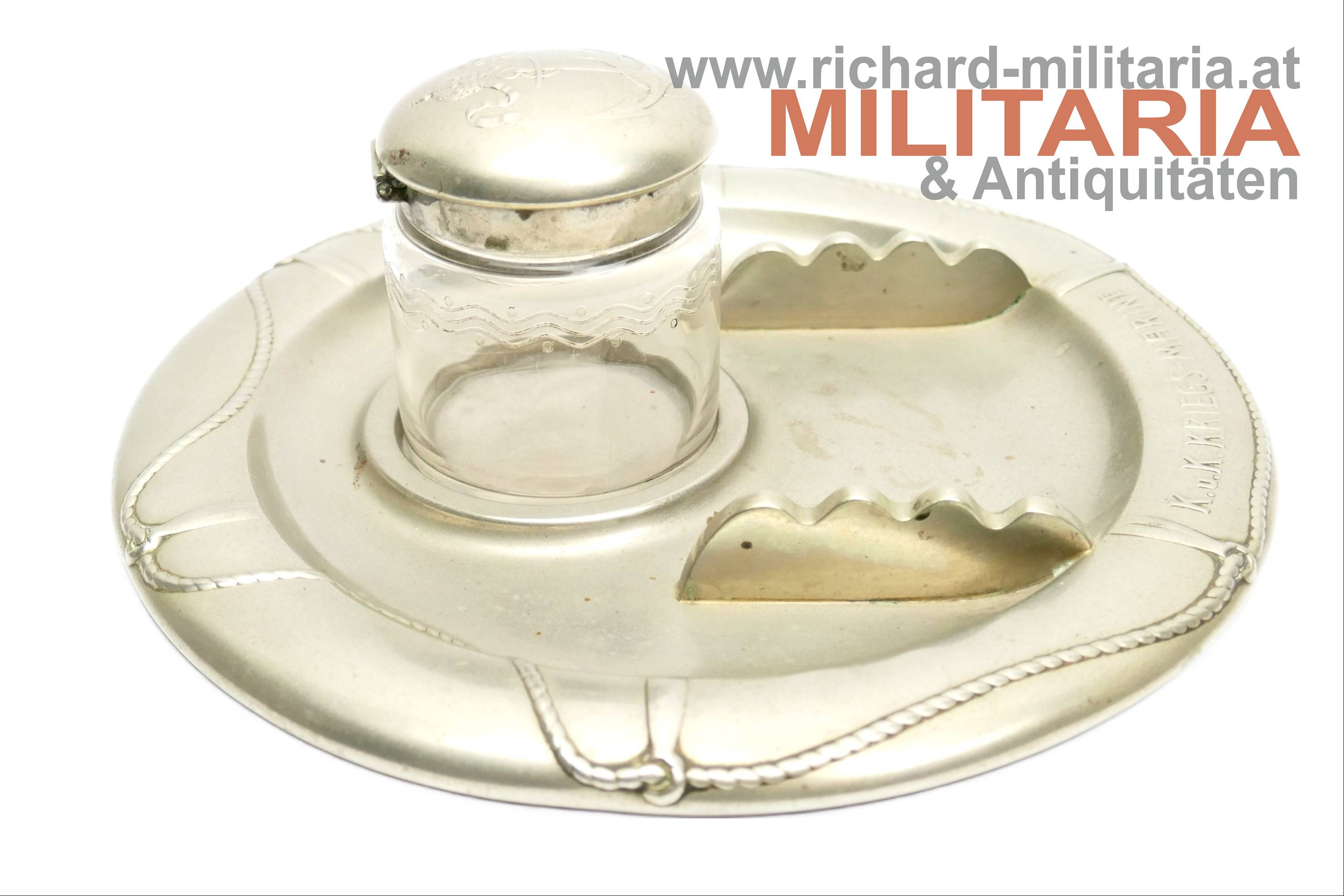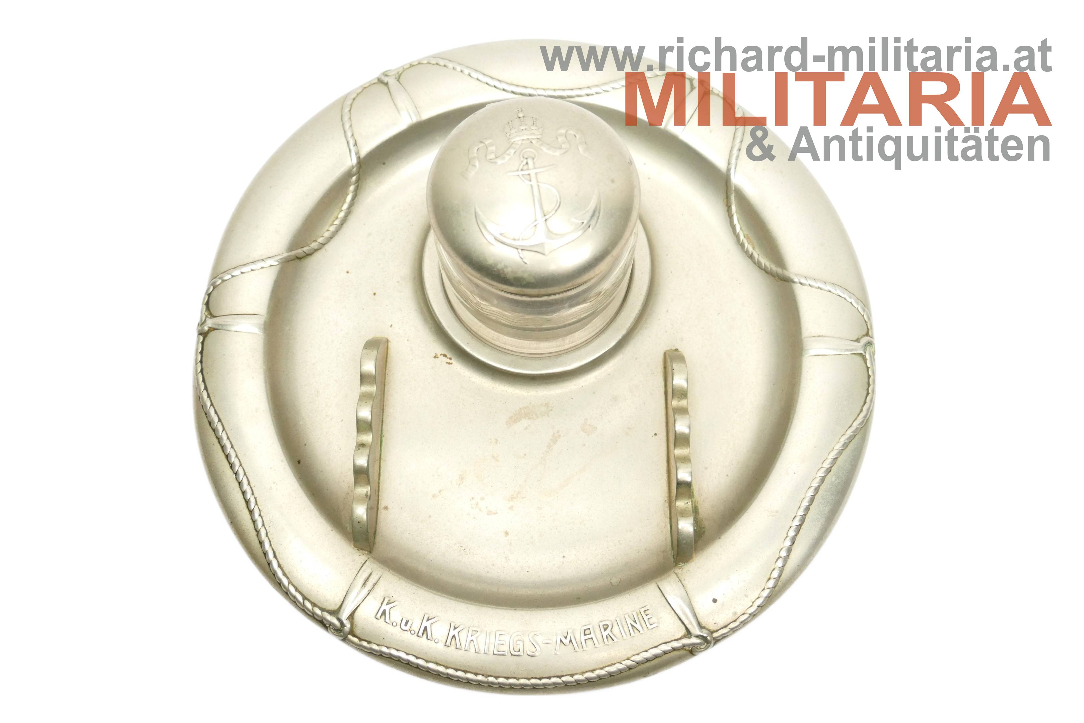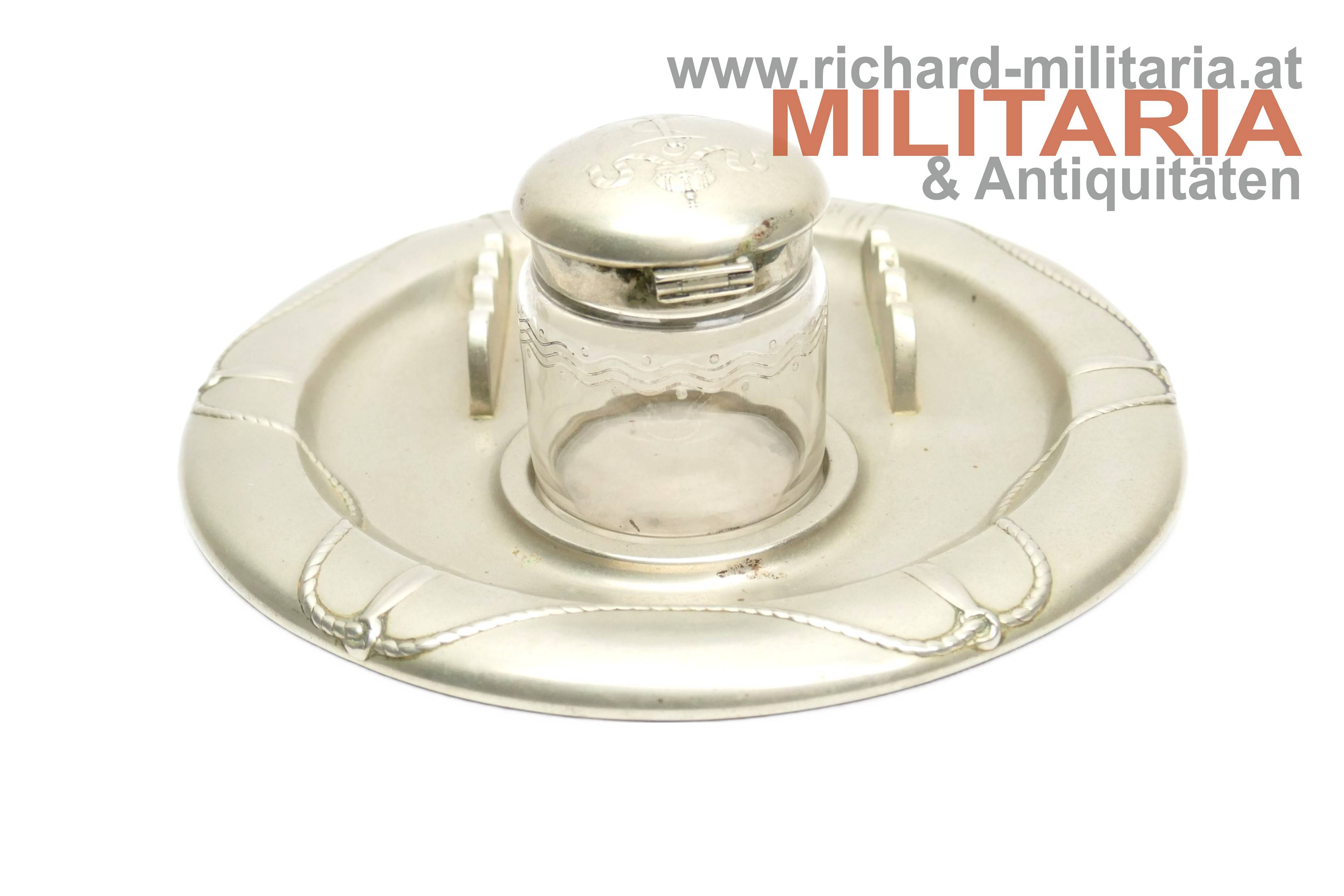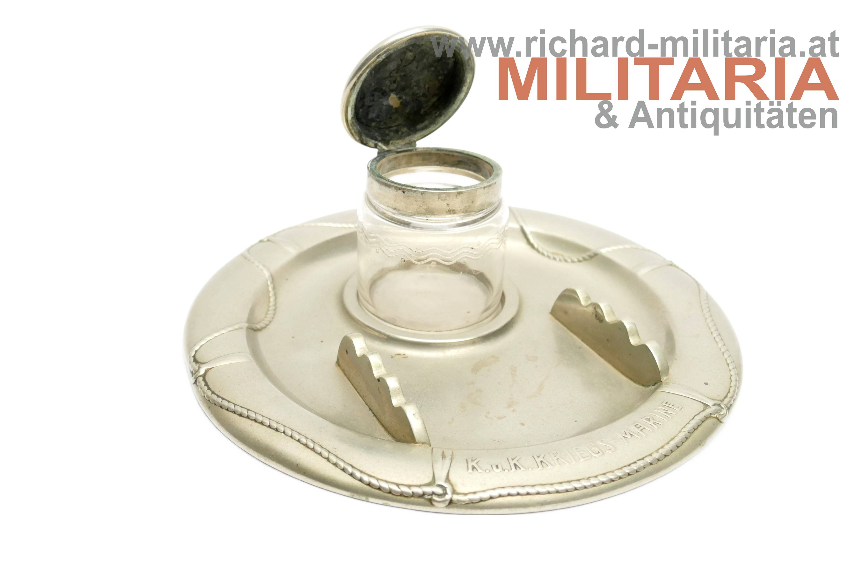 k.u.k. Kriegsmarine - Tintenfass mit Untersetzer; Alpaka; Untersetzer im Stile eines Rettungsrings mit der Aufschrift "K.u.K. Kriegsmarine"; Untersetzer mit einer Einfassung für das Tintenfass sowie gewellter Erhöhungen zum Ablegen von Schreibfedern; Untersetzer auf der Rückseite vom Hersteller Berndorf gestempelt; Tintenglas mit Wellengravuren; Deckel mit dem Kriegsmarine-Anker überhöht von der Kaiserkrone mit Pendilen; Deckel zum Aufklappen; Deckel sitzt nur locker am Glas;