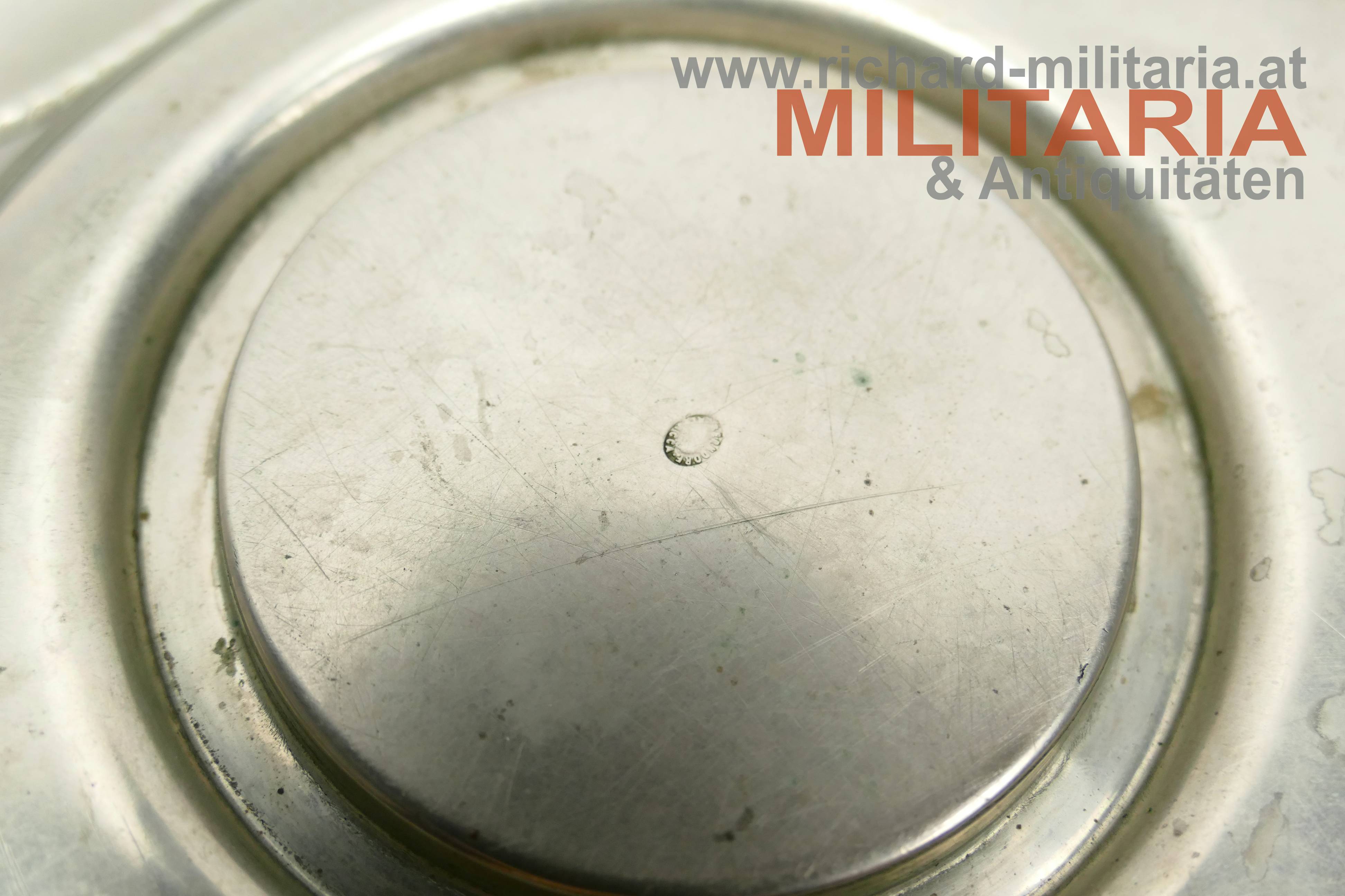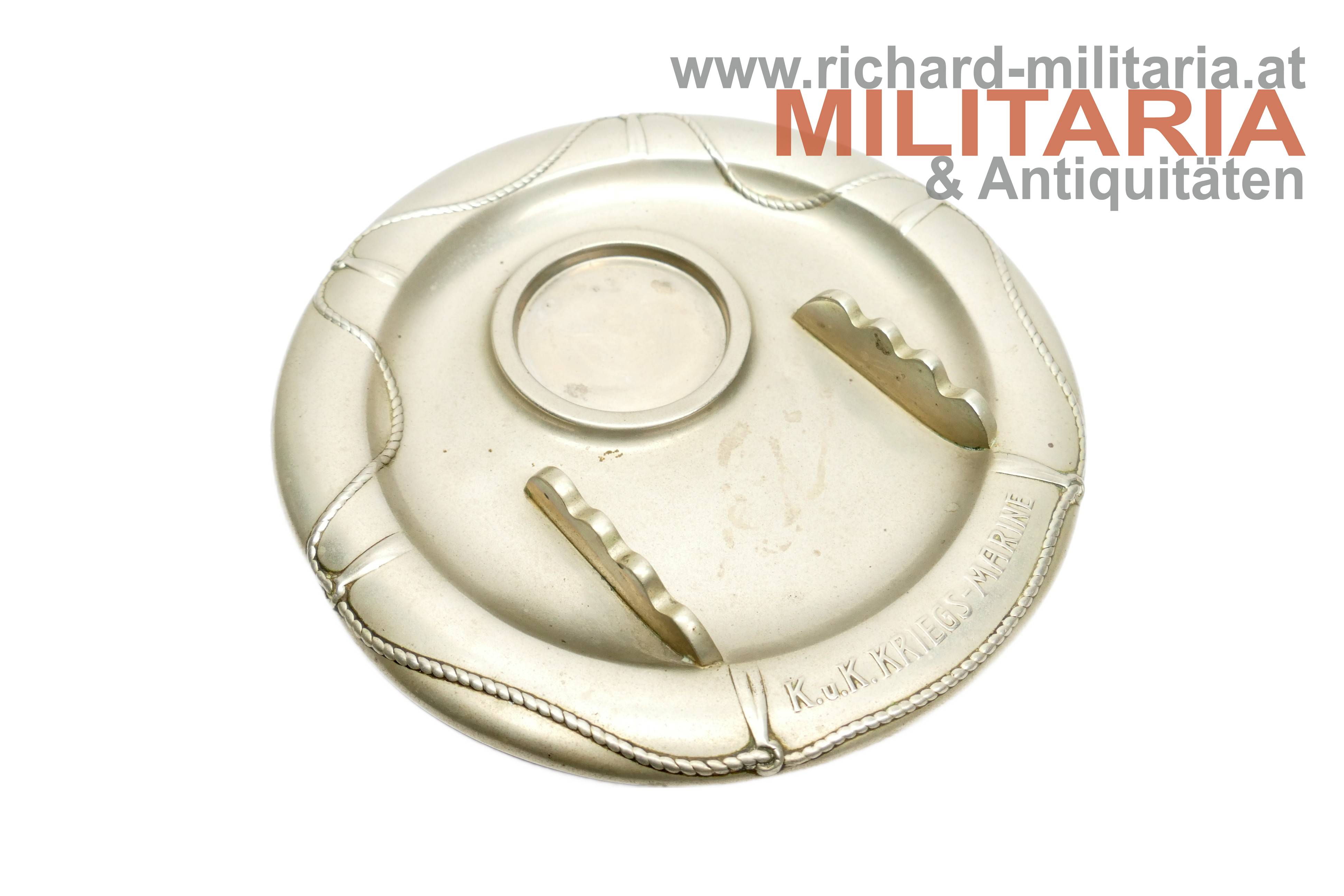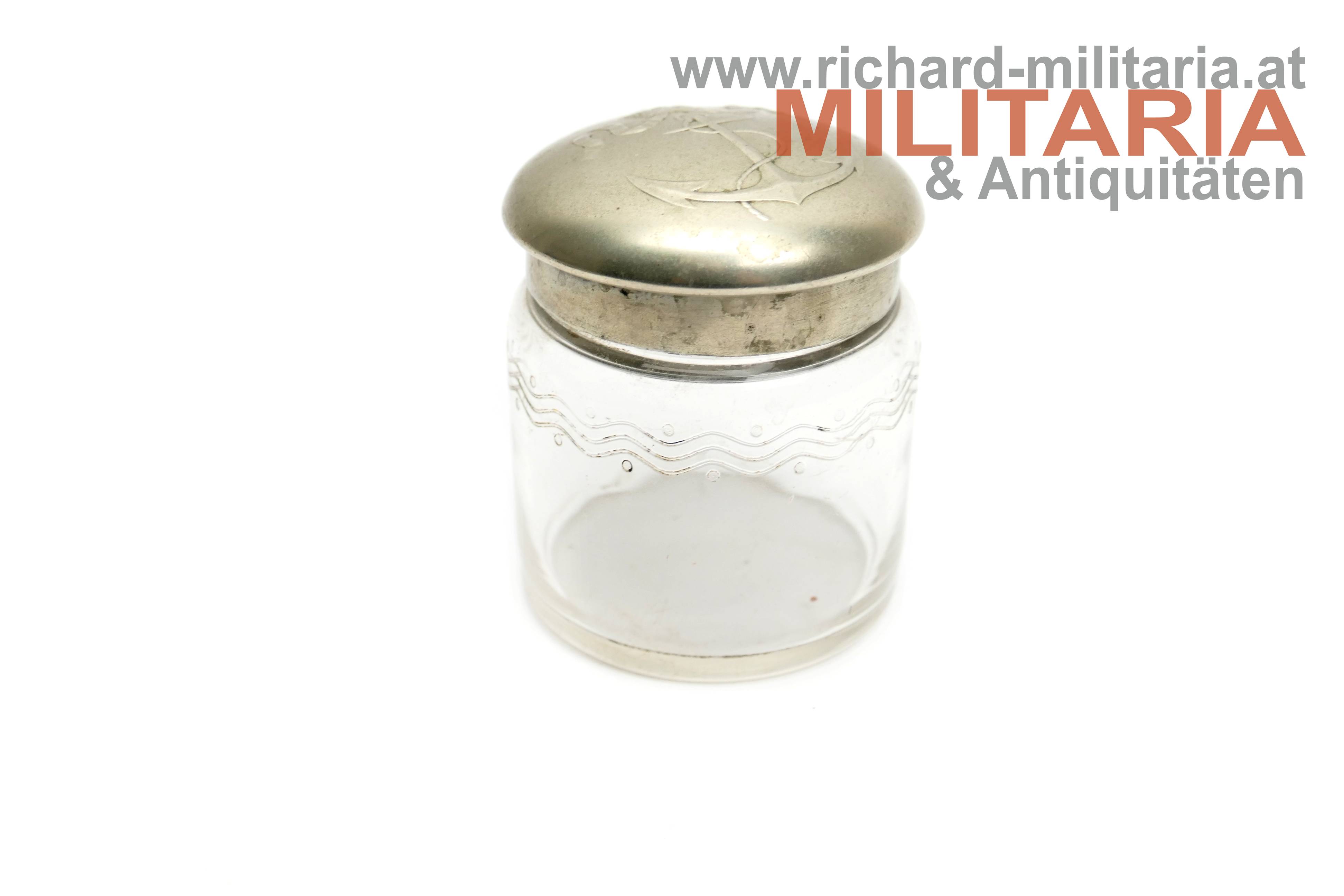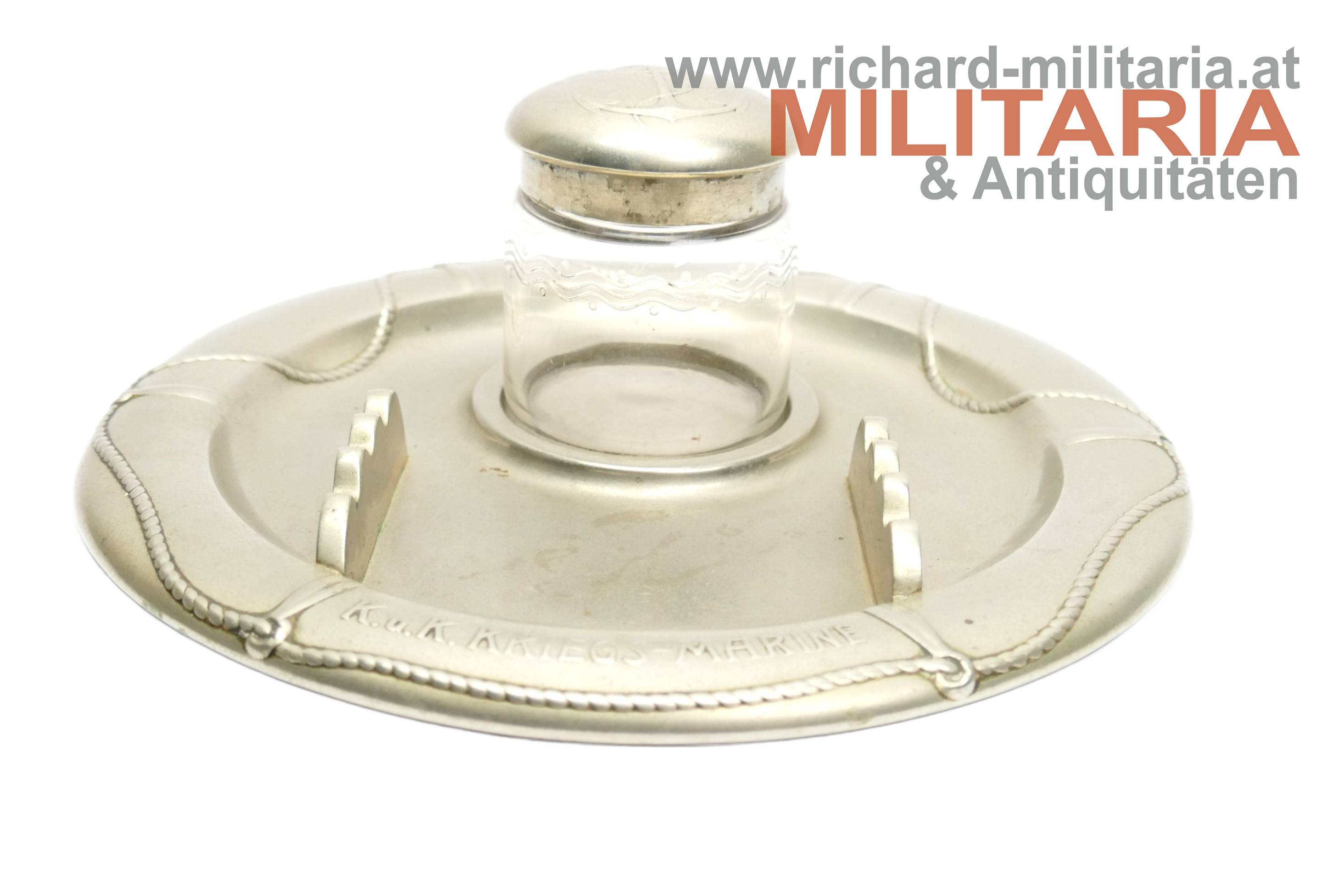 k.u.k. Kriegsmarine - Tintenfass mit Untersetzer; Alpaka; Untersetzer im Stile eines Rettungsrings mit der Aufschrift "K.u.K. Kriegsmarine"; Untersetzer mit einer Einfassung für das Tintenfass sowie gewellter Erhöhungen zum Ablegen von Schreibfedern; Untersetzer auf der Rückseite vom Hersteller Berndorf gestempelt; Tintenglas mit Wellengravuren; Deckel mit dem Kriegsmarine-Anker überhöht von der Kaiserkrone mit Pendilen; Deckel zum Aufklappen; Deckel sitzt nur locker am Glas;