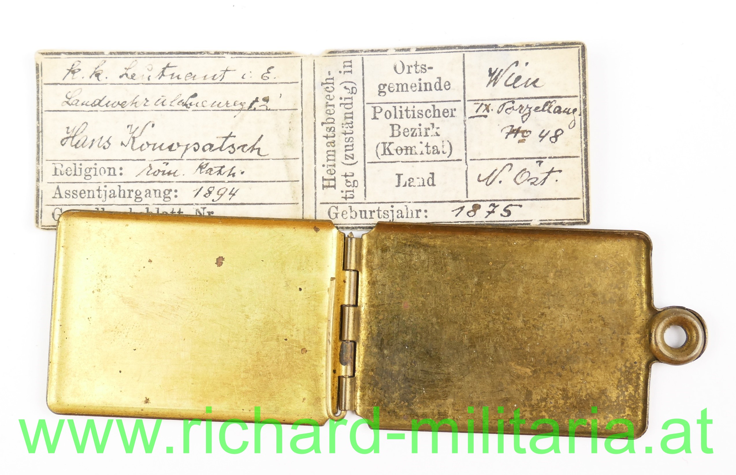 Legitimationskapsel - k.k. Leutnant i. E. - Landwehrulanenregiment No. 2 des Hans Konopatsch aus Wien, Kapsel aus Messing;