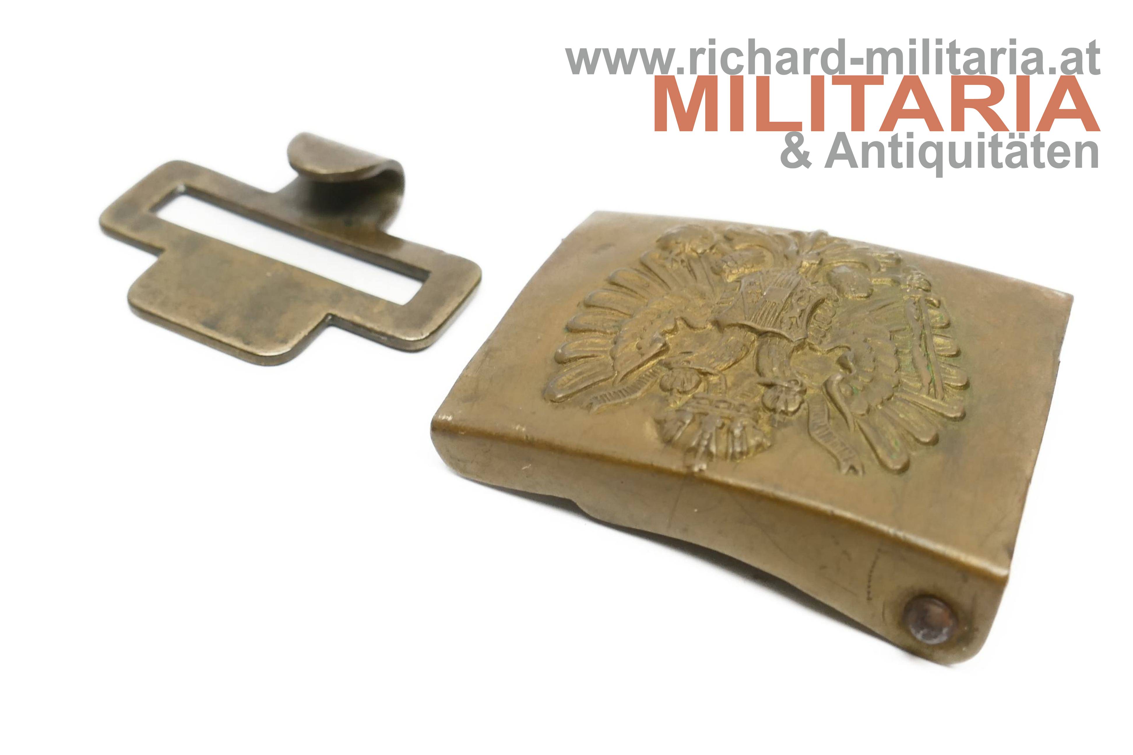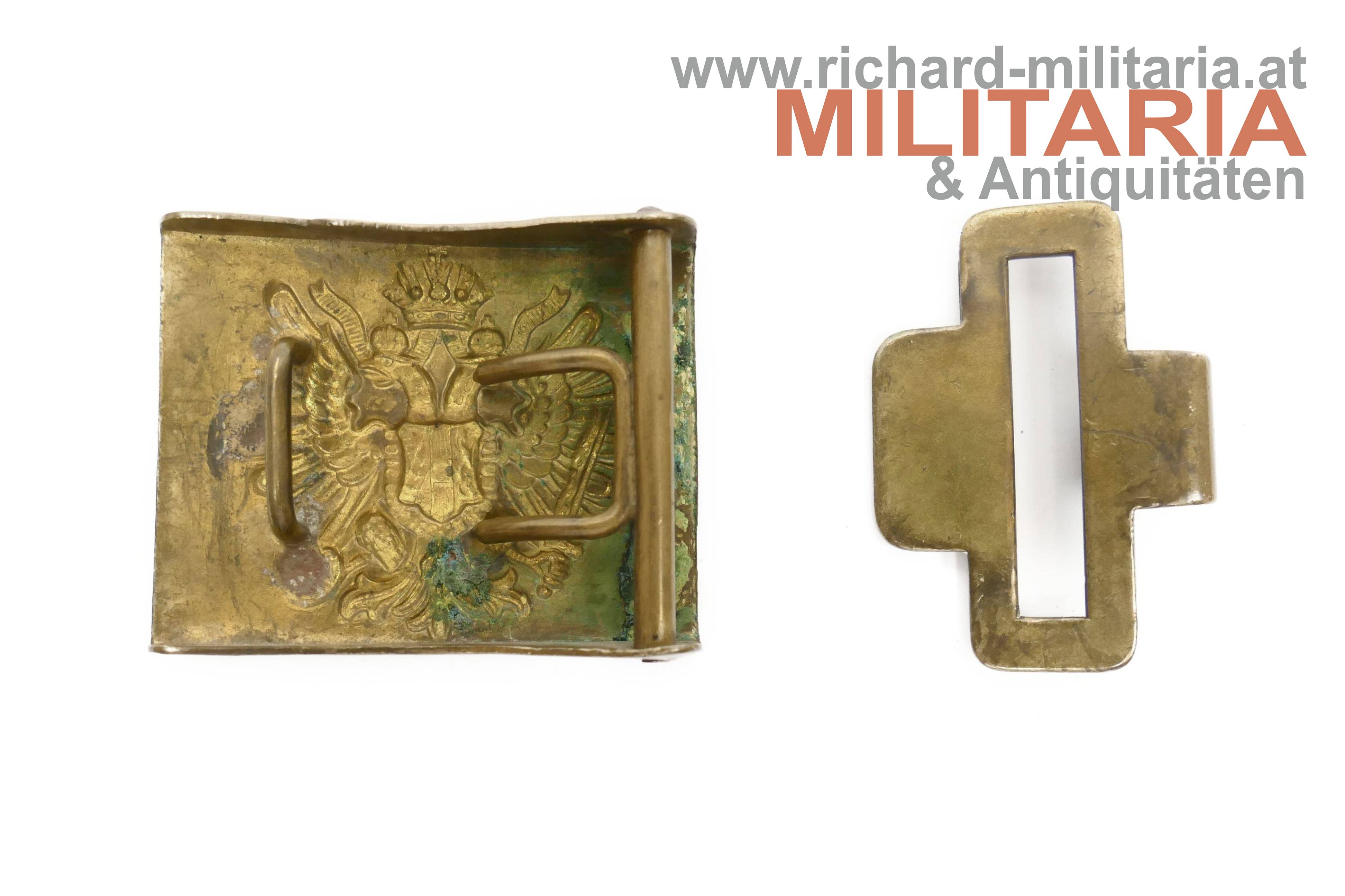 k.u.k. Leibriemenschliesse mit zugehörigem Gegenhaken für Mannschaften und Unteroffiziere; Messing durchgeprägt; Gegenhaken ebenfalls aus Messing; Koppelschloss mit etwas Grünspan; schöne plastische Prägung mit nur minimalen Tragespuren.
