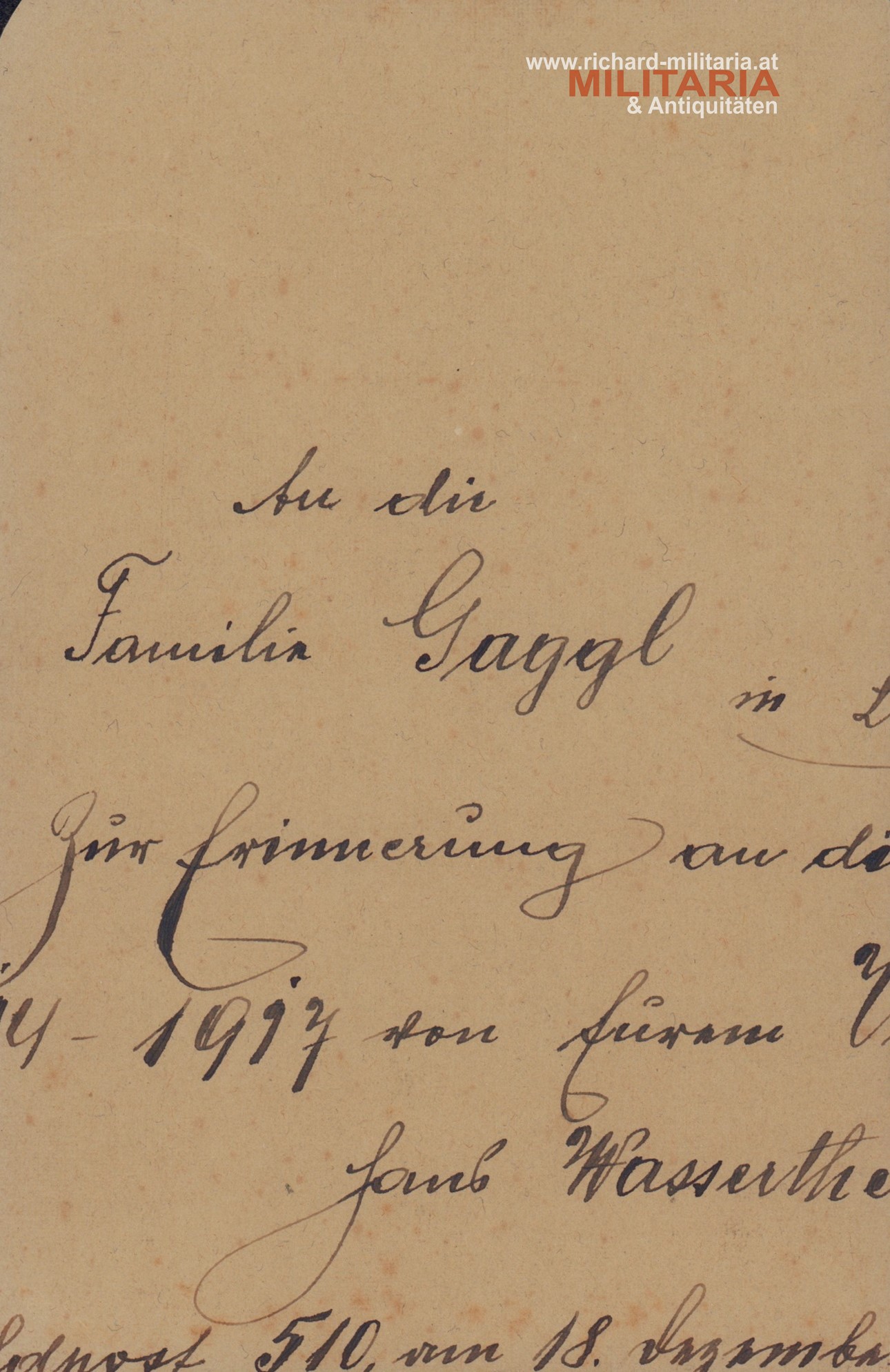 k.u.k. Foto eines Leutnats - aufgenommen von H. Pohl Bozen (Logo am Kartonblatt), Rückseite mit Abschnitt eines Textes an Familie Gaggl. Foto in Postkartenformat