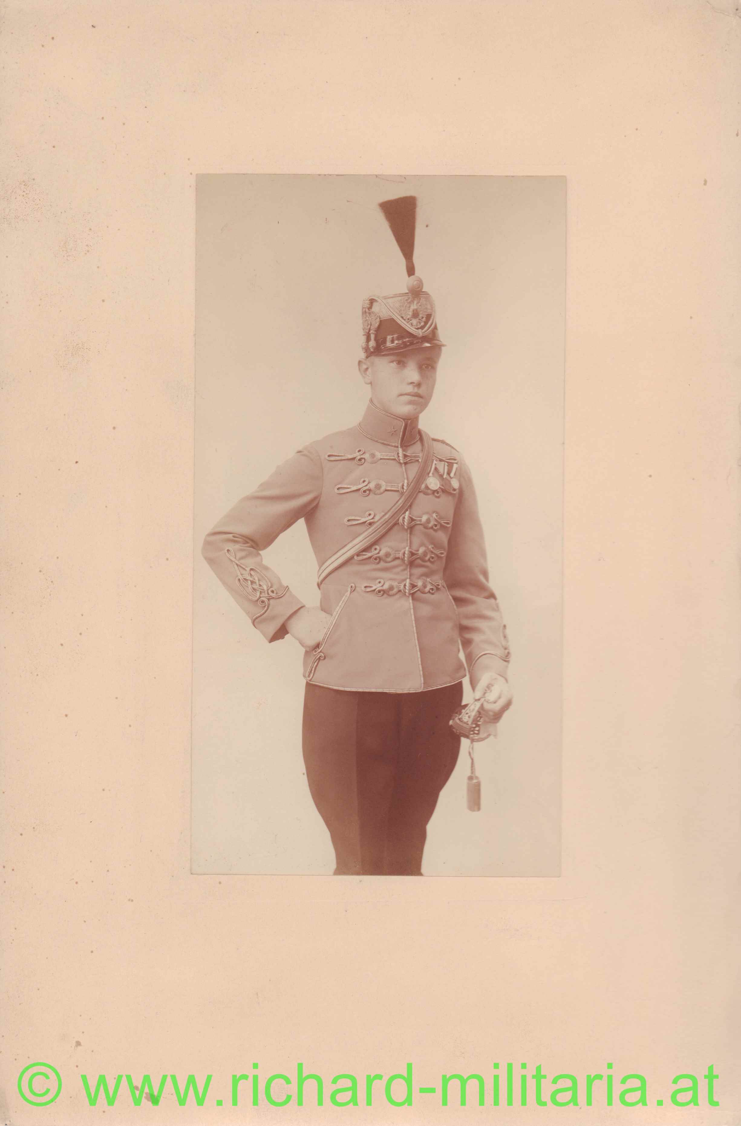 k.u.k. Leutnant im Husarenregiment „von Kolossváry“ No. 14, Foto auf Karton, insgesamt 21 x 32 cm Format, sehr guter Zustand
