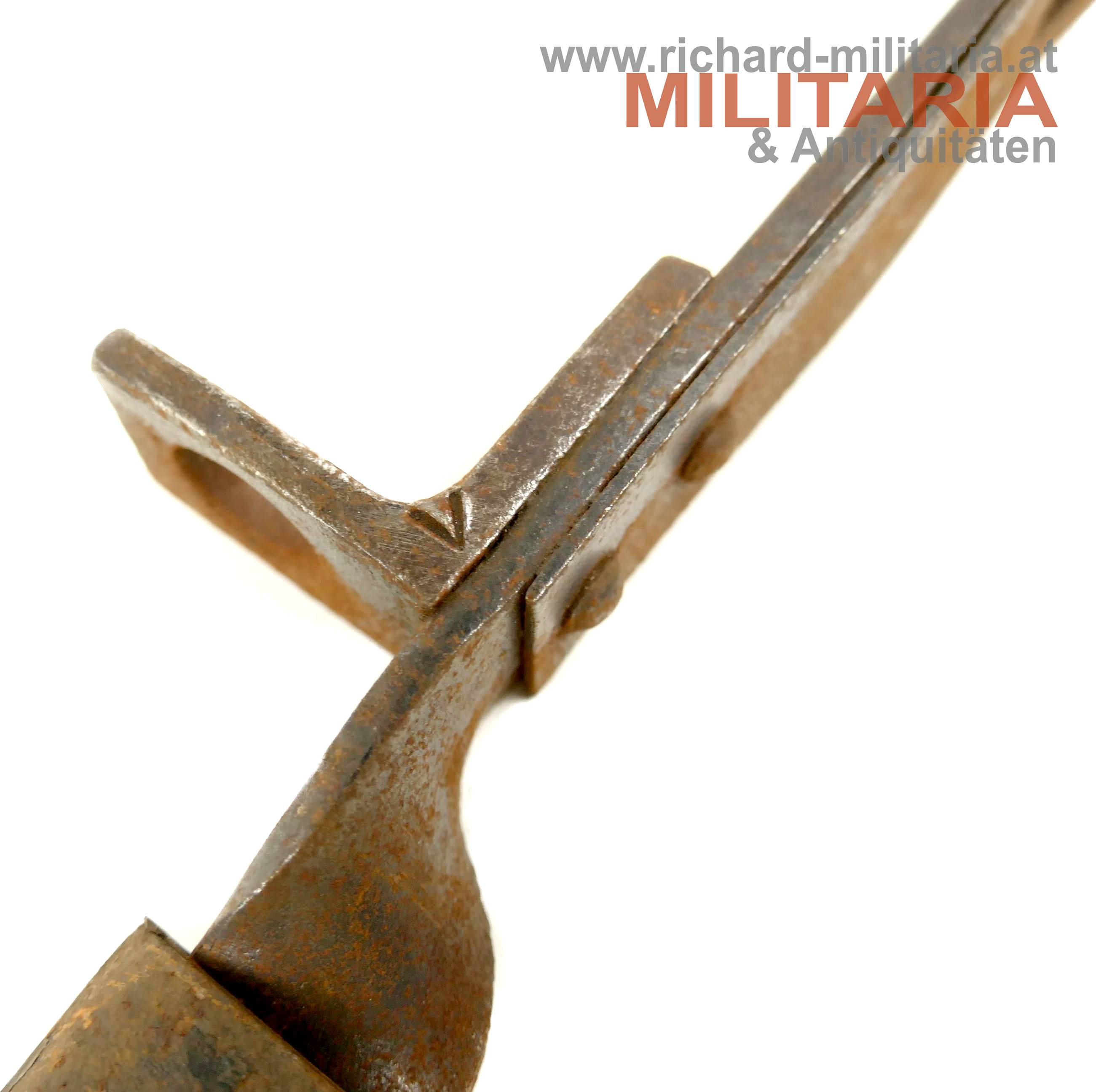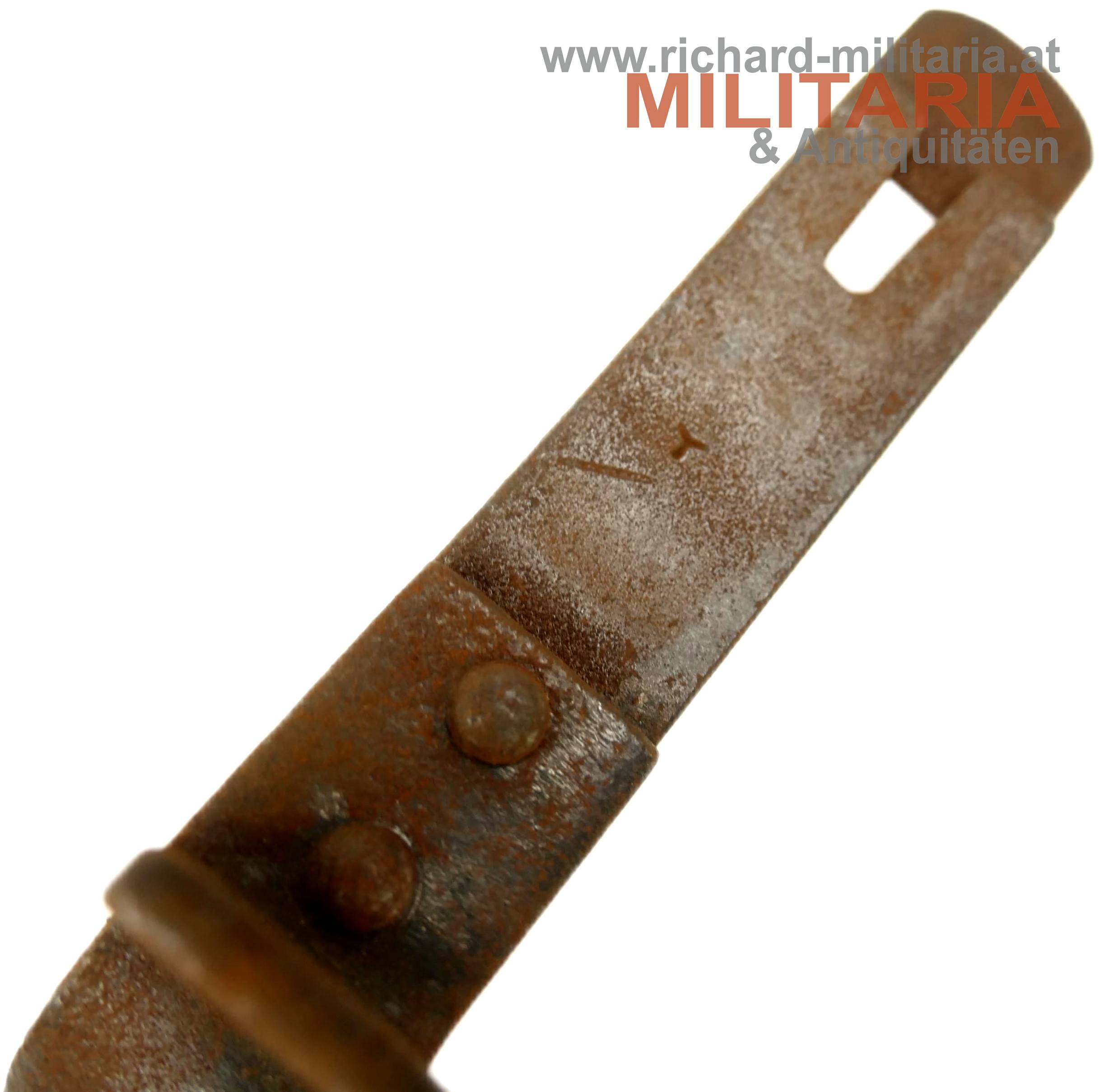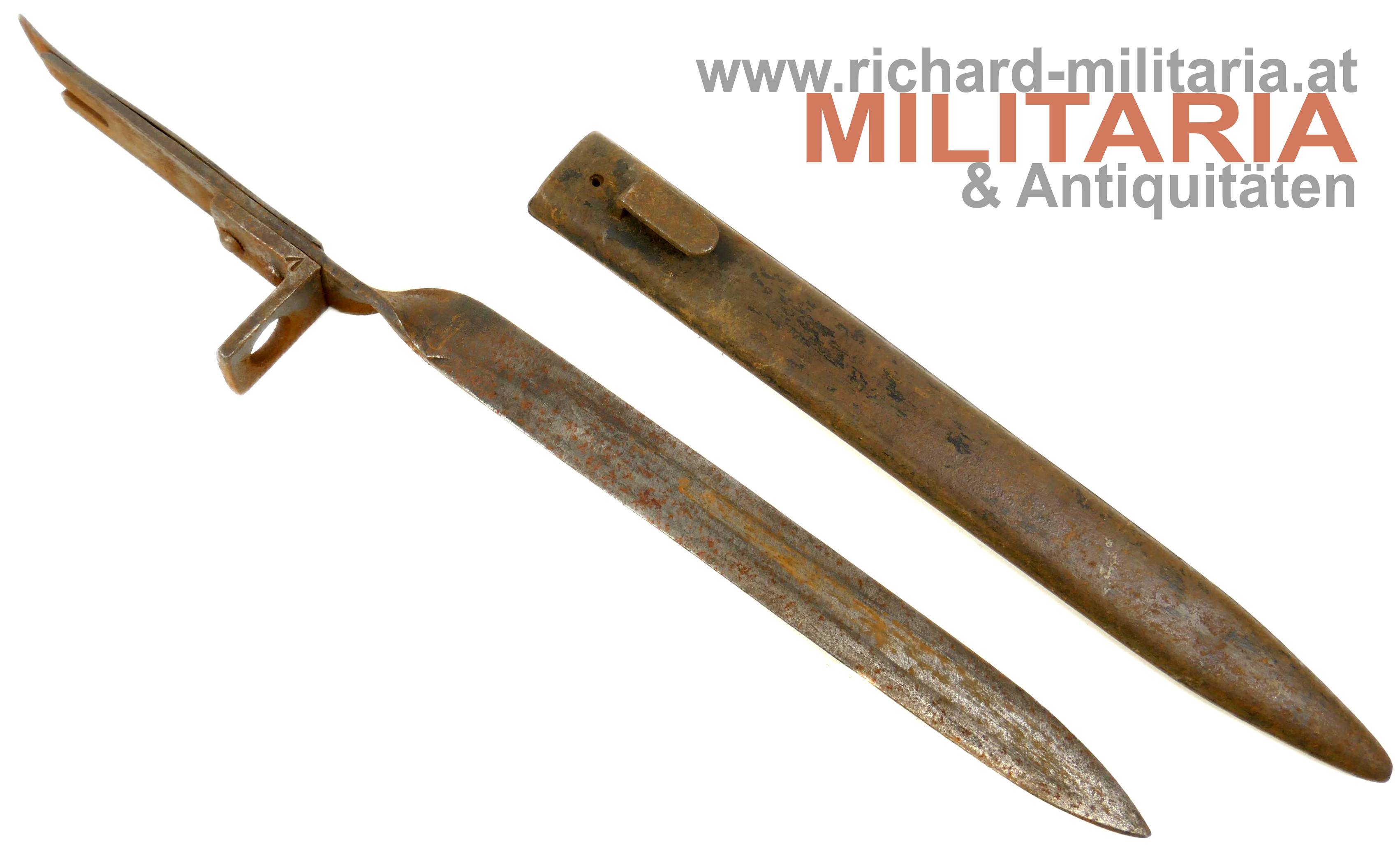 k.u.k. Ersatzbajonett / Notbajonett M95, gedrehter Flachstahl mit einschneidiger Klinge, Nietung des Griffblattes erfolgte mit 2 Stahlnieten, massives Federblatt; seitliche Pfeilstempelung am vernieteten Laufdurchführungsring, am Griffstück zusätzlich mit Y-gestempelt, DM-Laufdurchführung ca. 15,5mm; originale Scheide mit Naht nach außen - stärker flugrostig - Spuren von Originalfarbe erkennbar; Schraube an der Scheide für Federhalterung fehlt - bei der Scheide ist auf einer Seite die Lötung aufgegangen; Tragehaken wackelt; flugrostig; reinigungs- und pflegebedürftig.