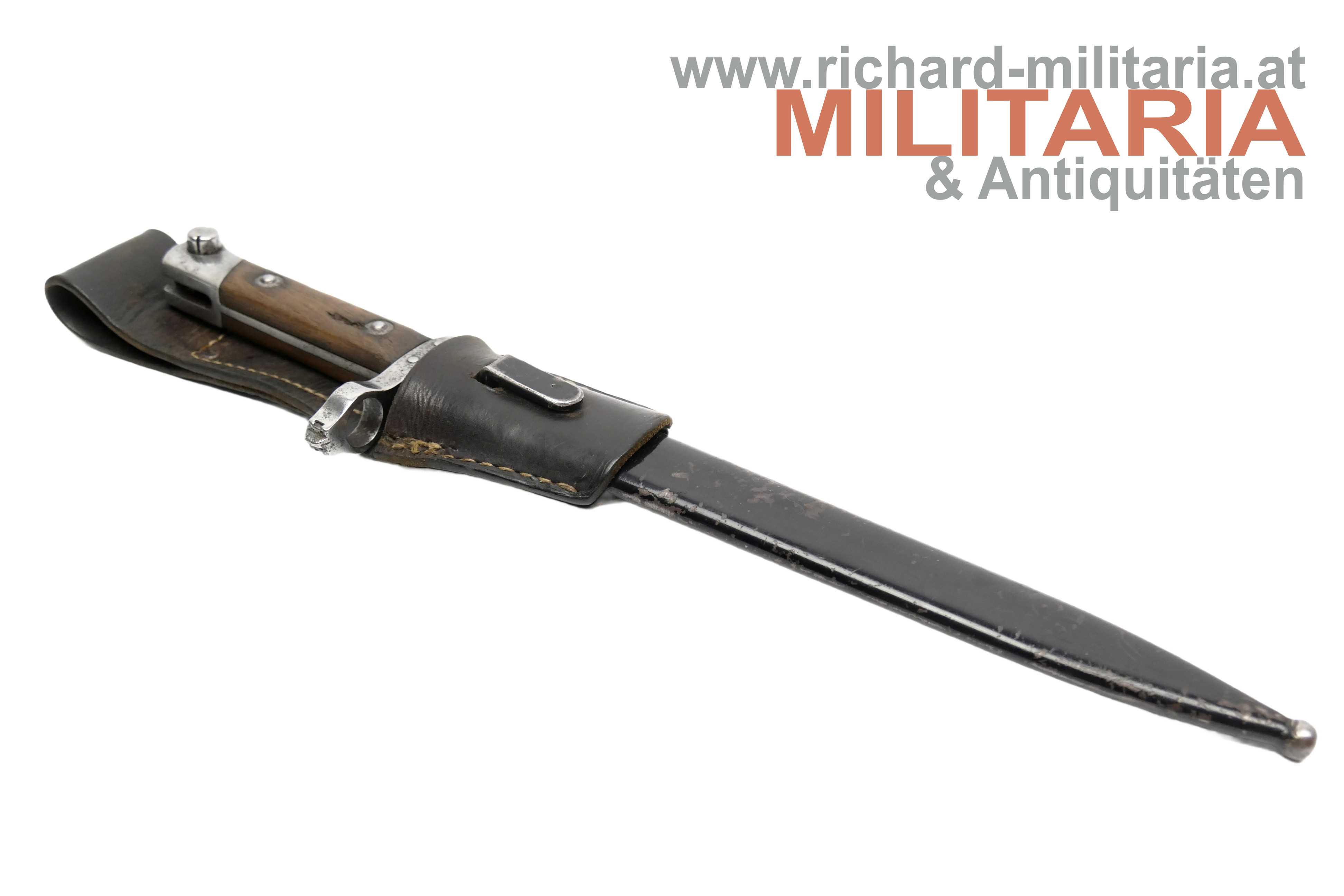 k.u.k. Messerbajonett M 1895 für Mannschaften & Unteroffiziere - "ER S514"; blanke gereinigte - und im unteren Bereich beschliffene Klinge mit Hersteller F.G.G.Y. und k.u.k. Armeeabnahme; Klinge leicht narbig; mit Kugelkopfnieten zweifach vernietete braune Holzgriffschalen; Hilfsvisierkorn; auf der Parierstange eingeschlagene Nummer: "33"; zwischen den Griffschalen ein eingeschlagenes "R"; Scheide mit Hersteller: "OeWG u. Armeeabnahme" mit großteils erhaltener originaler schwarzer Lackierung; originaler Koppelschuh mit leichten Tragespuren; Griffmetallteile poliert - leicht narbig;