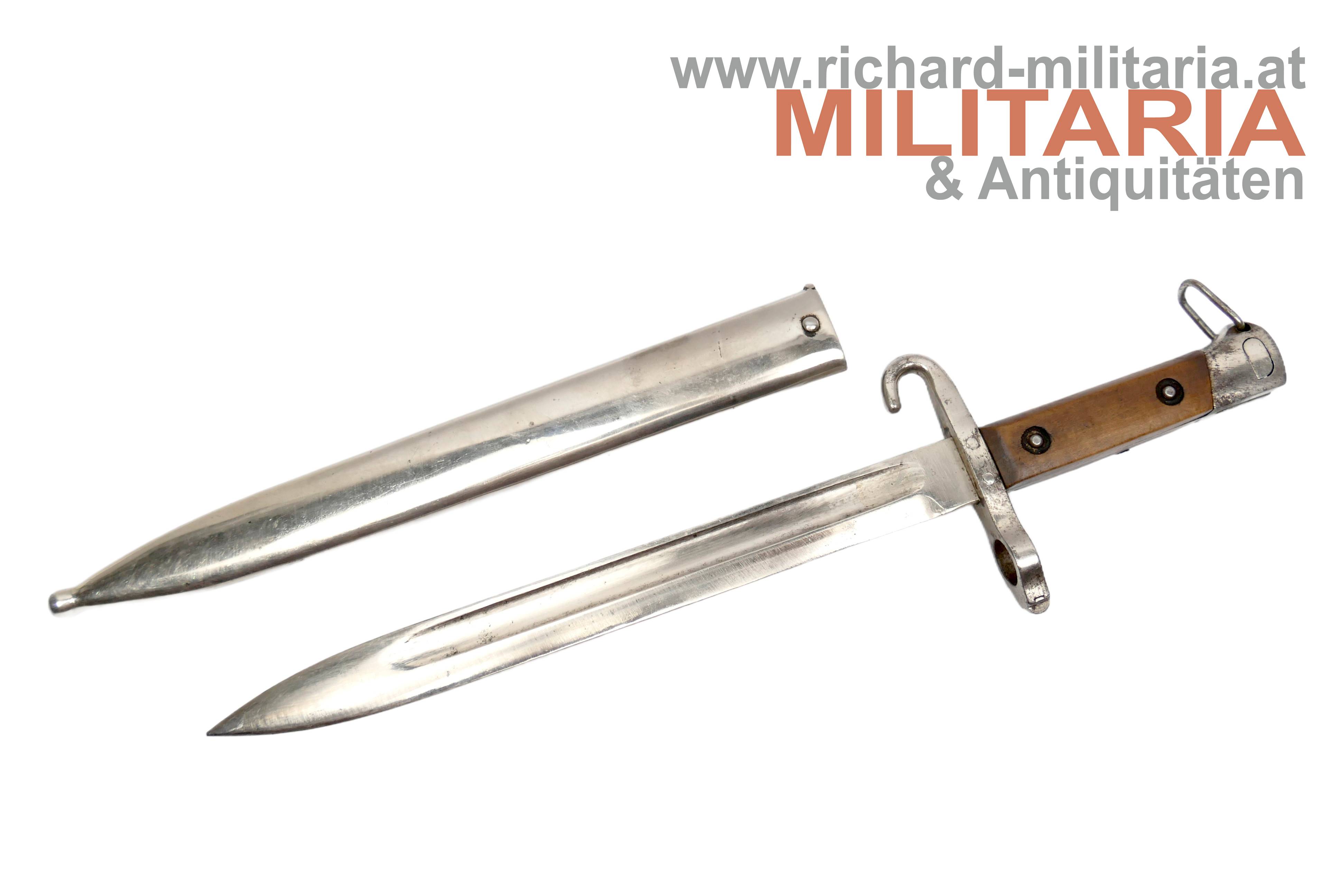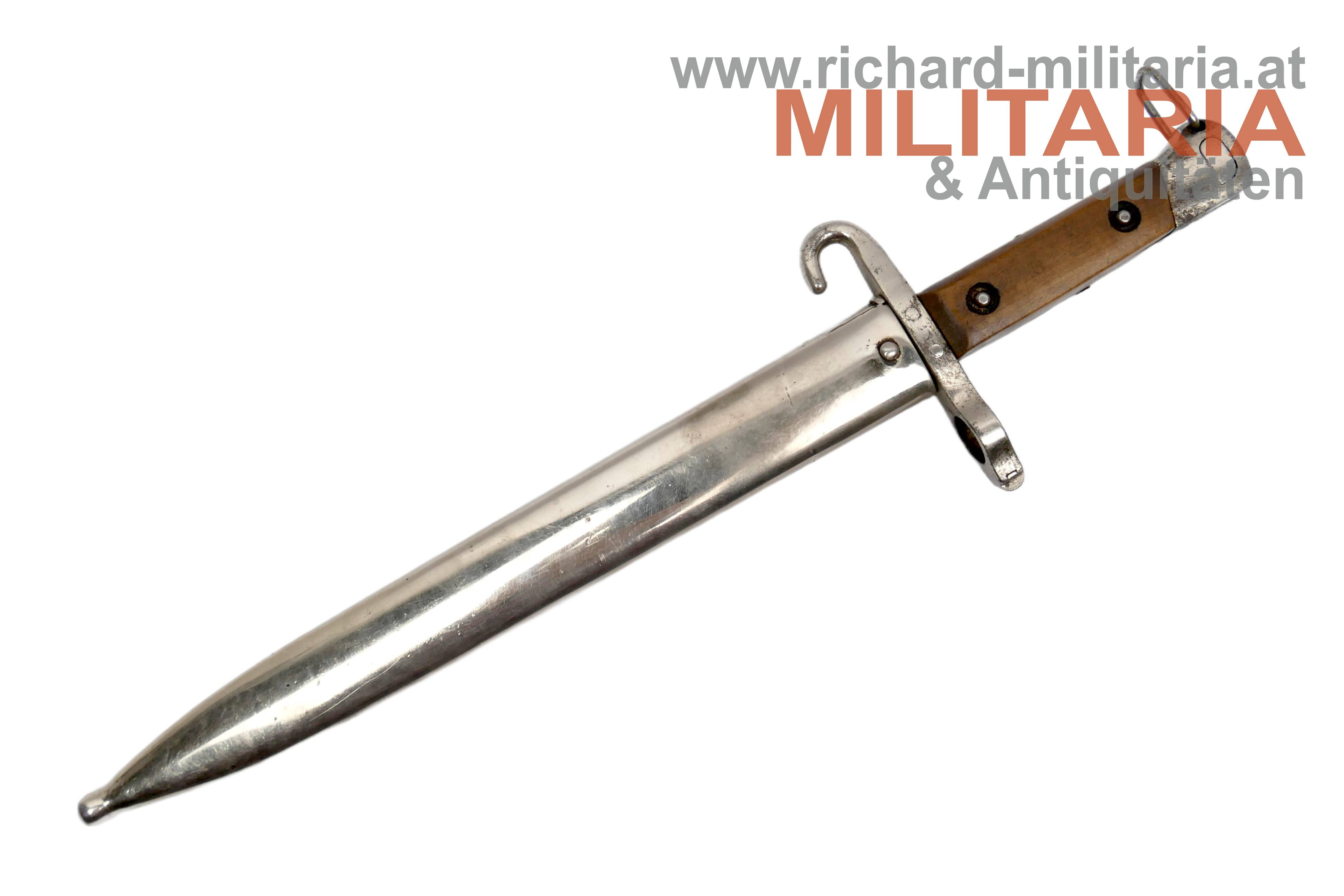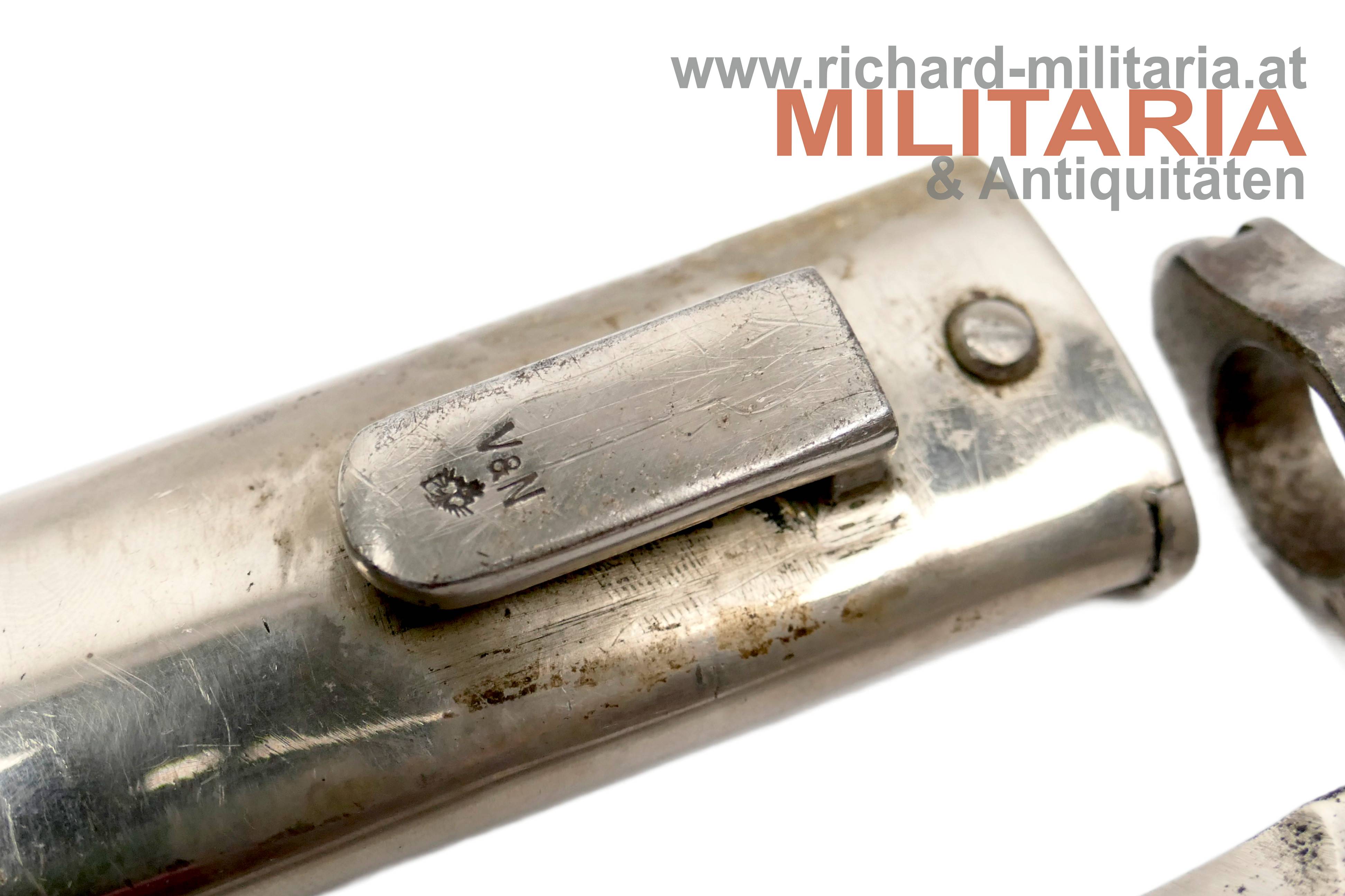 k.u.k. Messerbajonett M1895; vernickelte Klinge in guter Erhaltung mit k.u.k. Armeeabnahme; Scheibenkorn; zweifach vernietete Holzgriffschalen; aufgenagelte Edelweiss; deutlicher Farbunterschied unter der Griffauflage (!); vernickelter Griffkopf mit Portepeehaken; Drücker gängig; vernickelte Scheide in guter Erhaltung und ohne Dellen; am Tragehaken Armeeabnahme und Herstellerstempel "V&N";