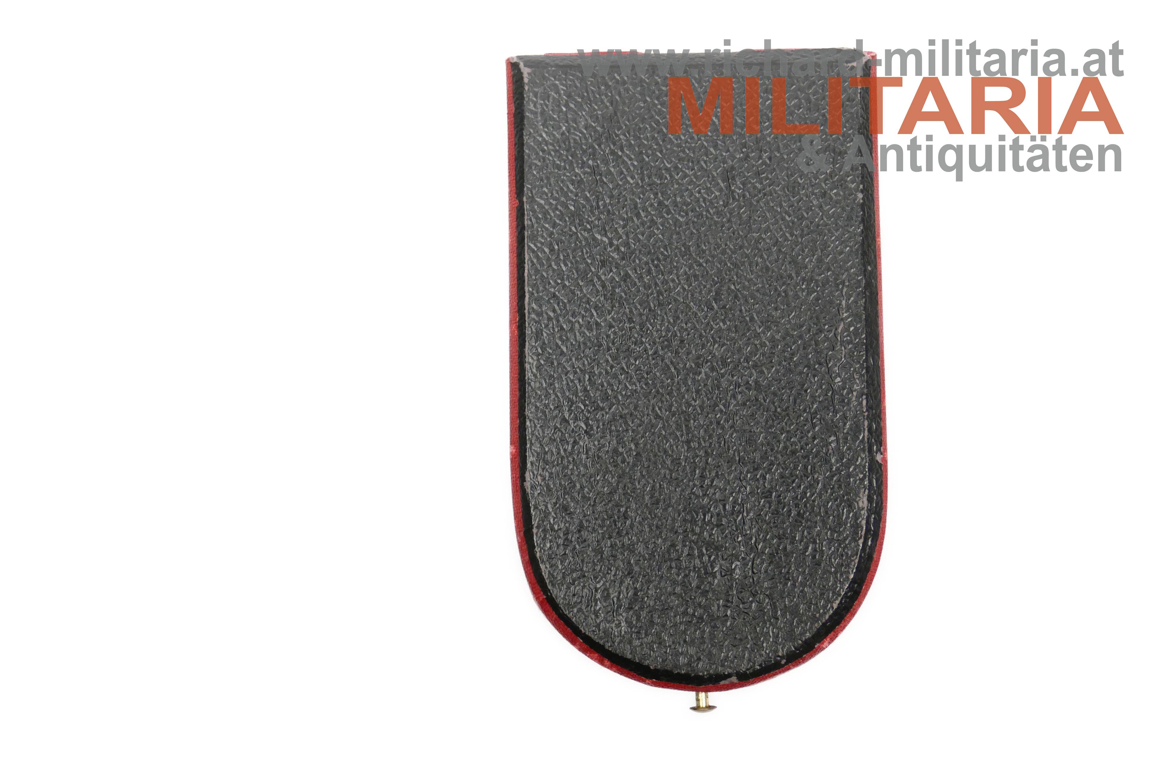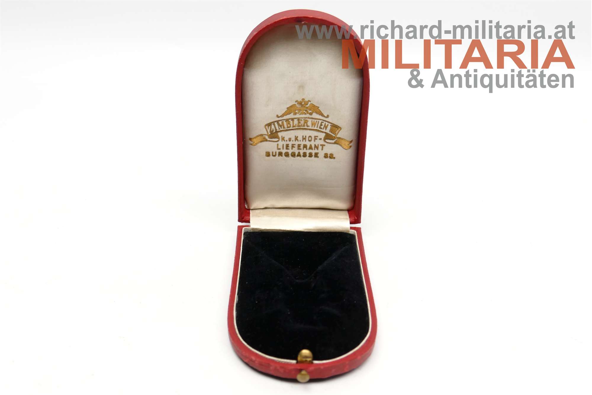 k.u.k. Militärdienstzeichen Offizier 2. Klasse (40 Jahre) mit Etui; Modell 1890-1918; Bronze vergoldet und teilweise emailliert; Emaillierung einwandfrei; Variante mit revers gravierten Kreuzarmen; am originalen gut erhaltenen Band; rotes zugehöriges Etui von Zimbler - dieses mit leichteren Abnutzungsspuren;