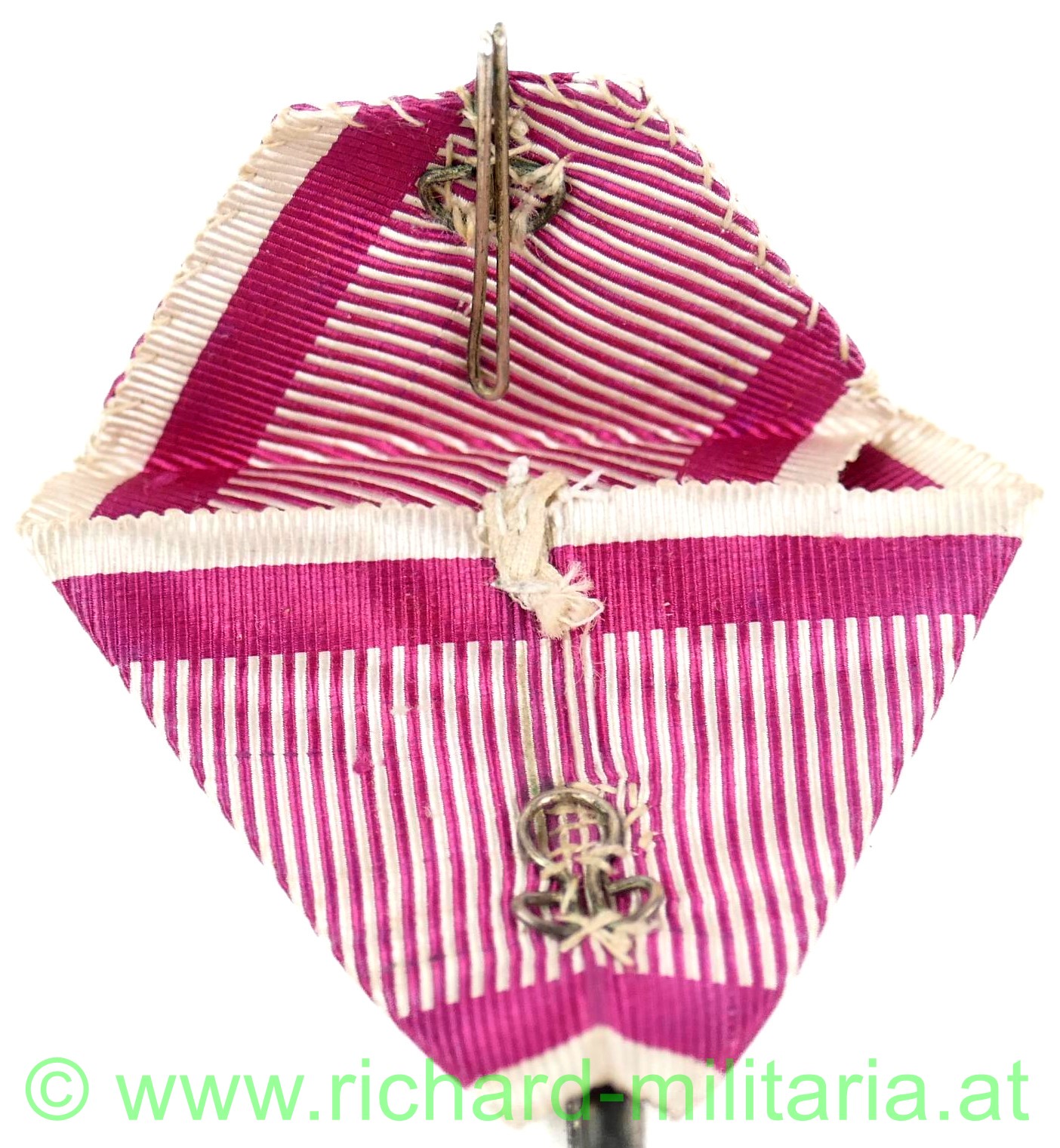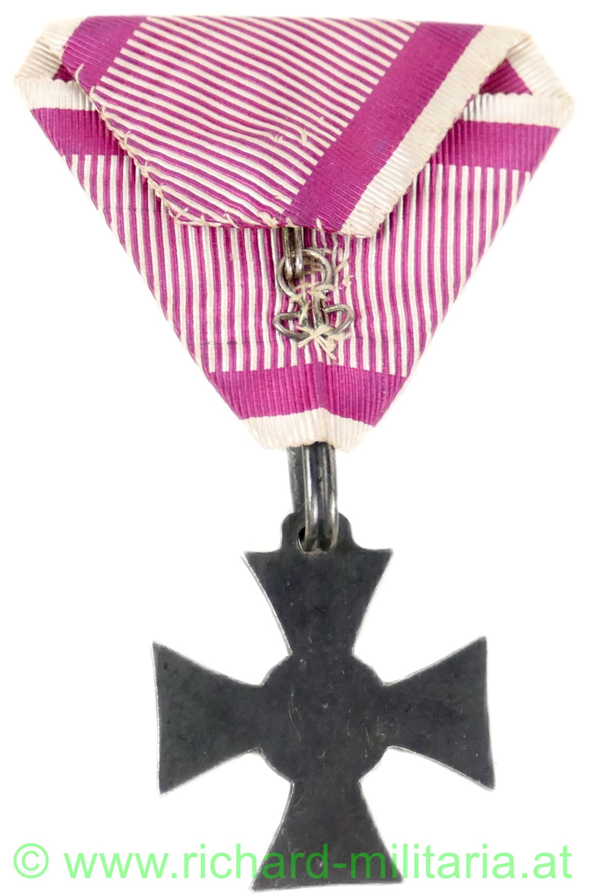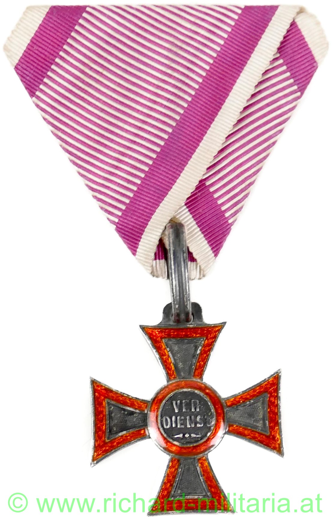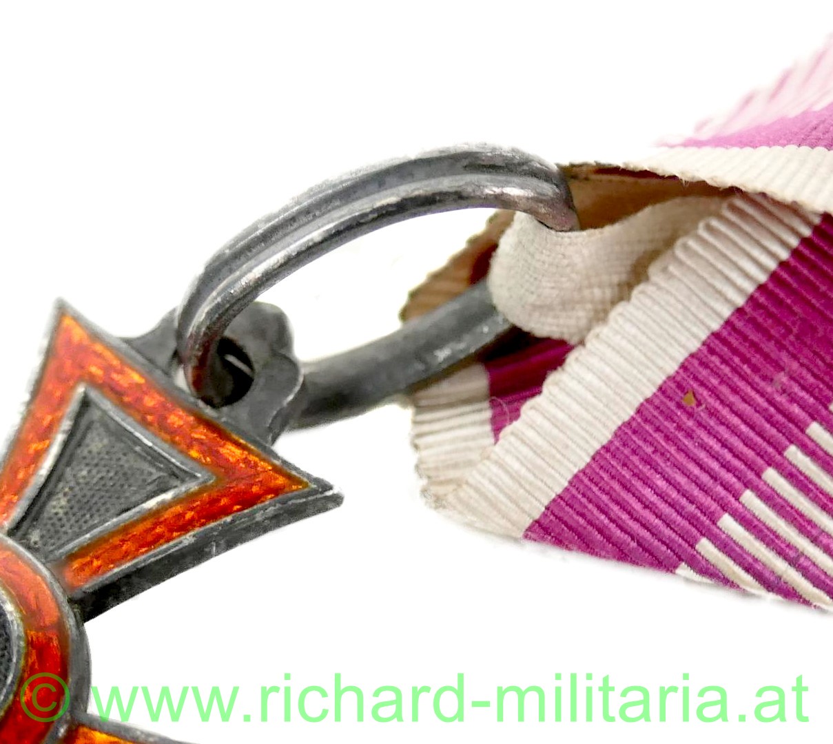 k.u.k. Militärverdienstkreuz 1. Modell 1849; Silber unpunziert; Emaillierung in perfekter Erhaltung (!); Rückseite glatt; mit großem ovalen Bandring; originales, frühes, violettes Seidenband mit dem Bandring vernäht im neuwertigen Zustand (!);