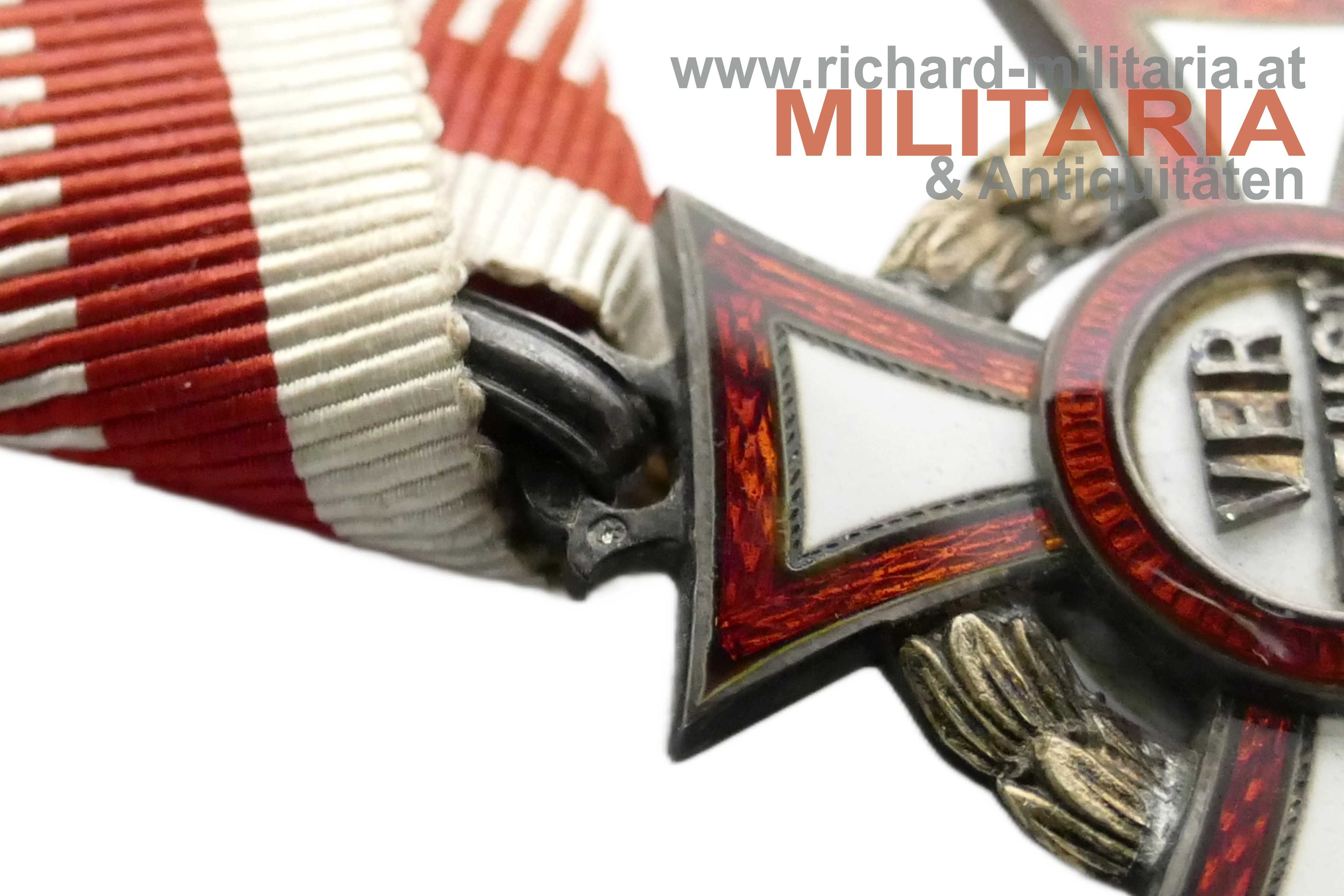 k.u.k. Militärverdienstkreuz 3. Klasse mit Kriegsdekoration; Herstellerpunzierung "FR" in der Raute sowie Windhundpunzierung und Kontrollamtspunzierung "A"; abgesehen von einem oberflächlichen Kratzer am rechten Kreuzarm revers in einwandfreier Erhaltung; Kriegsdekoration mit Goldauflage; Bandring original mit dem Band vernäht;
