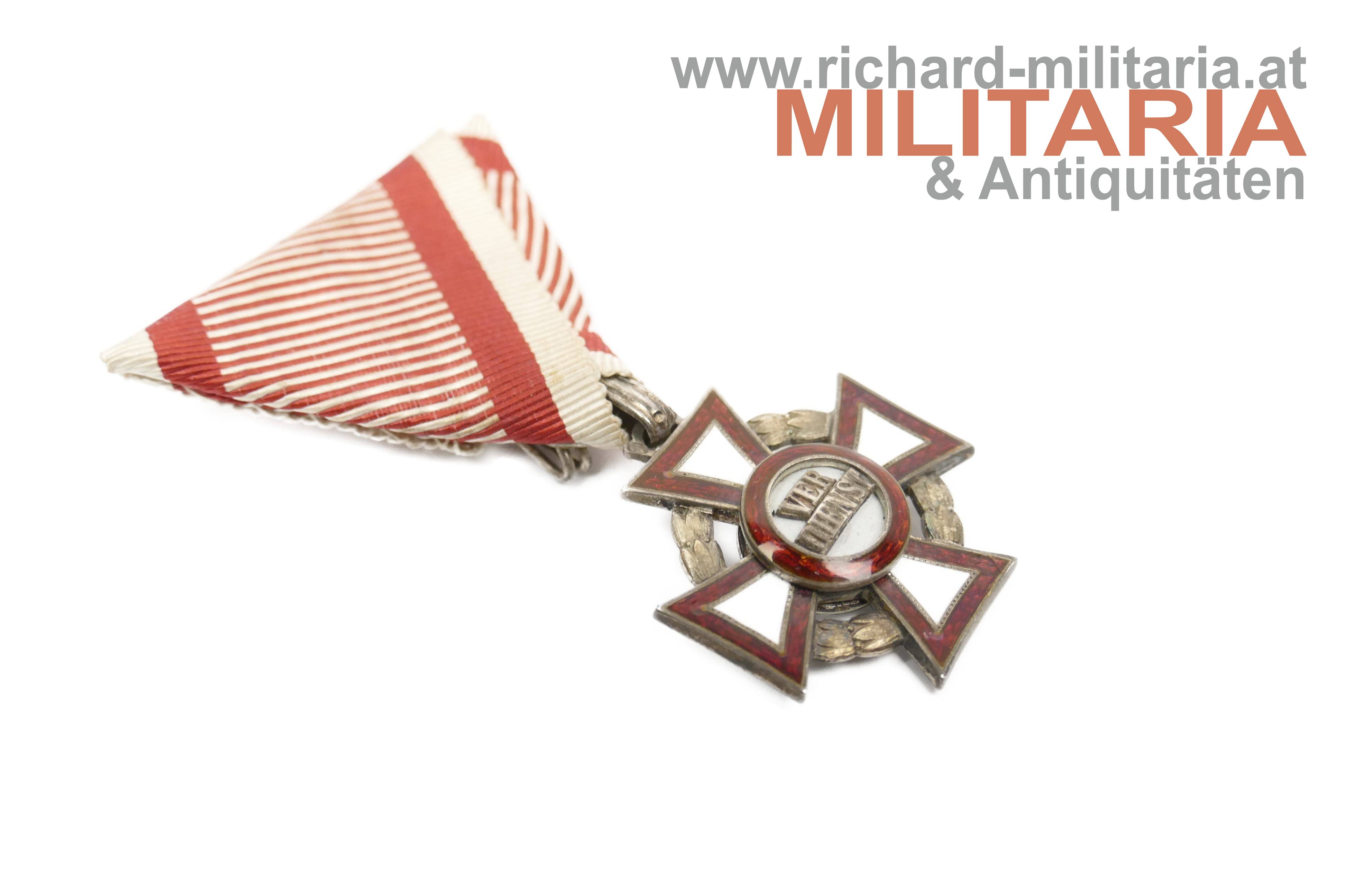 k.u.k. Militärverdienstkreuz 3. Klasse mit Kriegsdekoration; mit Dianakopfpunzierung und Herstellerpunzierung "VM" (V. Mayer) auf der Öse; Bandring mit Kontrollamtspunzierung "A"; avers mit mehreren oberflächlichen Emailbeschädigungen; revers einwandfrei; original mit dem Band vernäht;