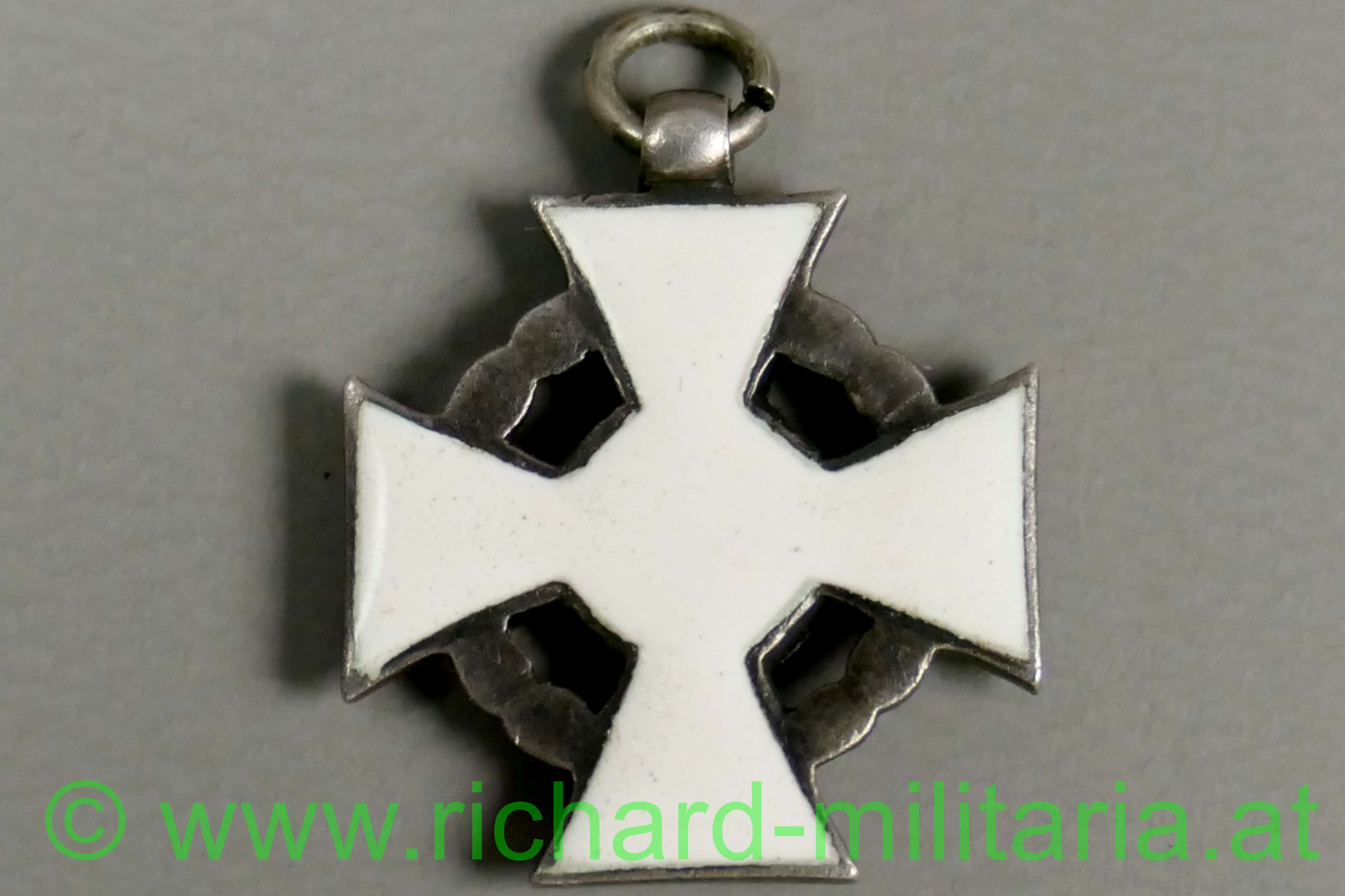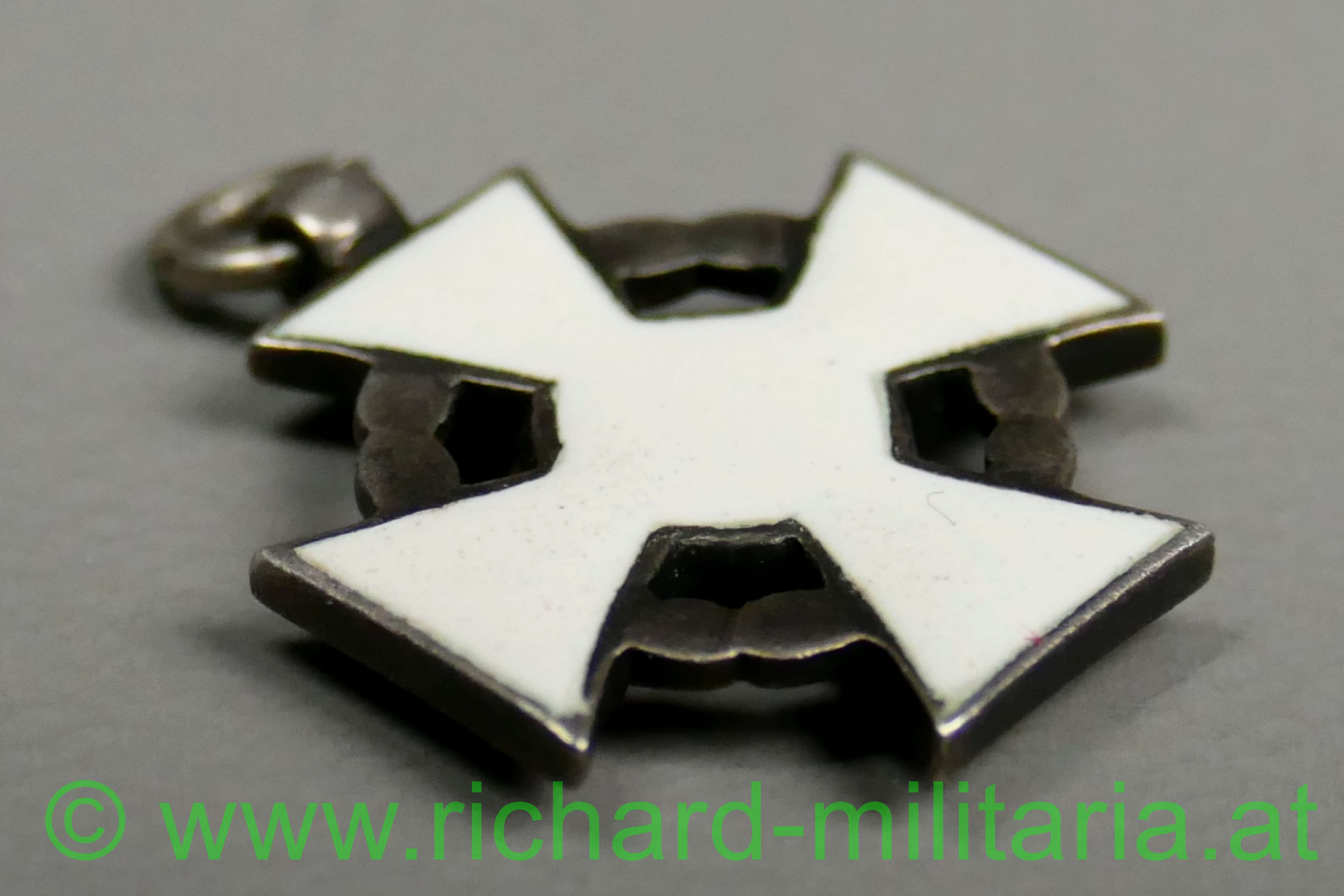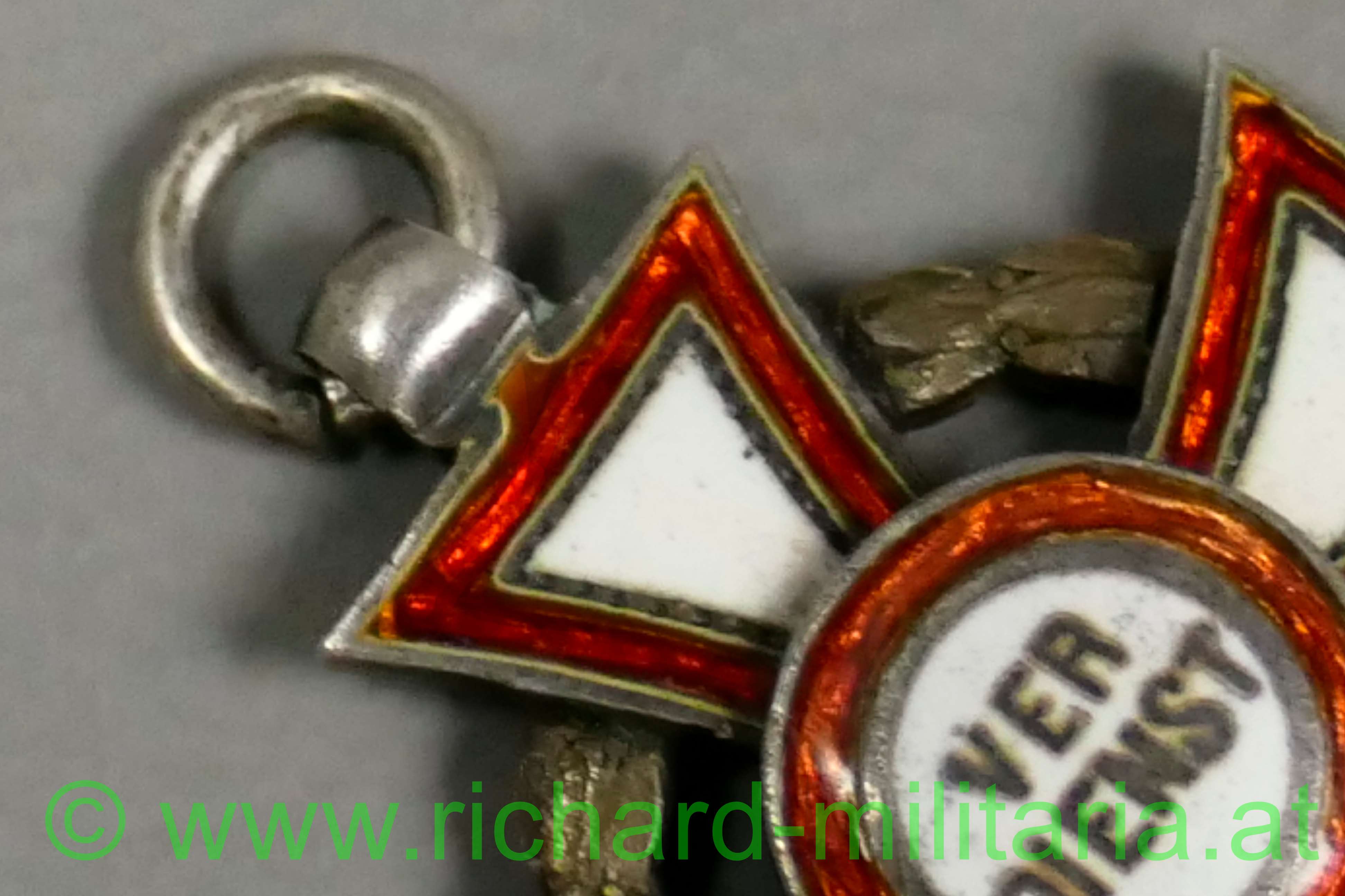k.u.k. Militärverdienstkreuz III. Klasse mit Kriegsdekoration - große Miniatur; Silber und beidseitig emailliert; Vergoldung der KD fast komplett vergangen; ohne Mittelmedaillon revers - im Stil des 2. Modells; fein gefertigte Miniatur; Durchmesser: 1,7 cm;