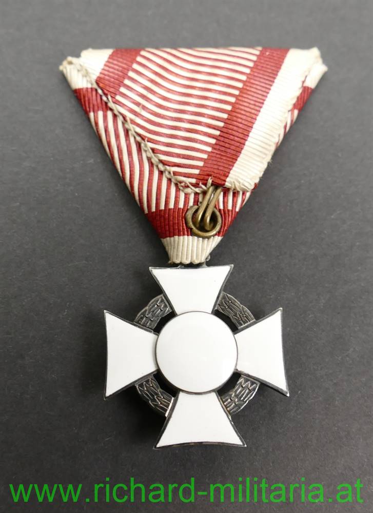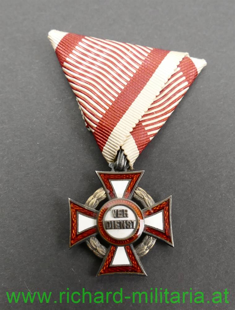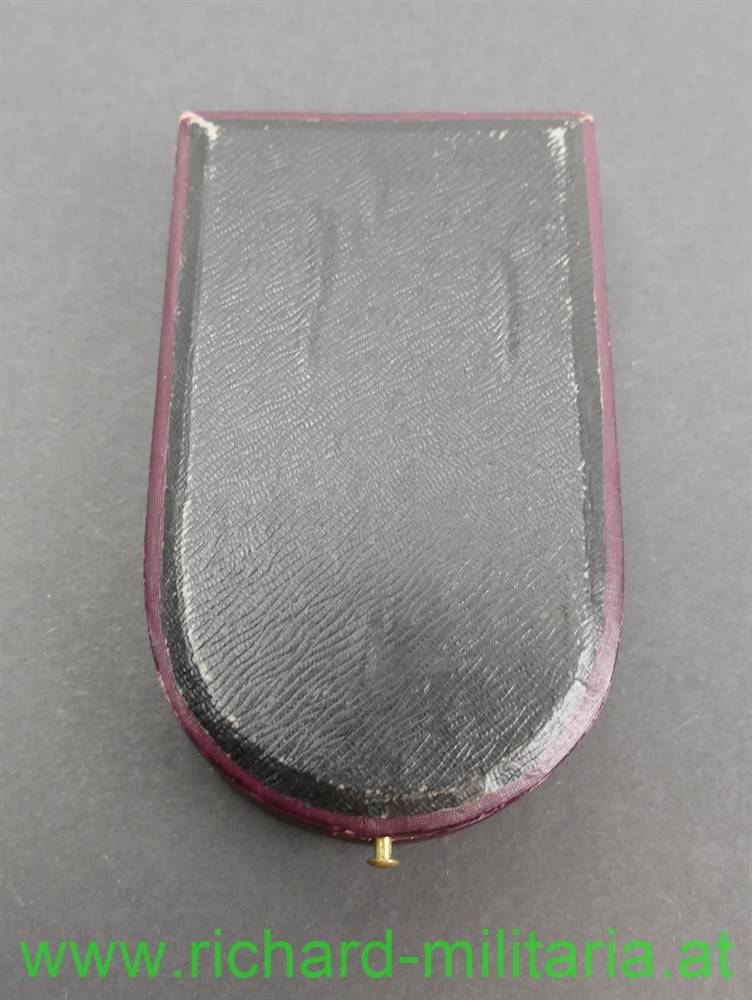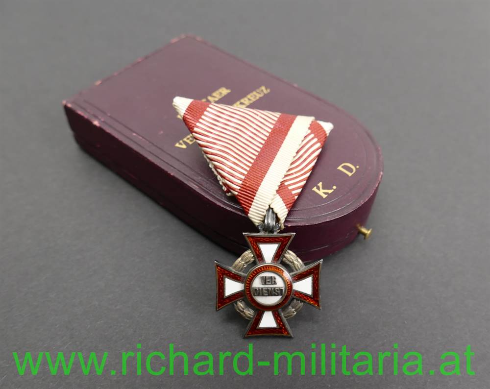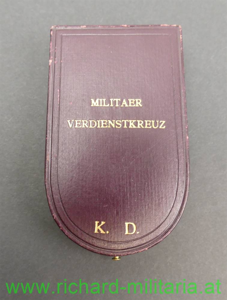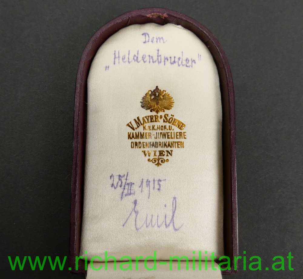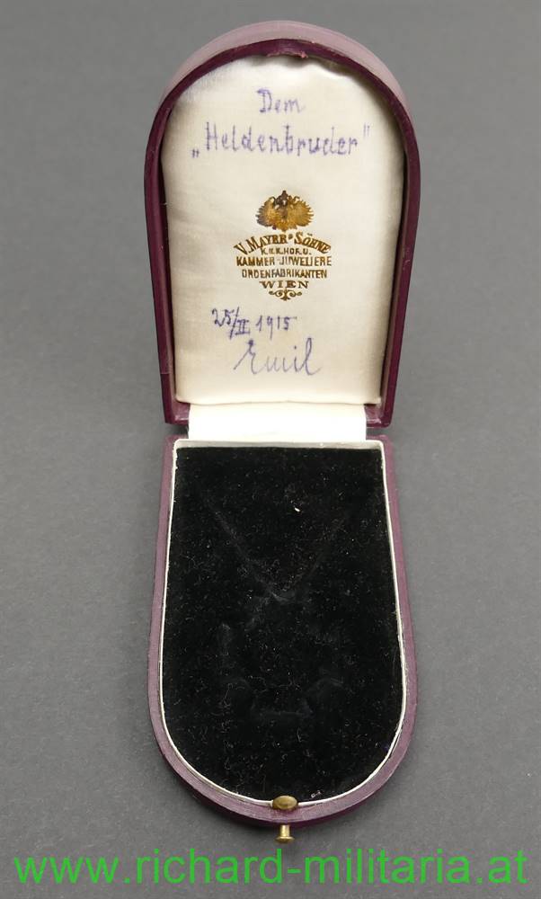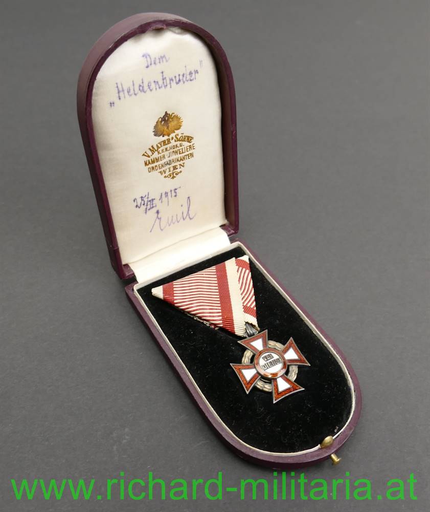 k.u.k. Militärverdienstkreuz III. Klasse mit Kriegsdekoration und Etui; mit Herstellerpunzierung "AE" (Köchert) und Dianakopfpunzierung (950/000 (!)) 1872 bis 1922 auf der Trageöse; Emaillierung unbeschädigt; am originalen Band; rotbraunes Etui von V. Mayer und Söhne mit der goldenen Aufschrift "Militaer Verdienstkreuz K. D."; im Etuideckel die Widmung "Dem Heldenbruder" und "25/II 1915" mit einer Unterschrift neben dem Datum;