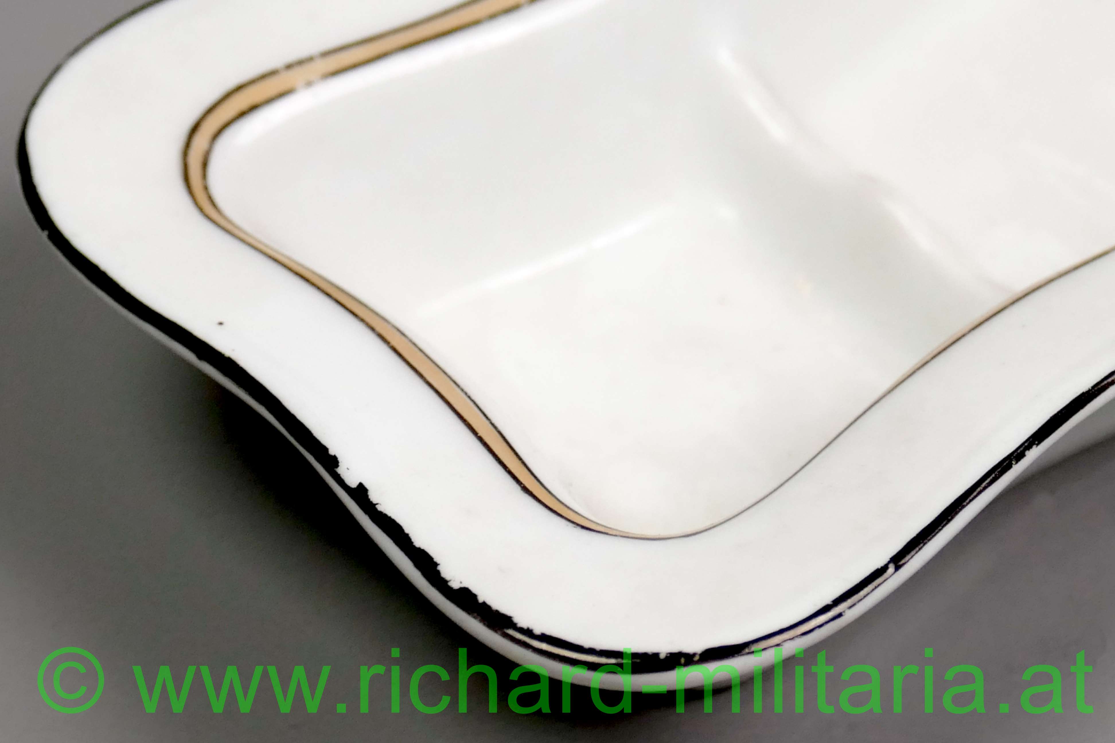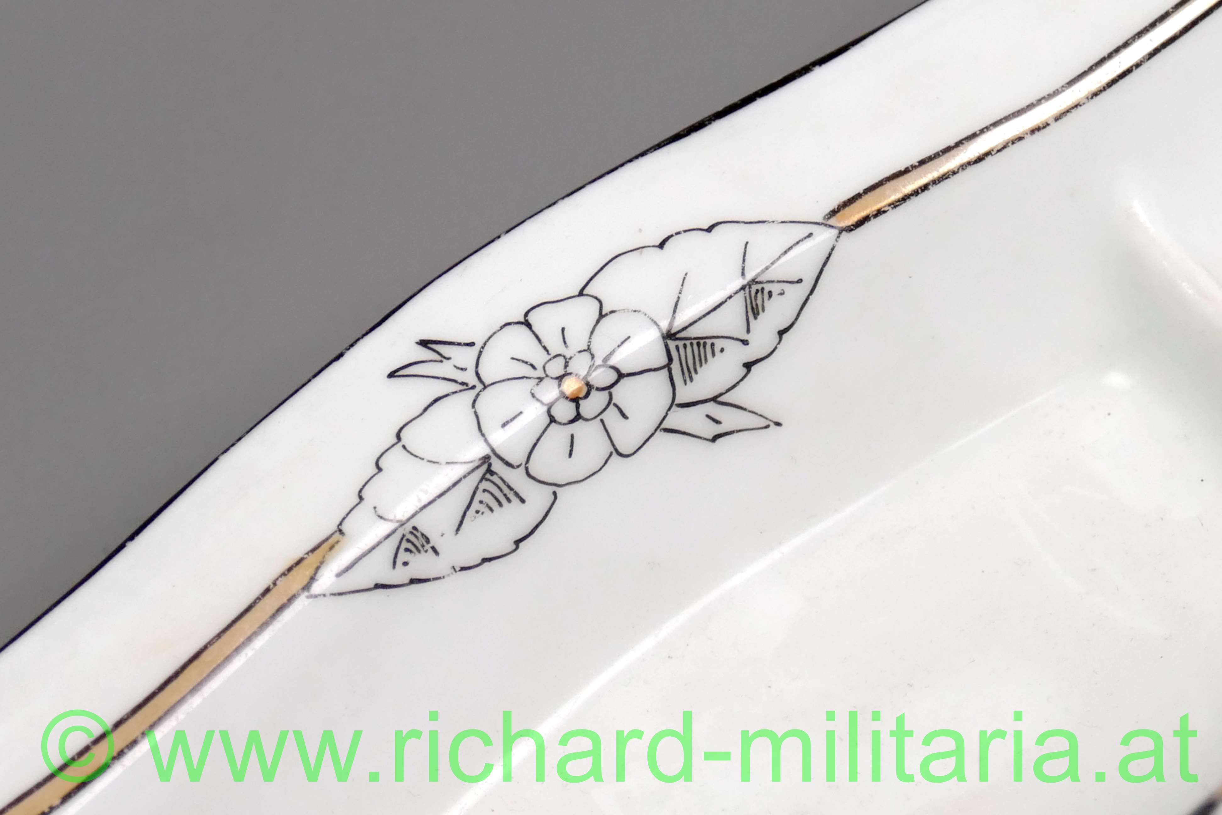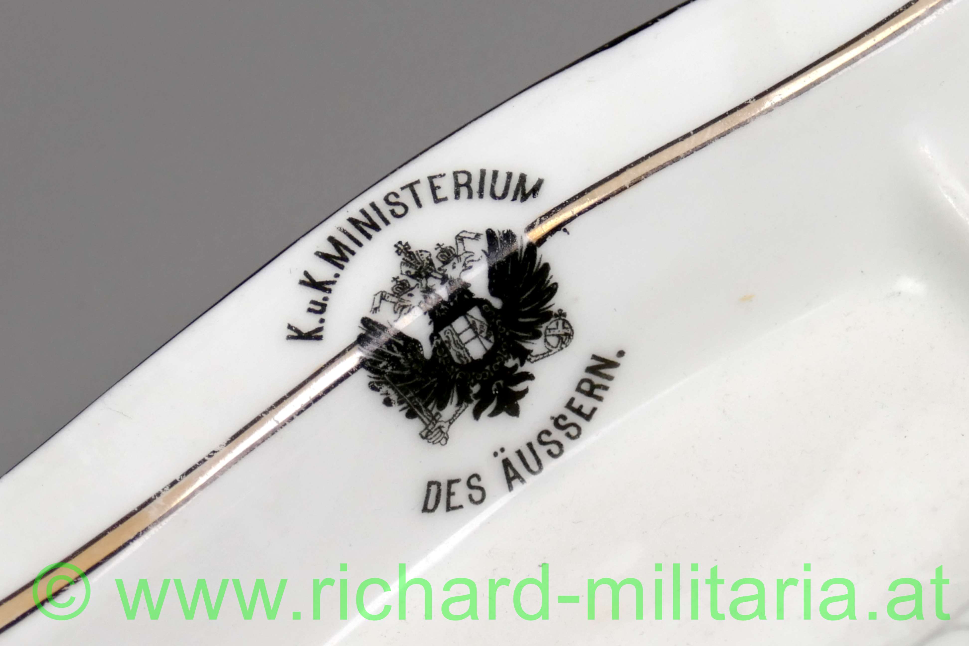 k.u.k. Ministerium des Äussern - Porzellanschale; Porzellan an den Ränder schwarz und gold verziert, sowie mit einer kleinen floralen Verzierung; Doppeladler mit der Beschriftung "k.u.k. Ministerium - des Äussern."; rückseitig mit 1882 datiert; auf der Unterseite mit einer kleinen abgeschlagenen Stelle; Maße: 20,5 x 8,5cm;