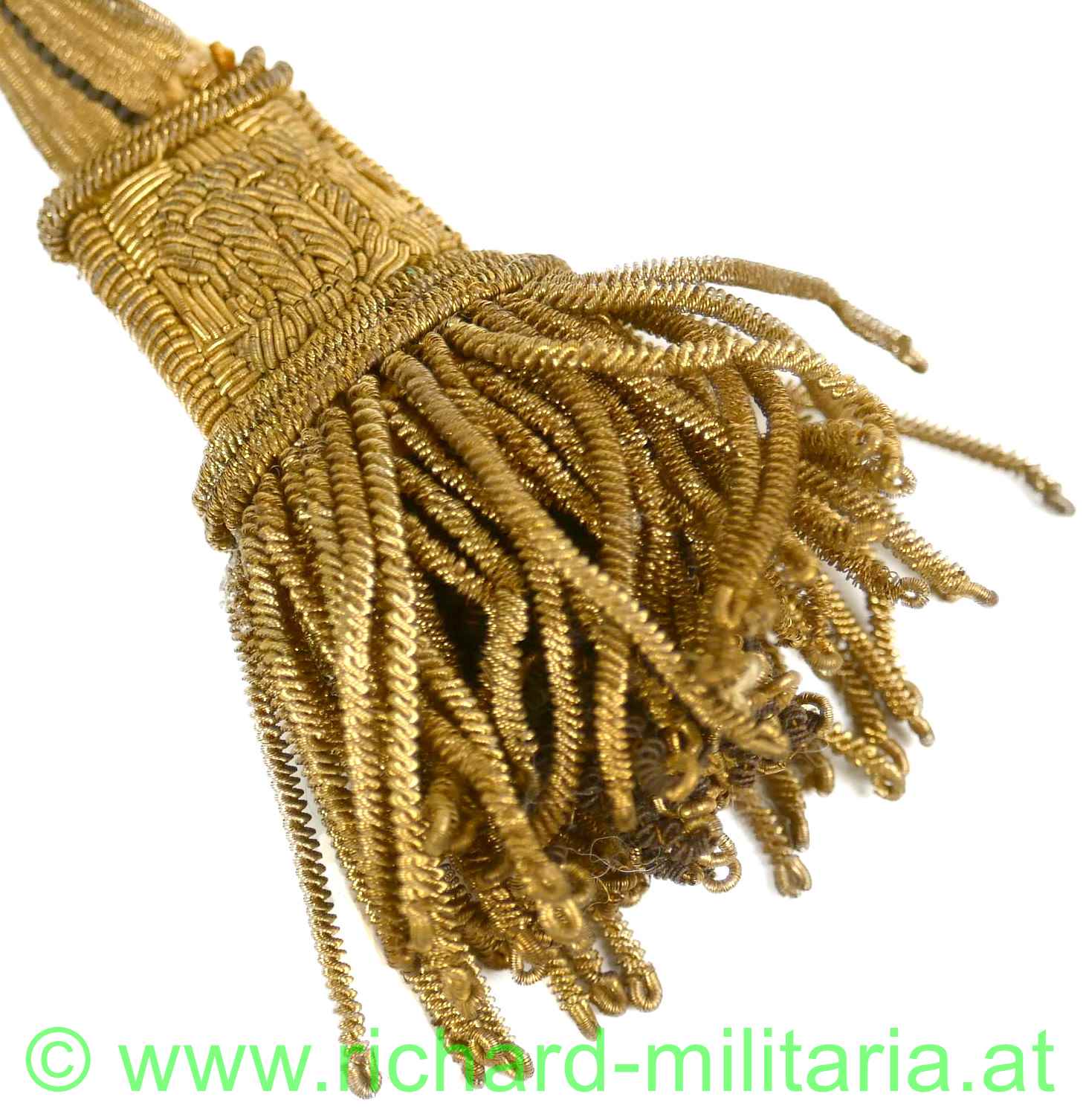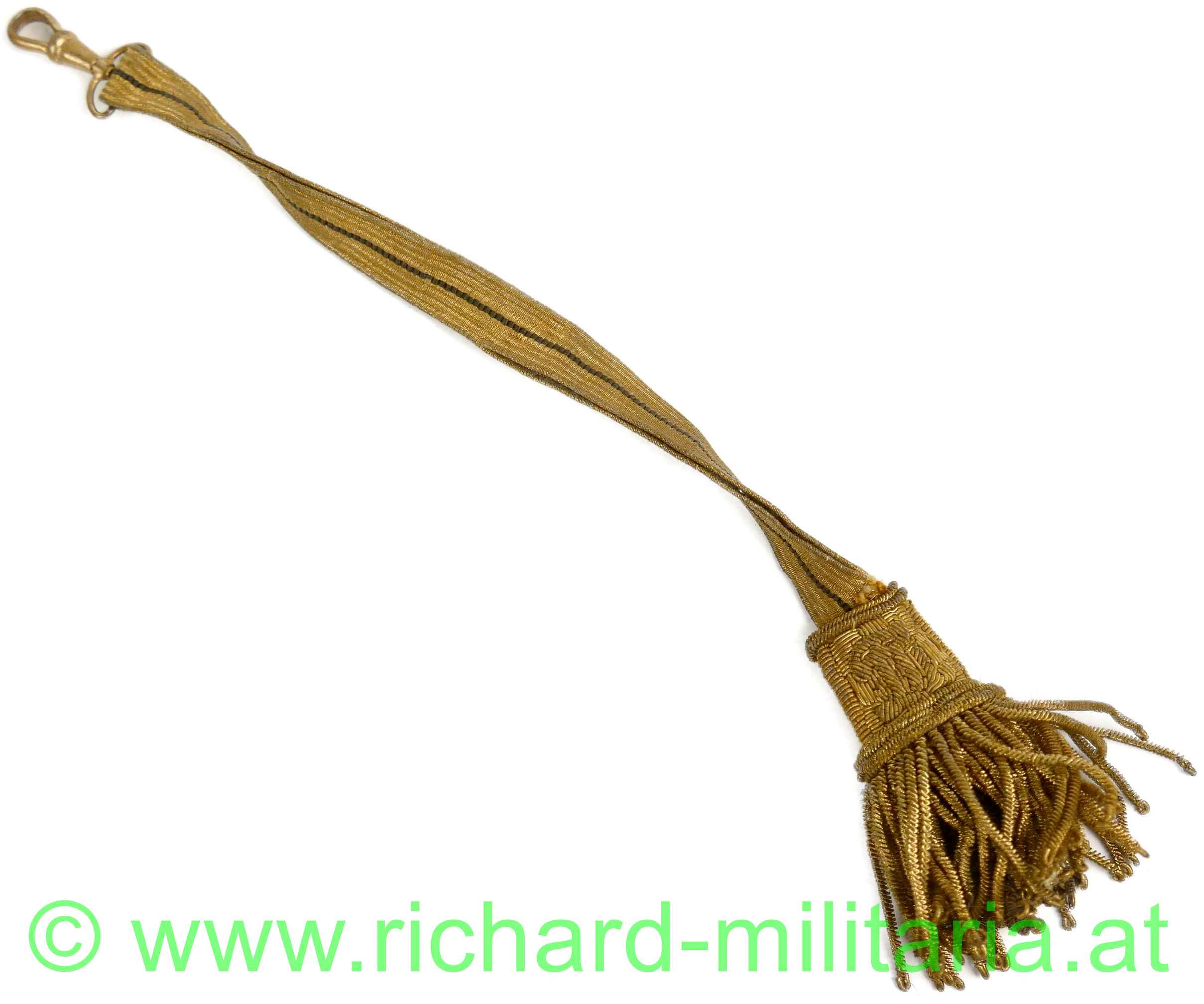 k.u.k. Offiziersportepee - Bierzipf, Goldgespinst mit einem schwarzen Durchzug u. Karabinerhaken, am Stängel eingestickt: Doppeladler und FJI, goldene gedrehte Fransen,