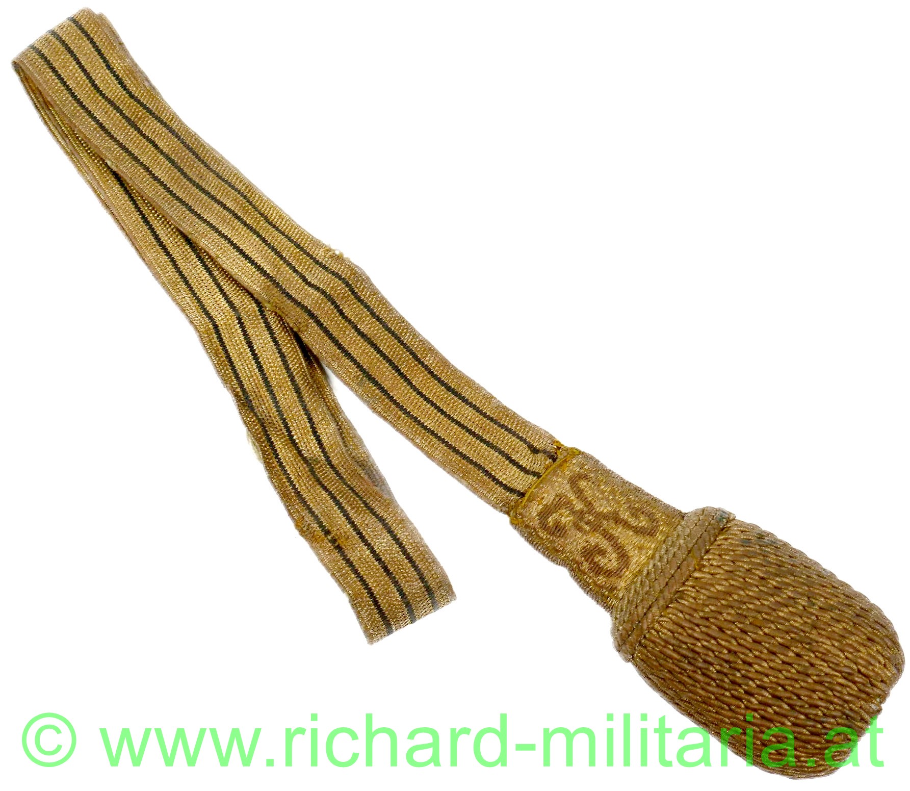 k.u.k. Portepee in geschlossener Form für einen Offizier; Modell Kaiser Karl, Band aus Metallfaden mit 3 schwarzen Durchzügen, Quastenknopf beidseitig mit "K" - Kaiser Karl bestickt; leichte Tragespuren,