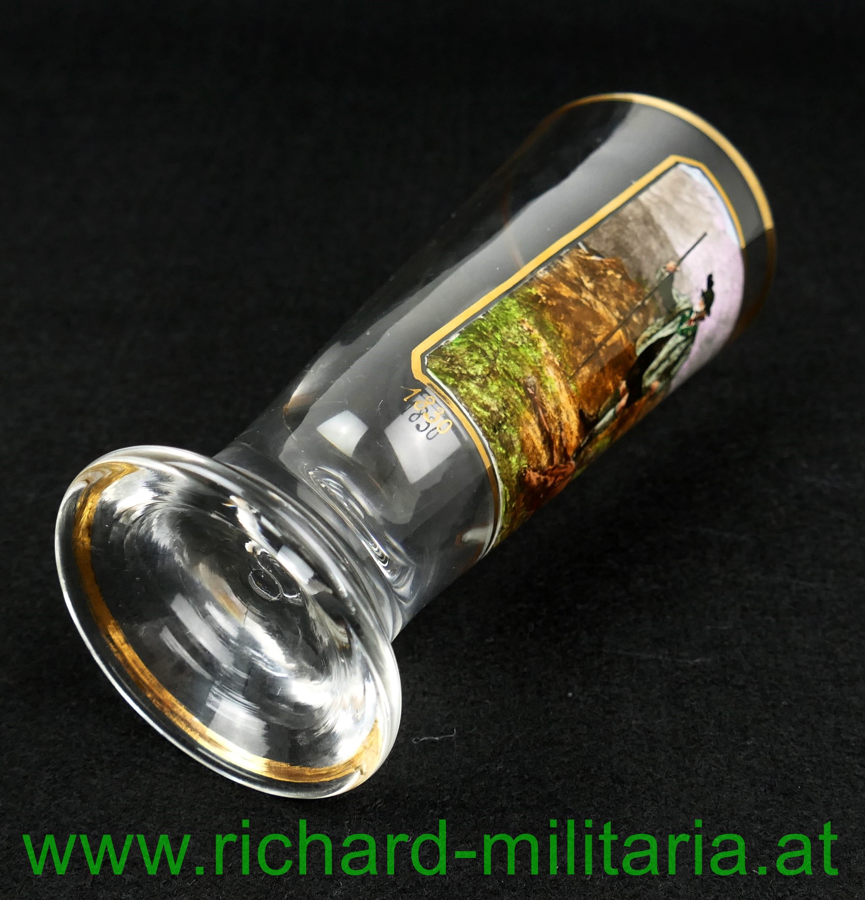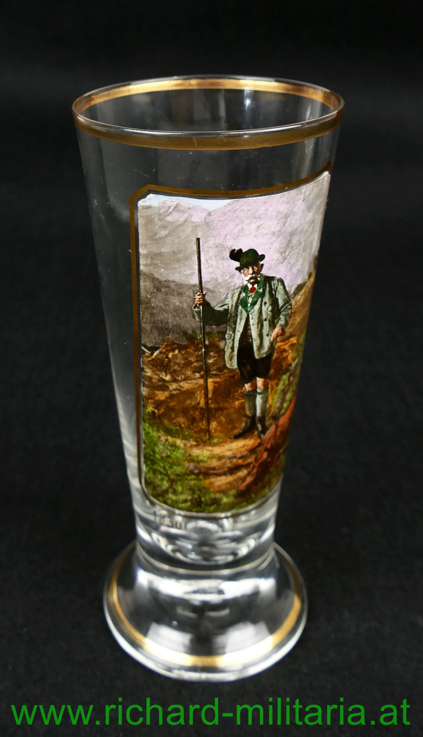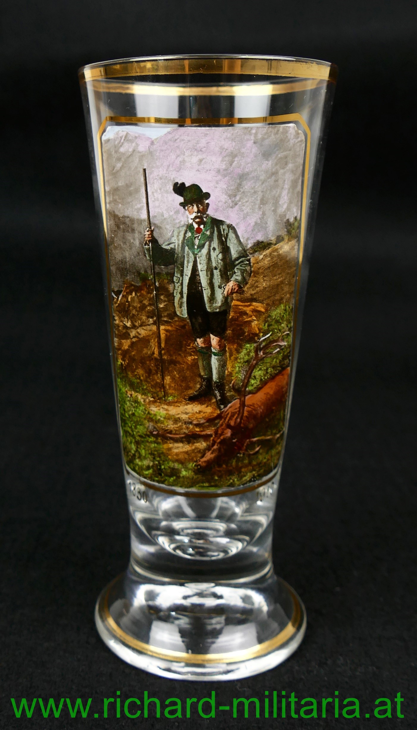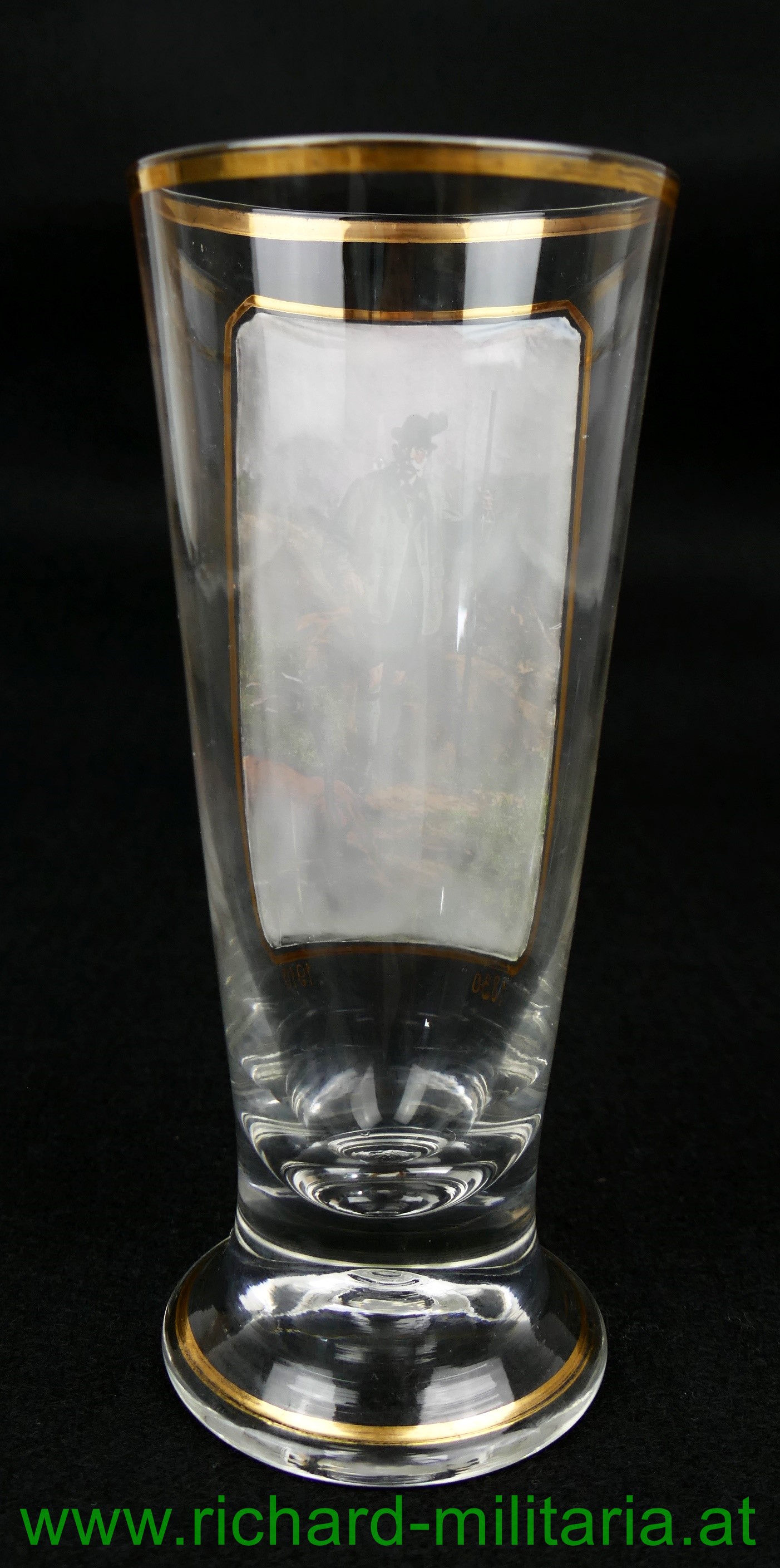 k.u.k. patriotische Bierflöte Kaiser Franz Josef 1830-1910, farbliche Darstellung des Kaisers vor einem erlegten Hirsch - das Bild mit einem Goldrahmen eingefasst, Glas ist oben und unten ebenfalls mit einem Goldrand versehen;