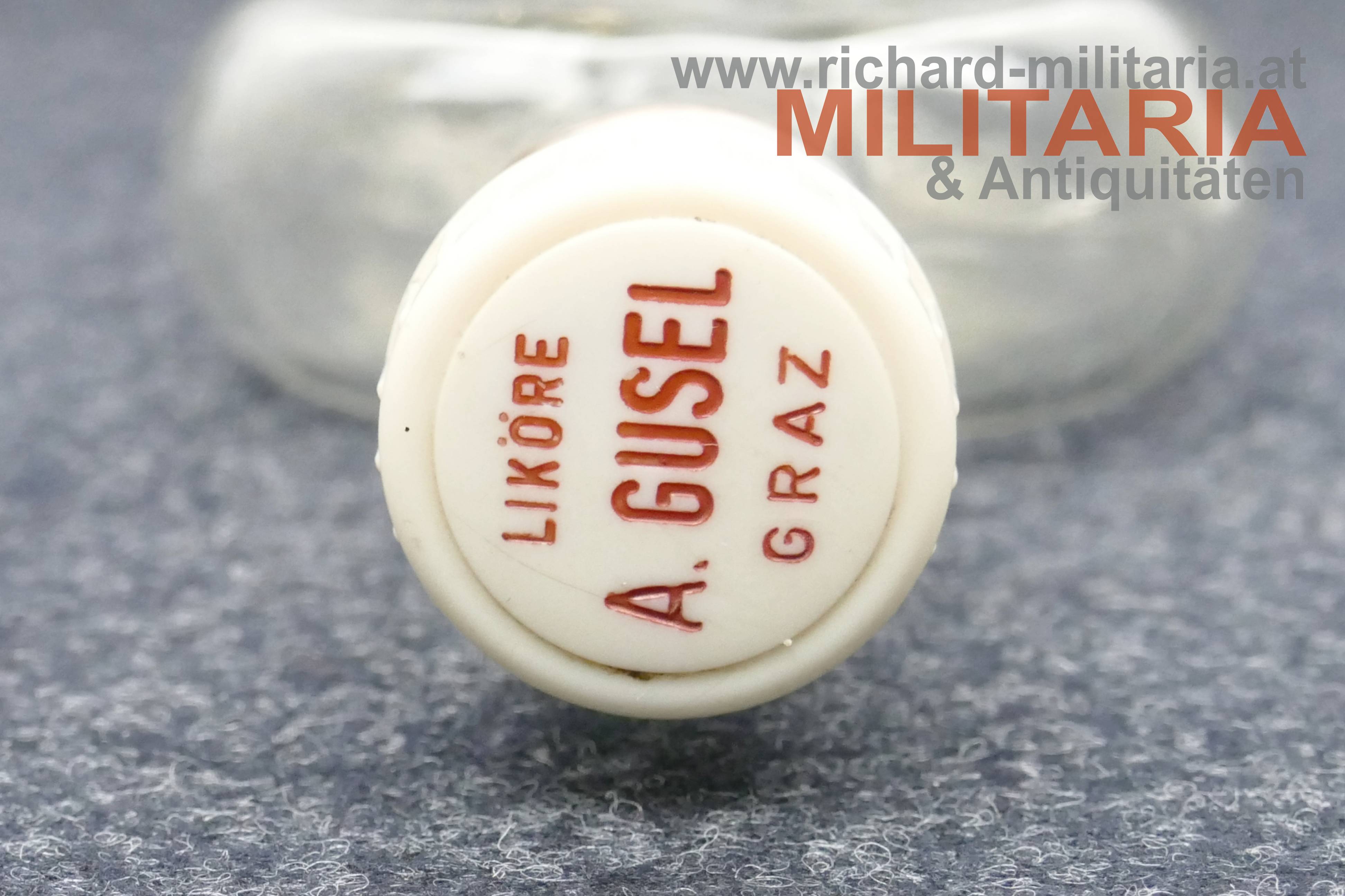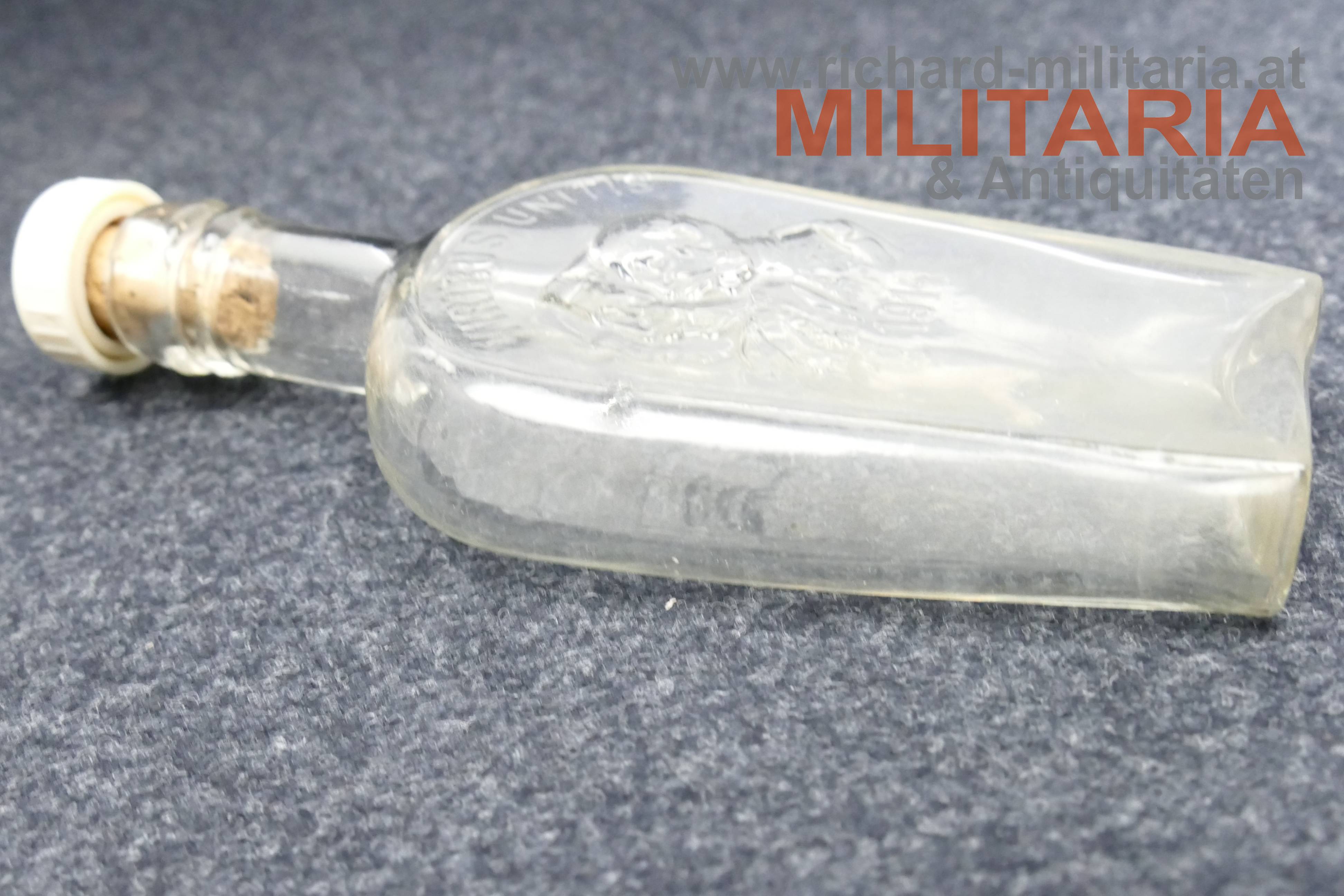 k.u.k. patriotische Flasche - Kaiser Franz Josef und Wilhelm - 1914 - Viribus Unitis; Glas; Stöpsel mit der Aufschrift "Liköre A. Gusel Graz";