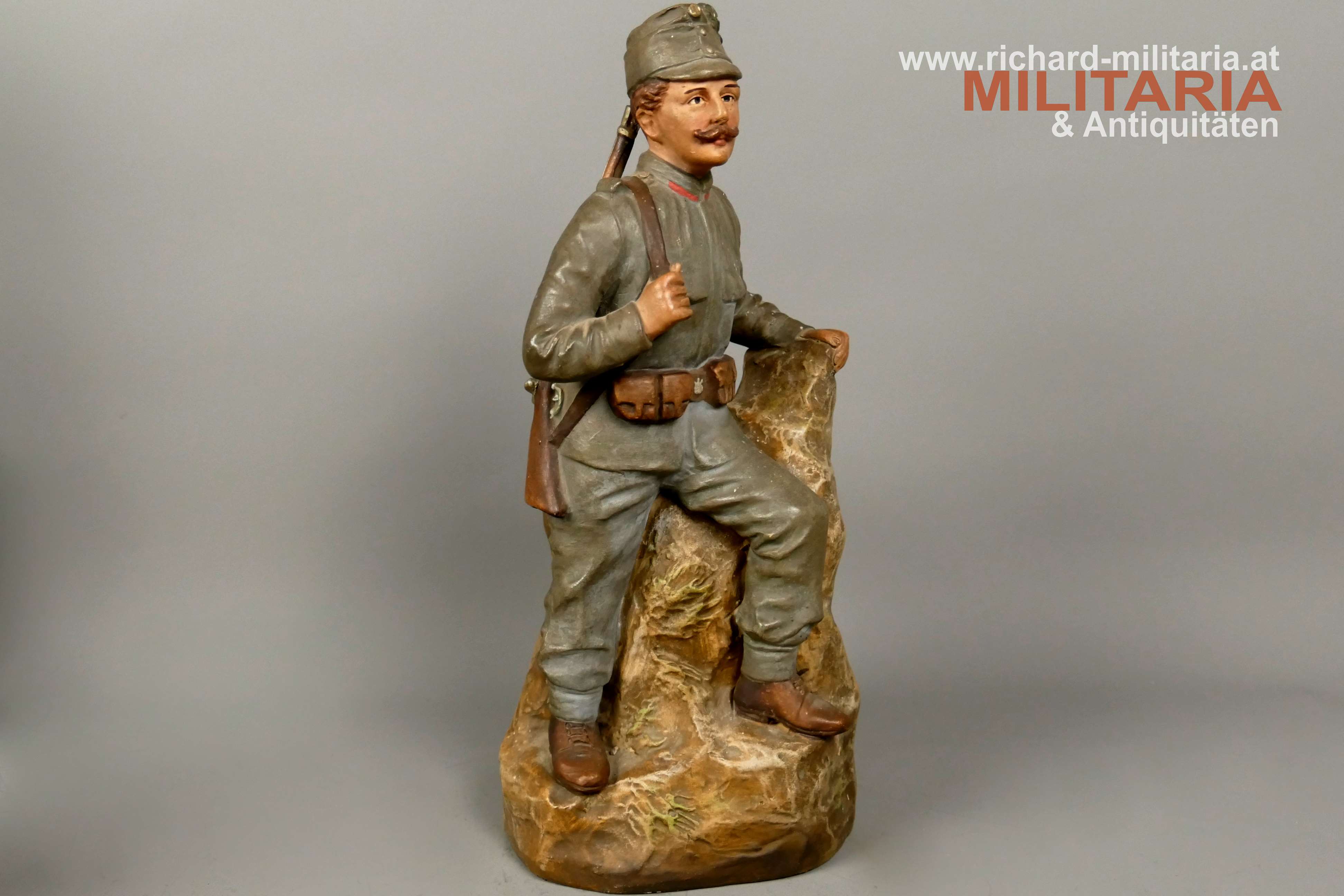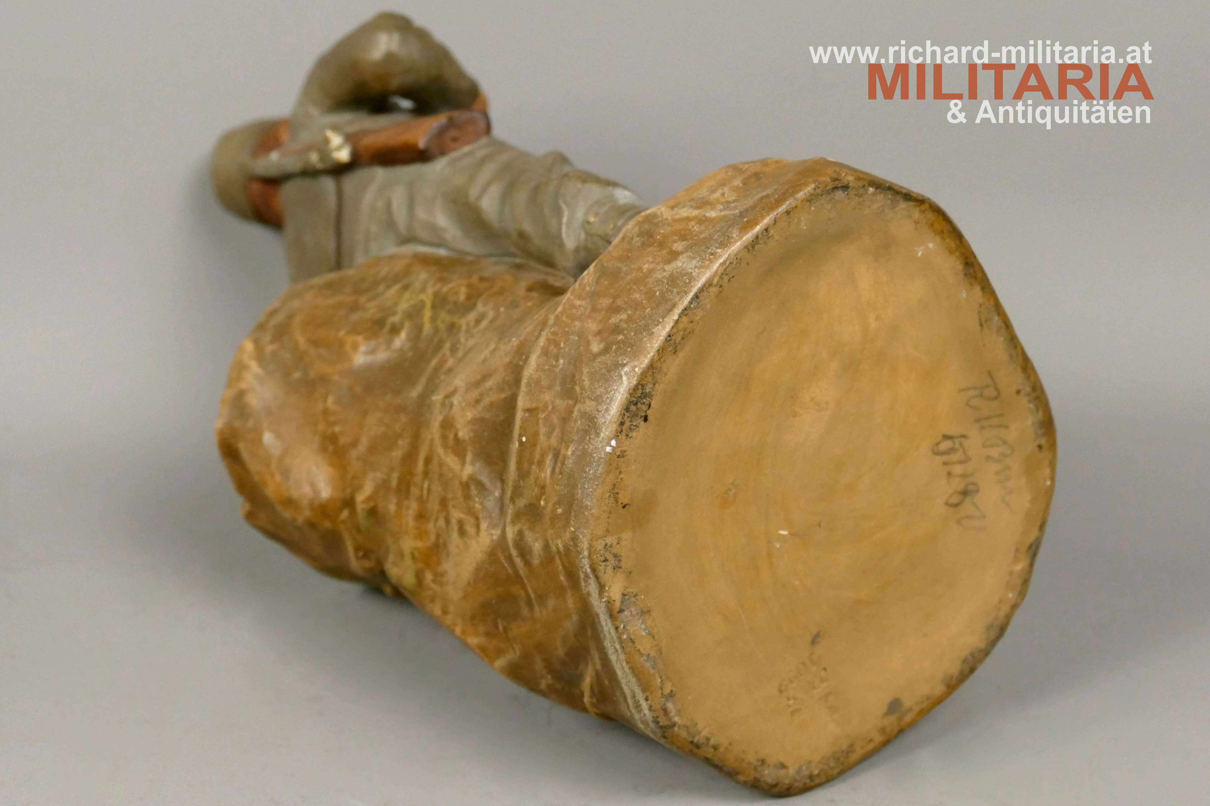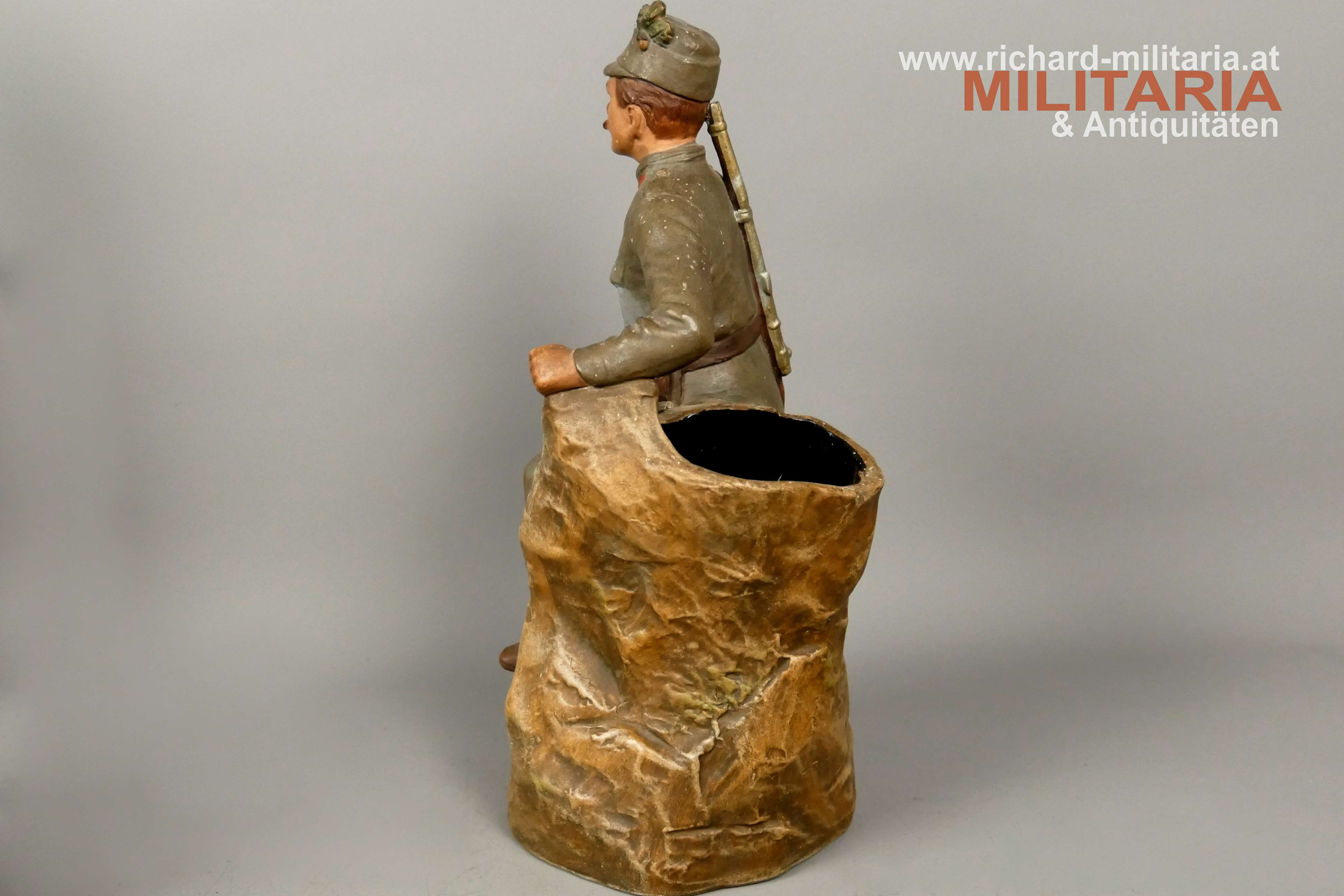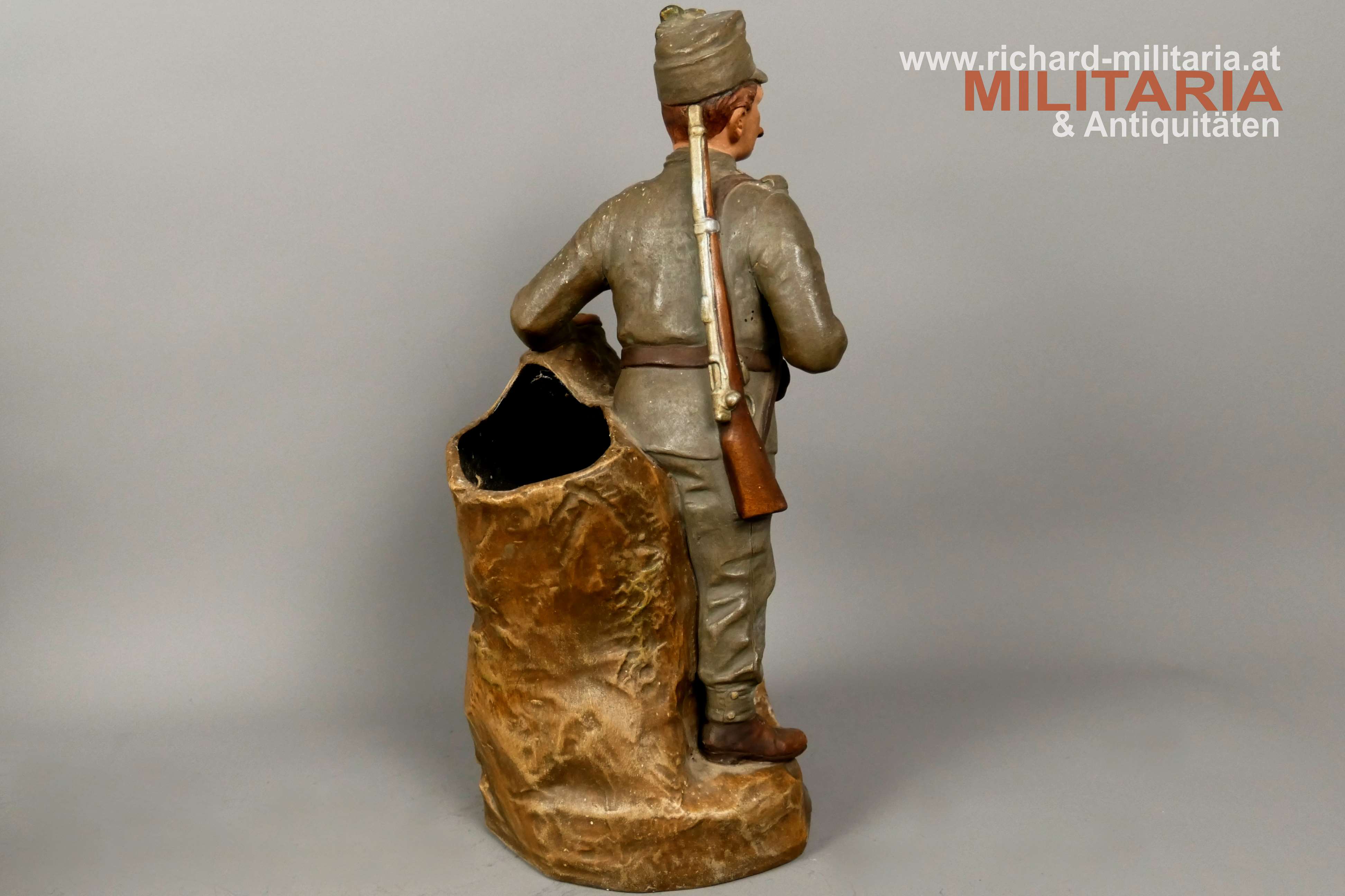 k.u.k. patriotische Vase - Infanterist, Bisquitporzellan bemalt, k.u.k. Infanterist in voller Adjustierung und Bewaffnung an einen Felsen lehnend, "Felsen" offen für die Blumen, Bodenstempel: "Austria JM6 - 1029", angeschmutzt,