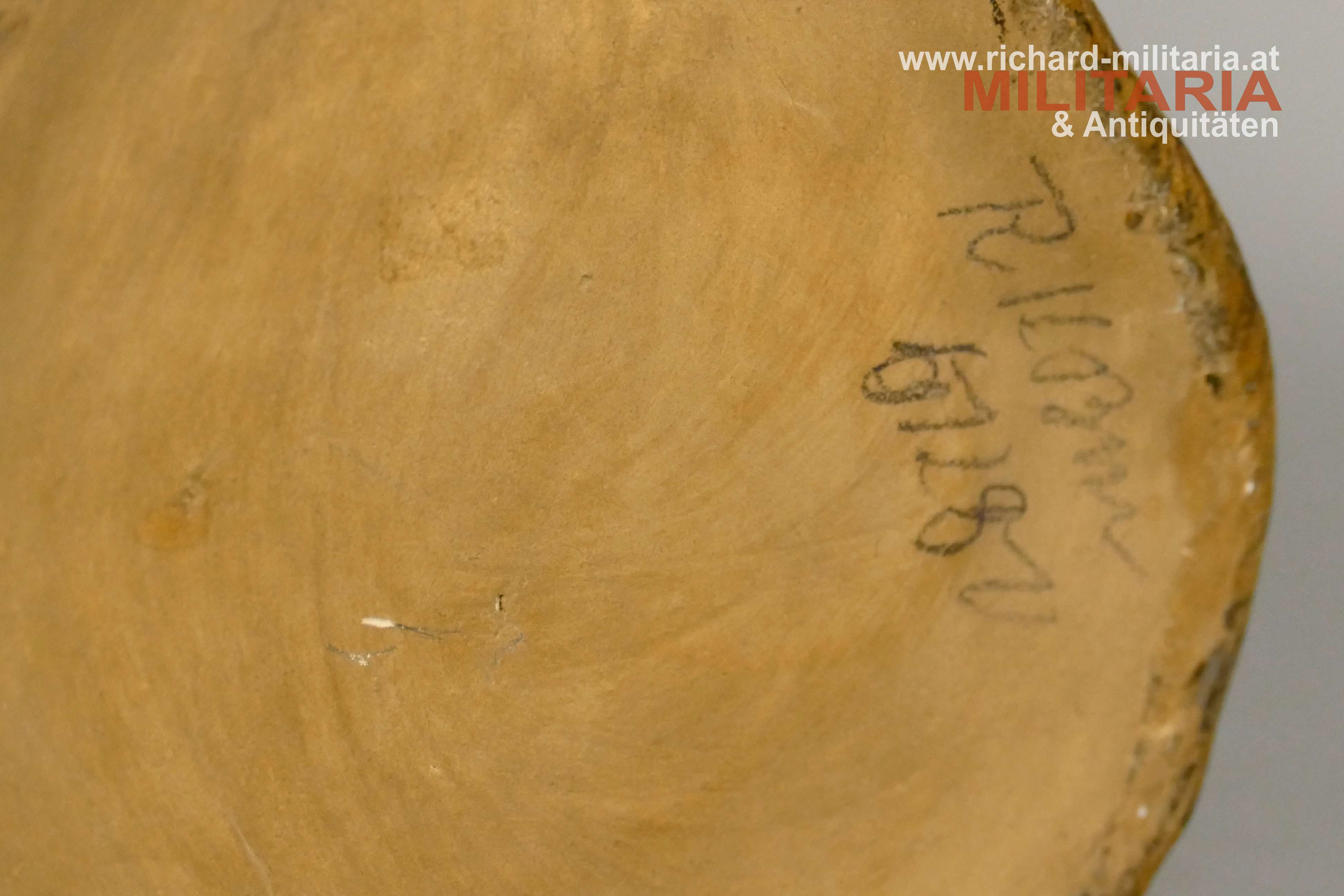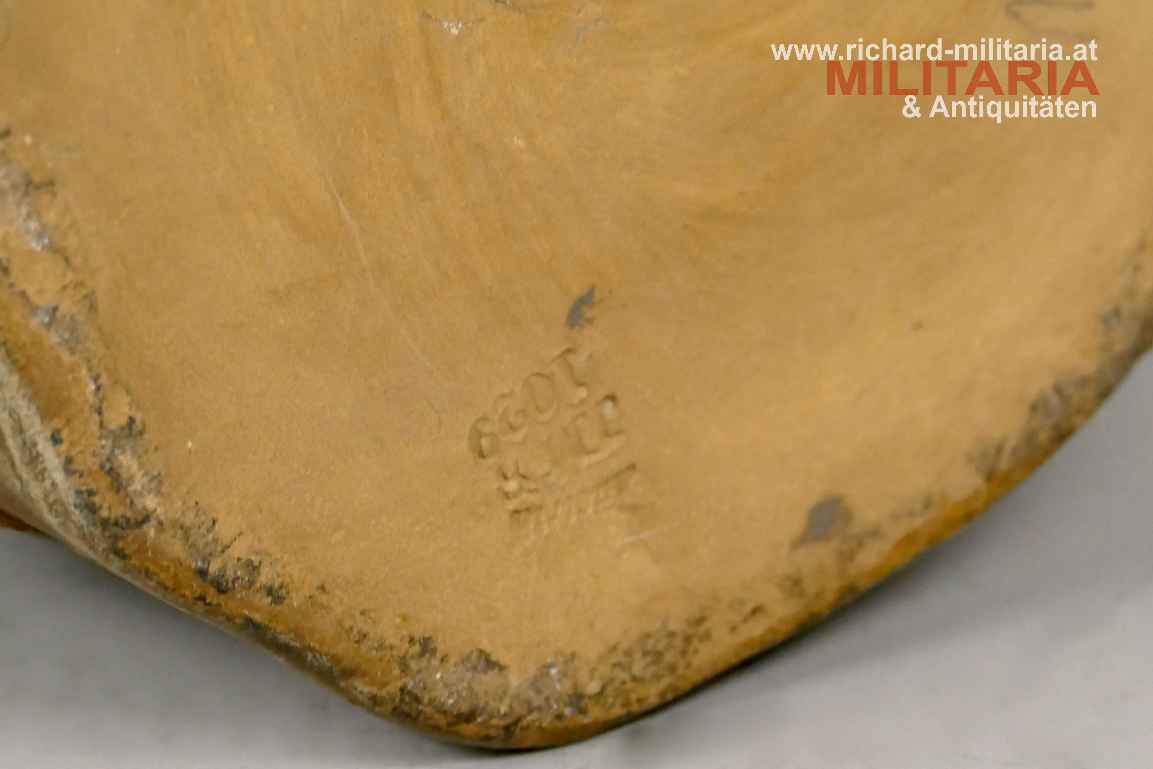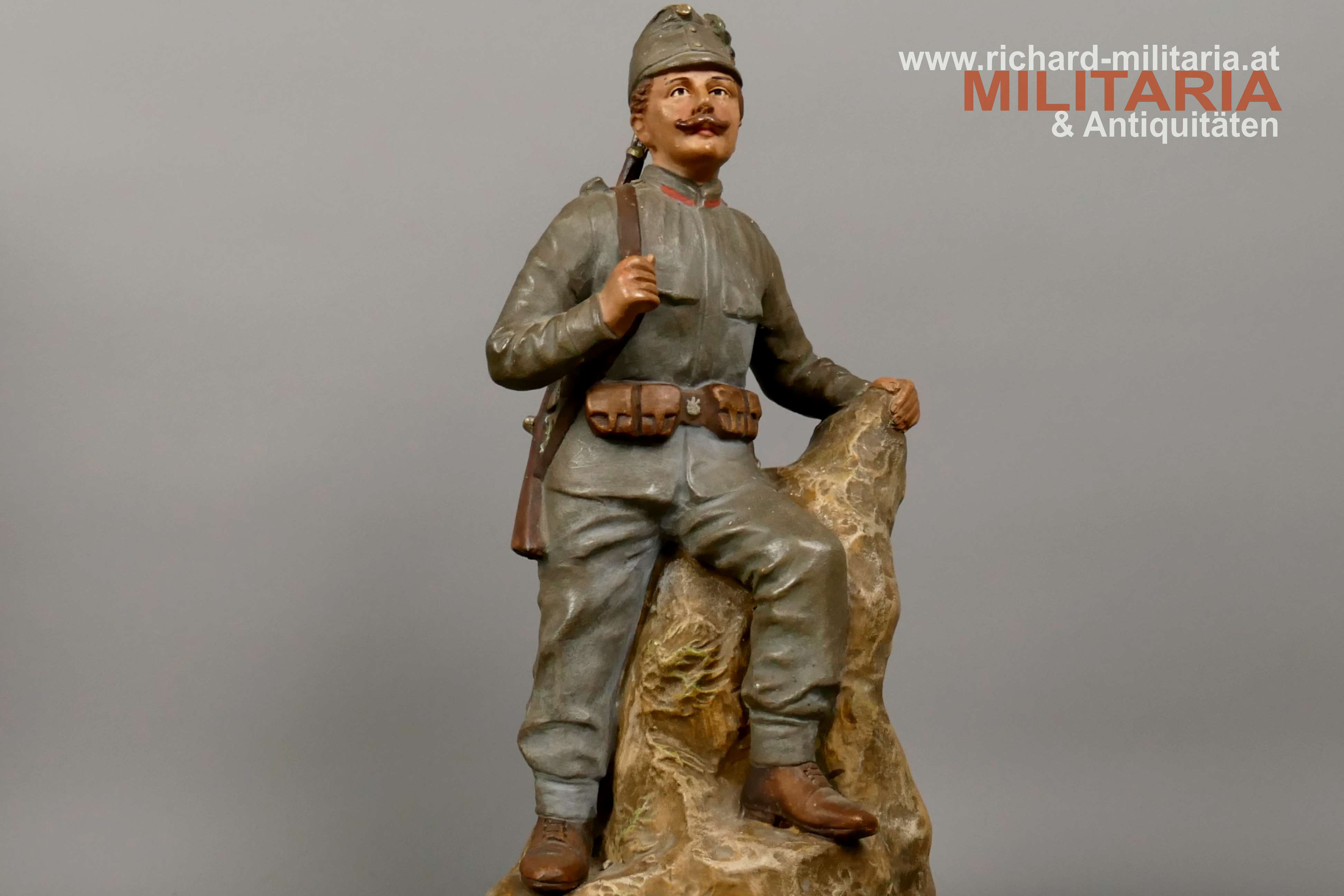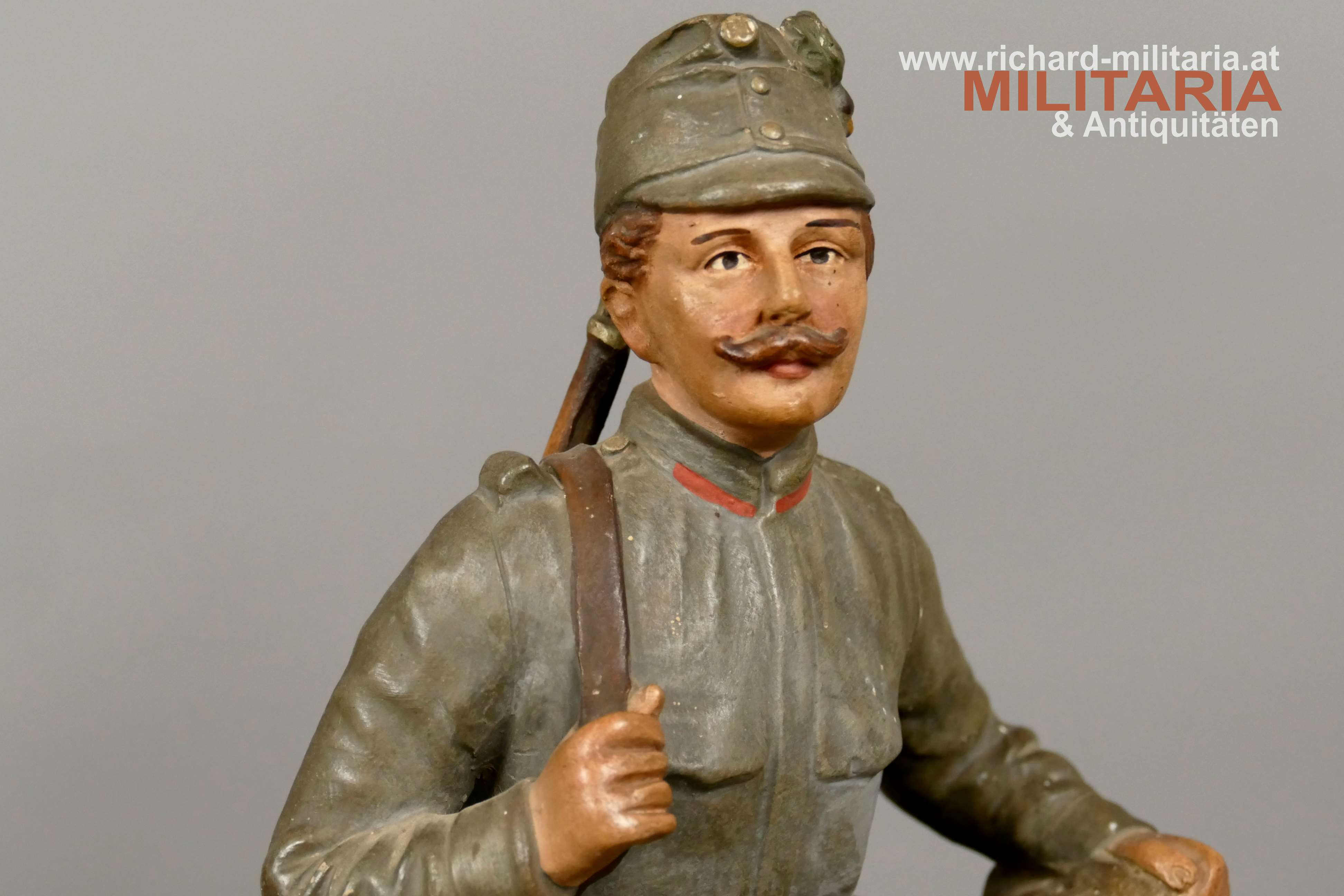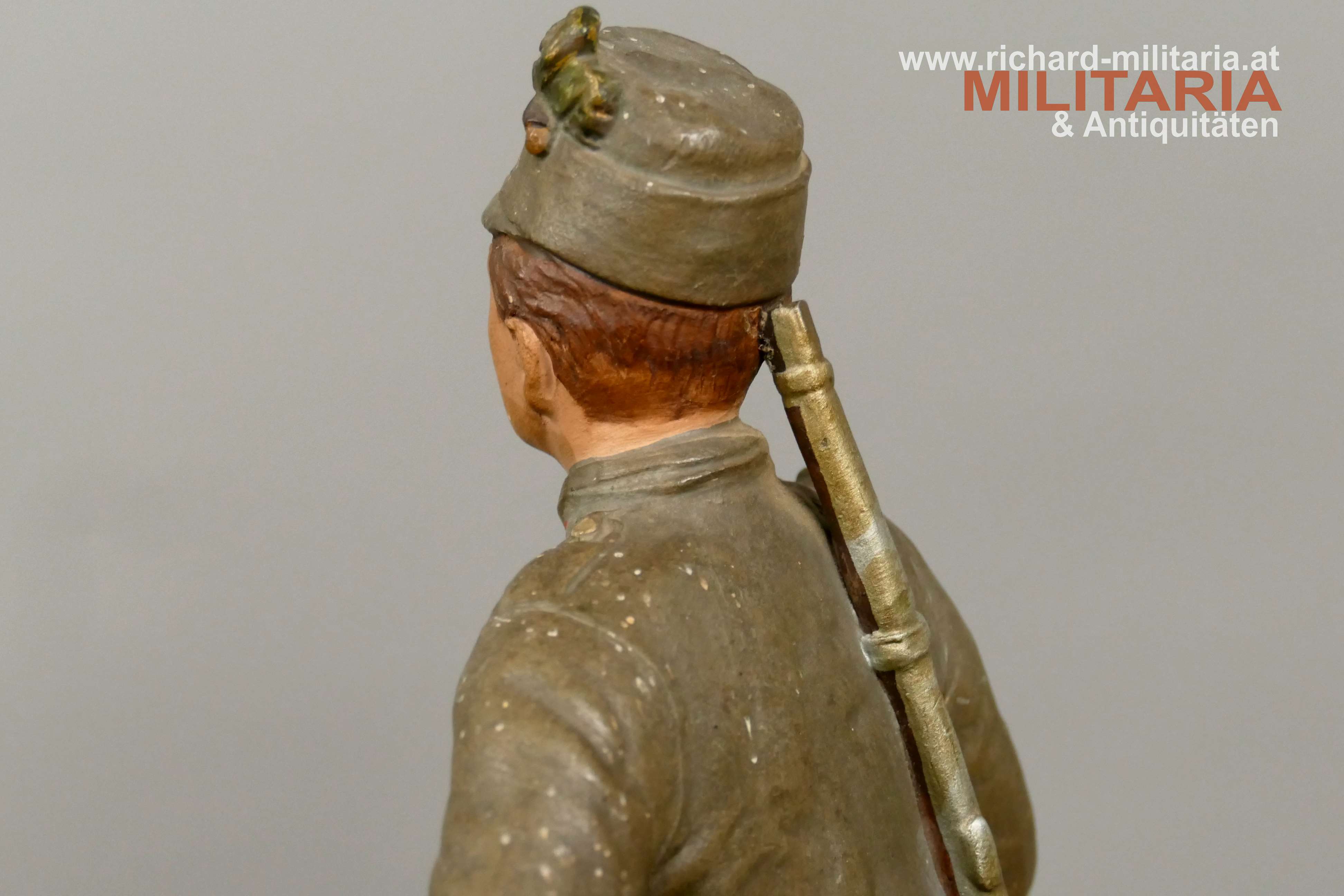 k.u.k. patriotische Vase - Infanterist, Bisquitporzellan bemalt, k.u.k. Infanterist in voller Adjustierung und Bewaffnung an einen Felsen lehnend, "Felsen" offen für die Blumen, Bodenstempel: "Austria JM6 - 1029", angeschmutzt,