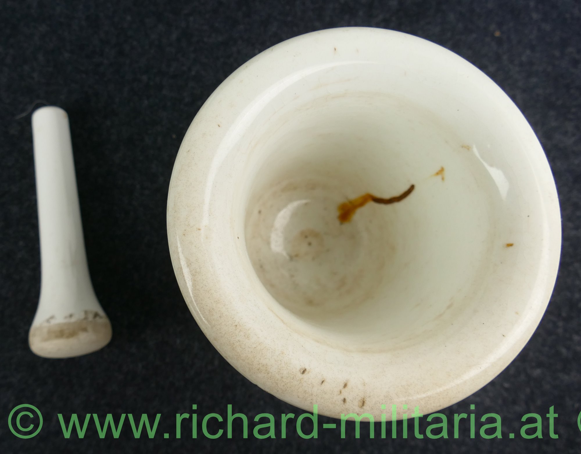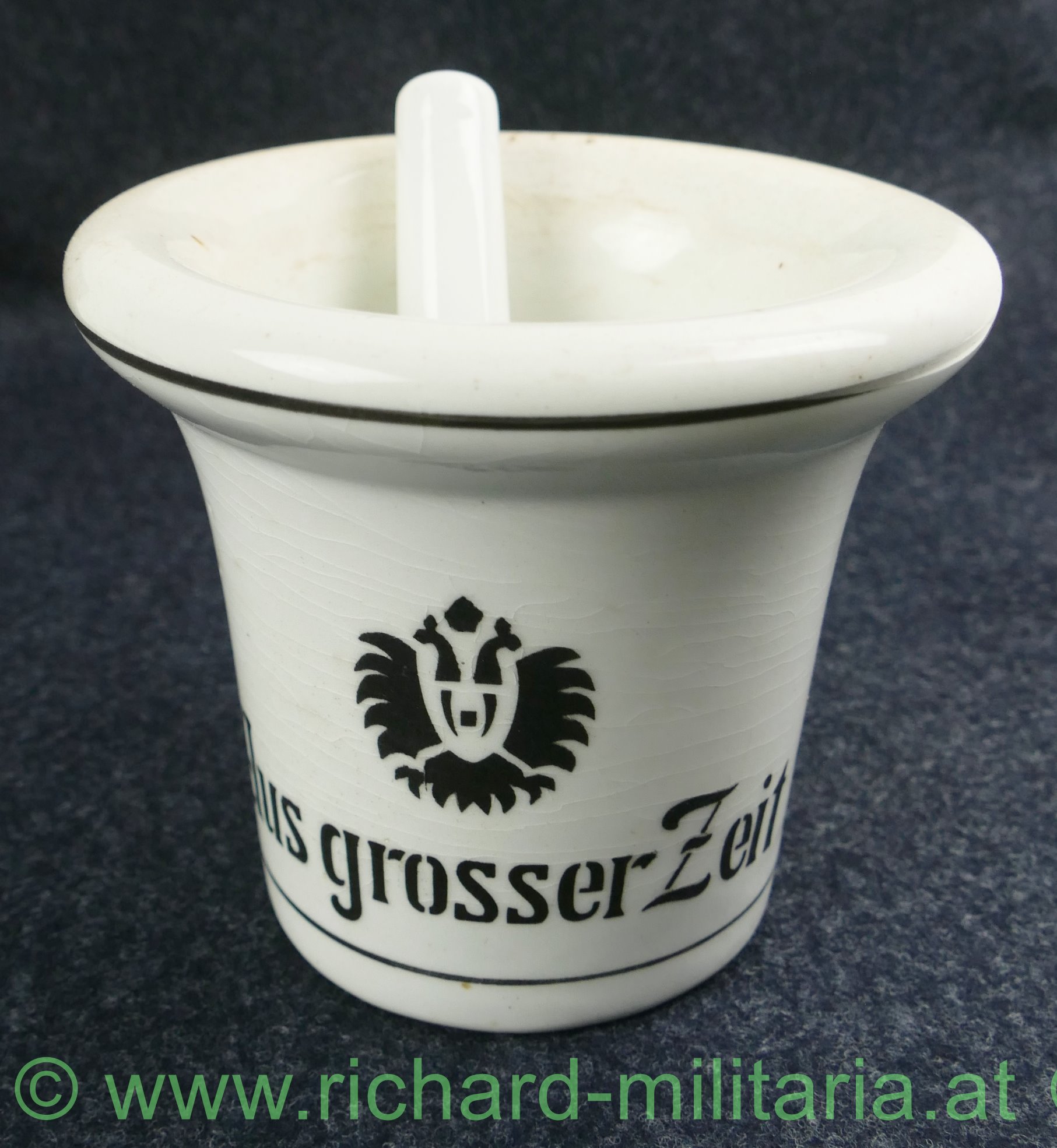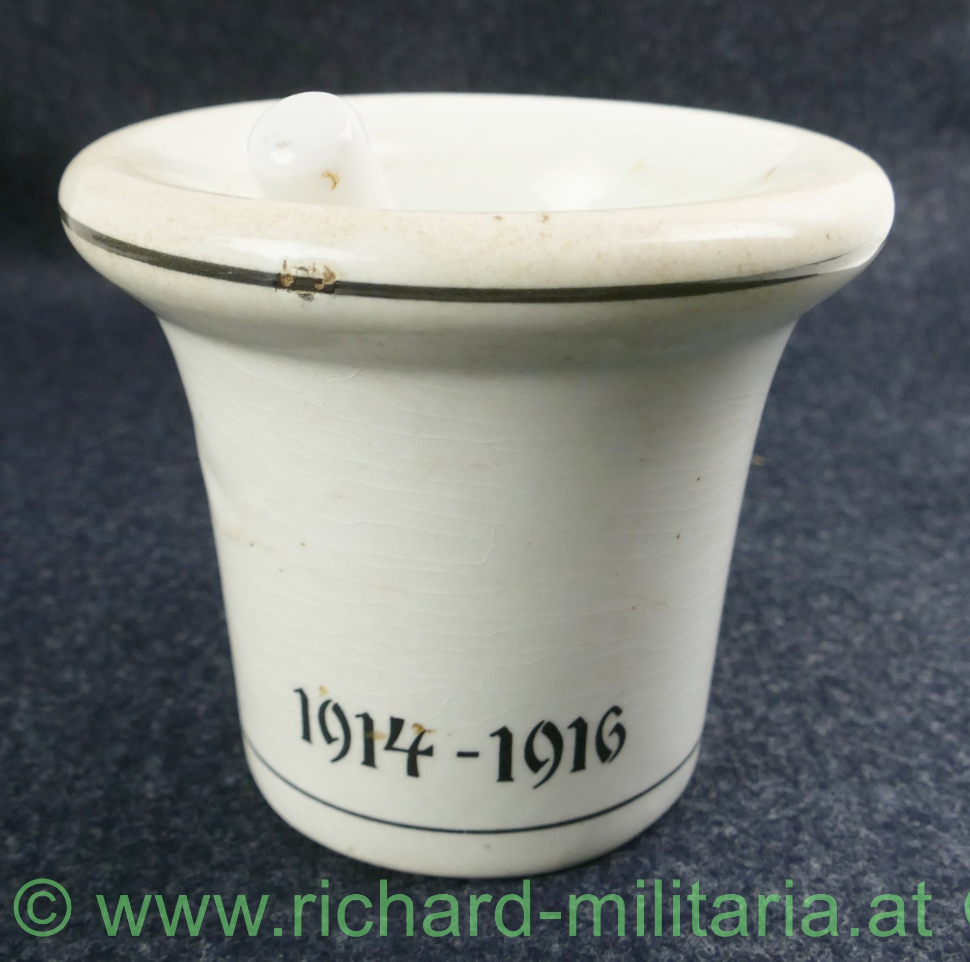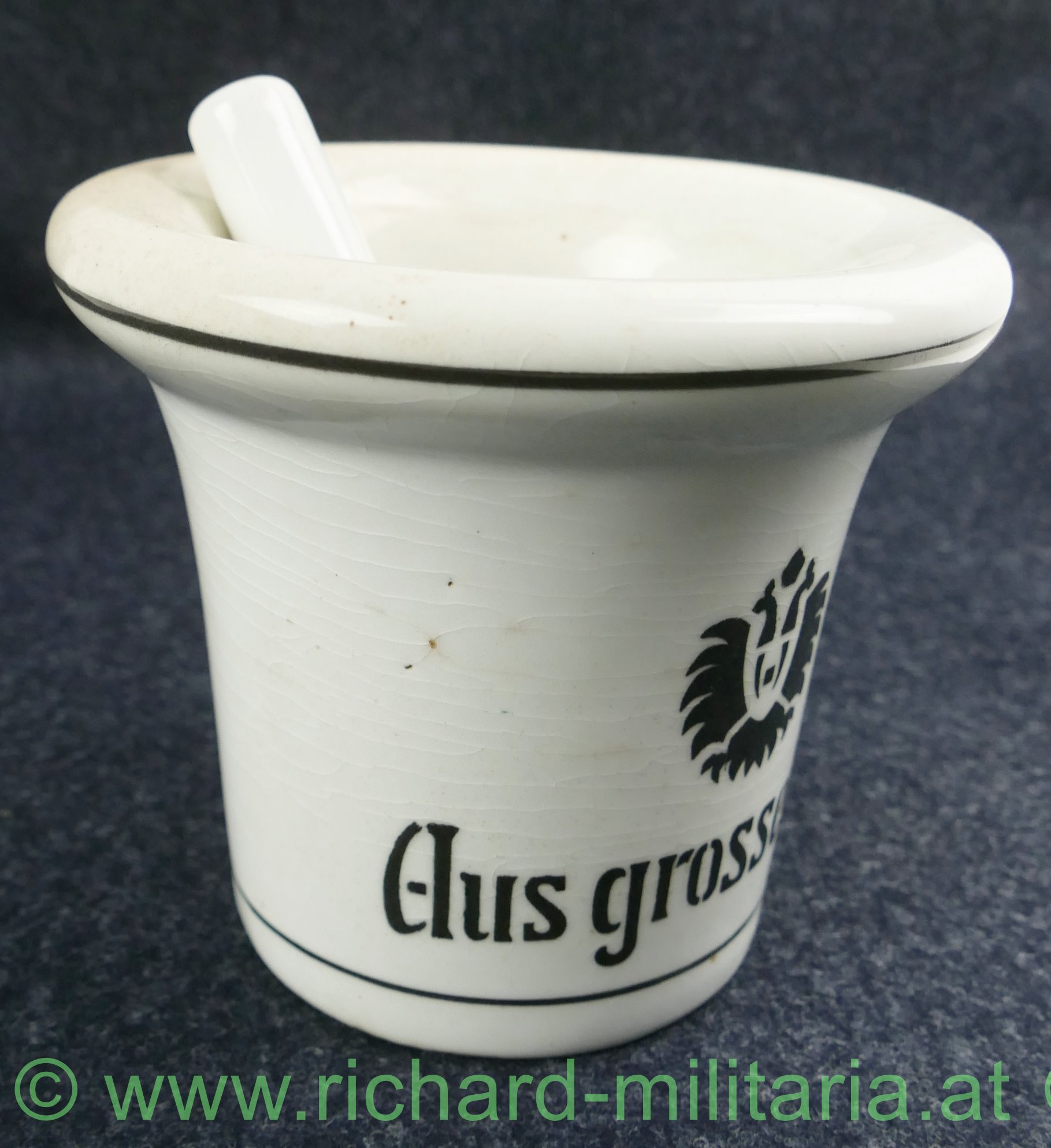 k.u.k. patriotischer Mörser Aus großer Zeit - 1914-1916, Steingut farblos glasiert, "Aus großer Zeit - Doppeladler - 1914 - 1916", Spannungsrisse in der Glasur, ohne Hersteller, Stößel relativ klein, verschmutzt - reinigungsbedürftig;