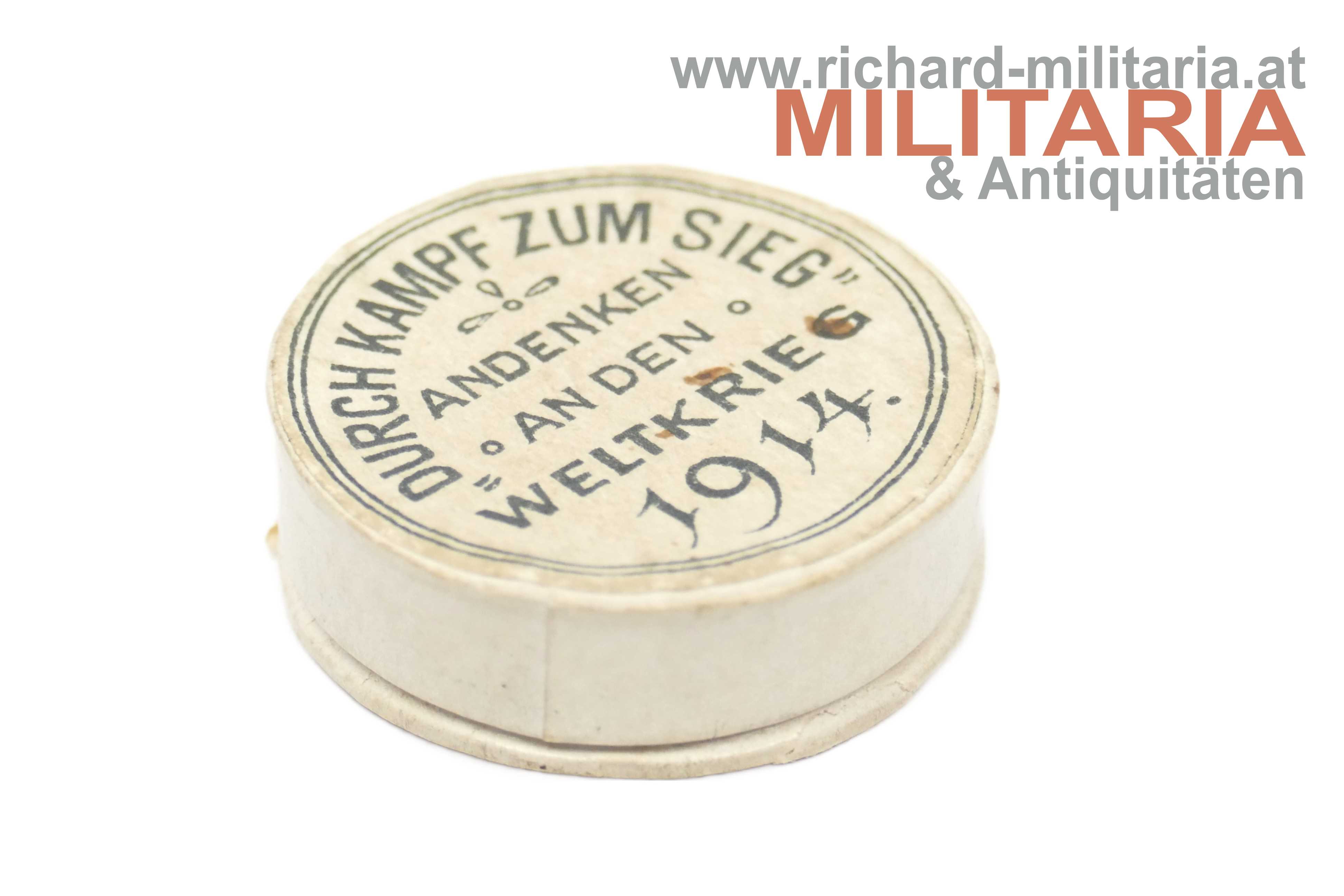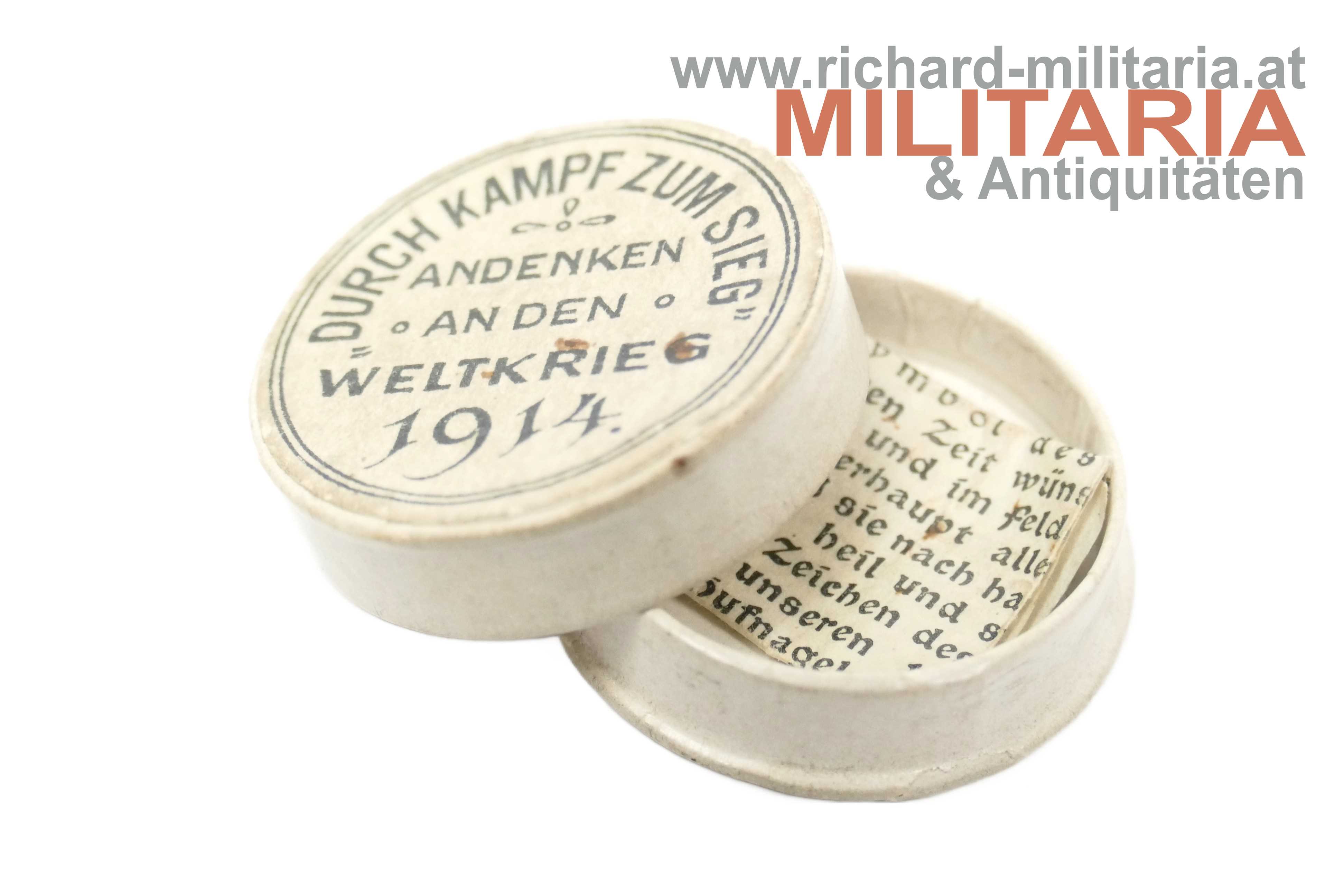 k.u.k. patriotischer "Kriegsglück-Ring" mit Etui - 1914; Metallring vernickelt mit Gravur: "Kriegsglück 1914", dazugehöriges rundes Kartonetui mit Aufdruck "Durch Kampf zum Sieg - Andenken an den Weltkrieg 1914", Etuiboden mit "Gesetzlich geschützt 4x" gestempelt; mit originalem beiliegenden Beschreibungszettel;