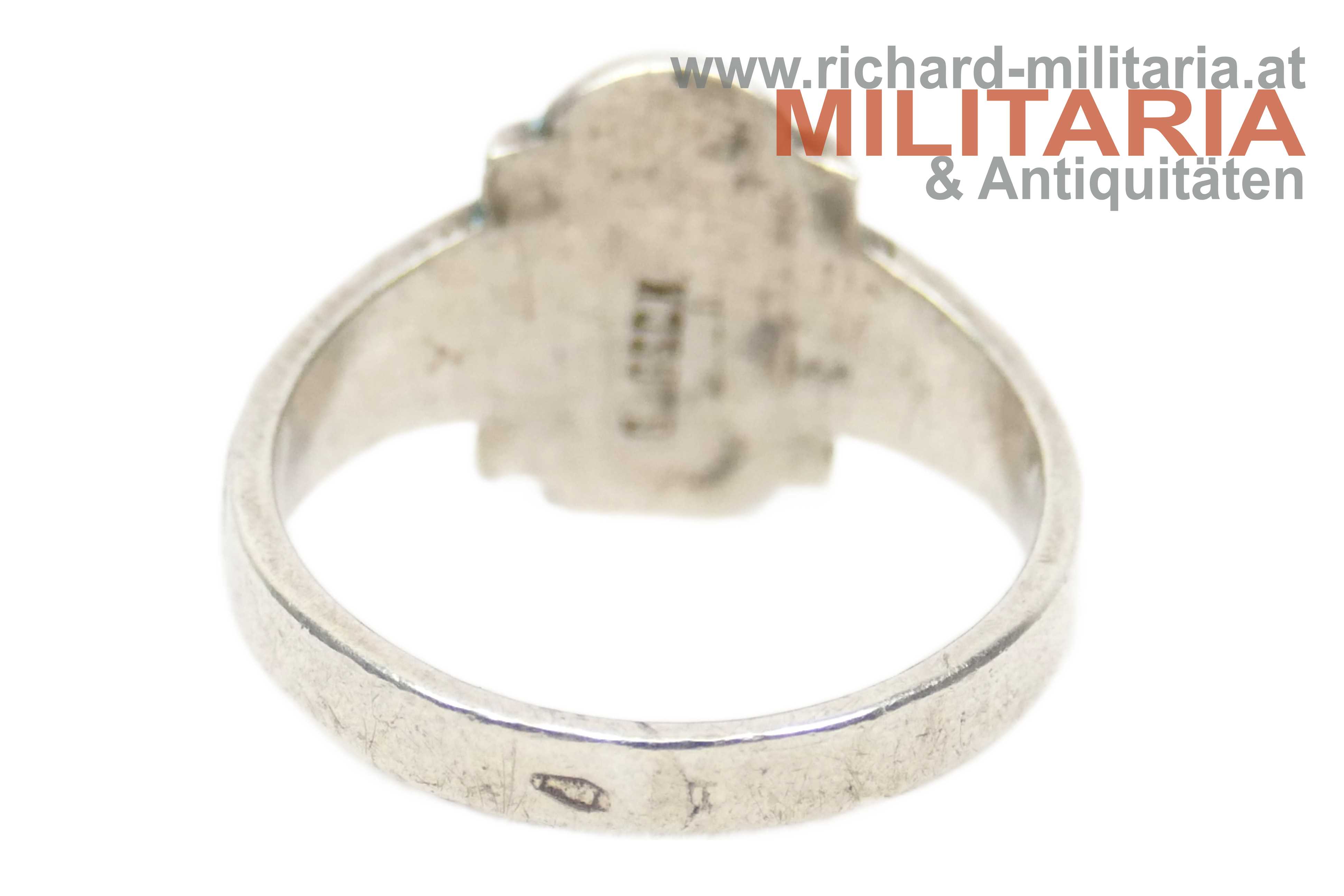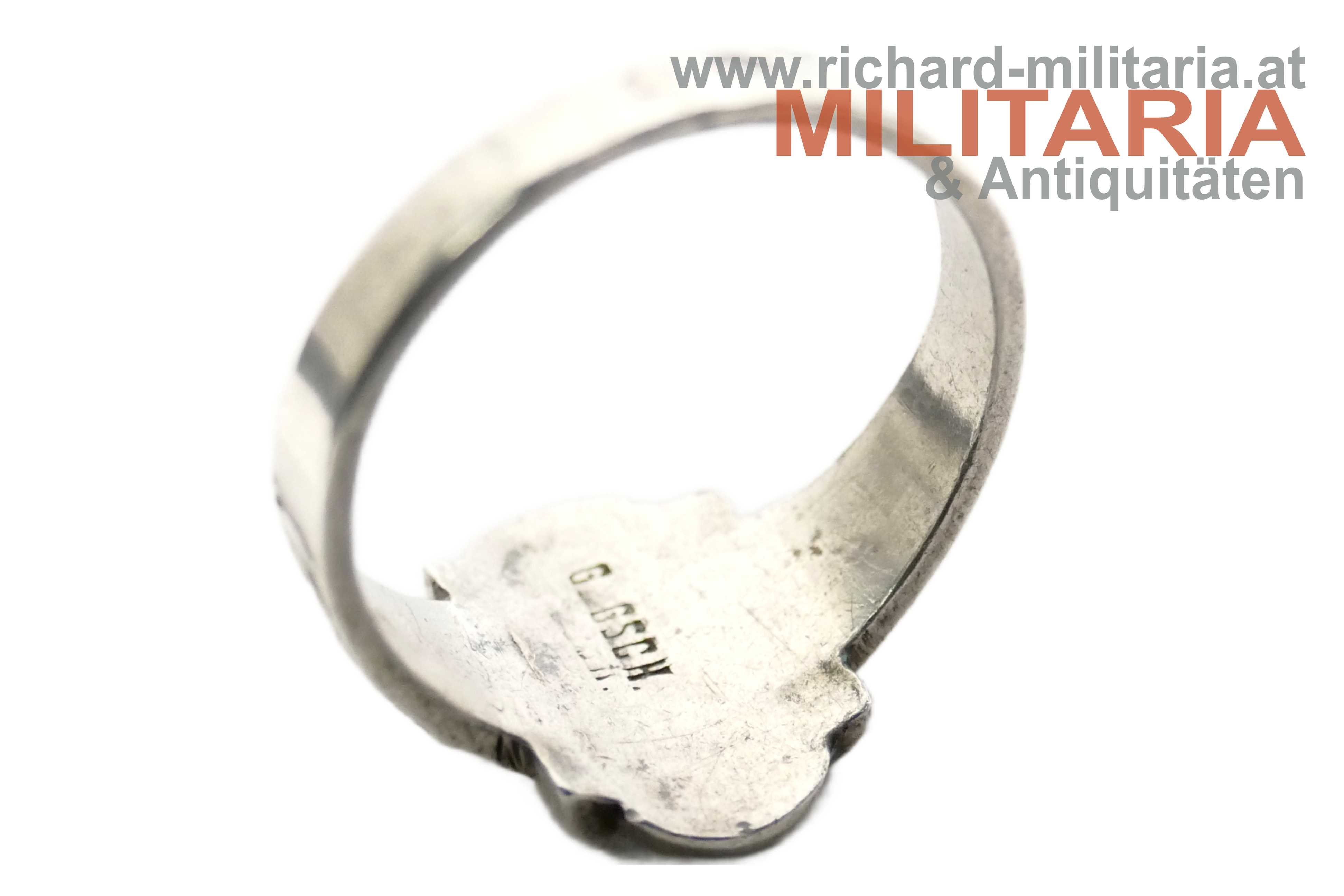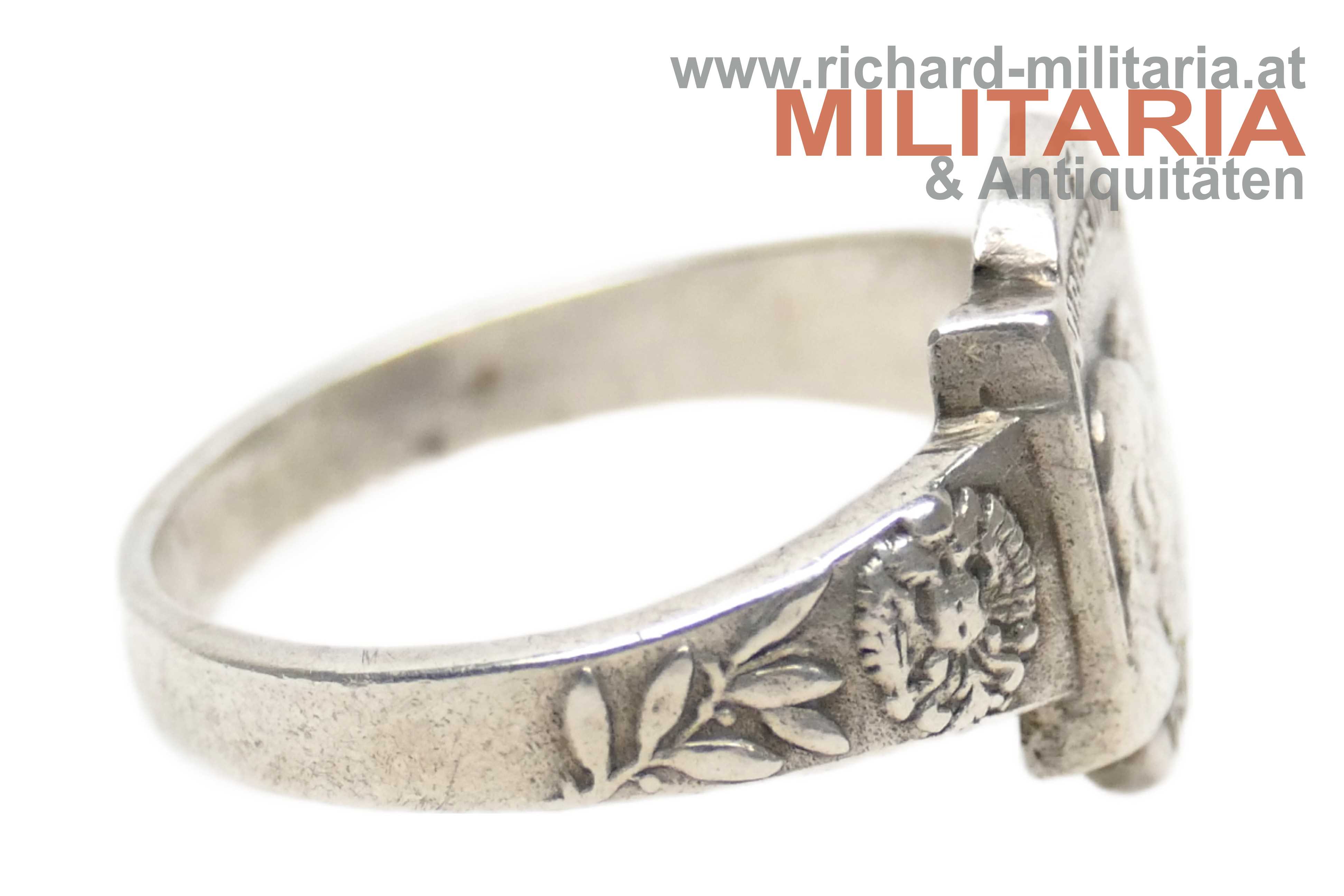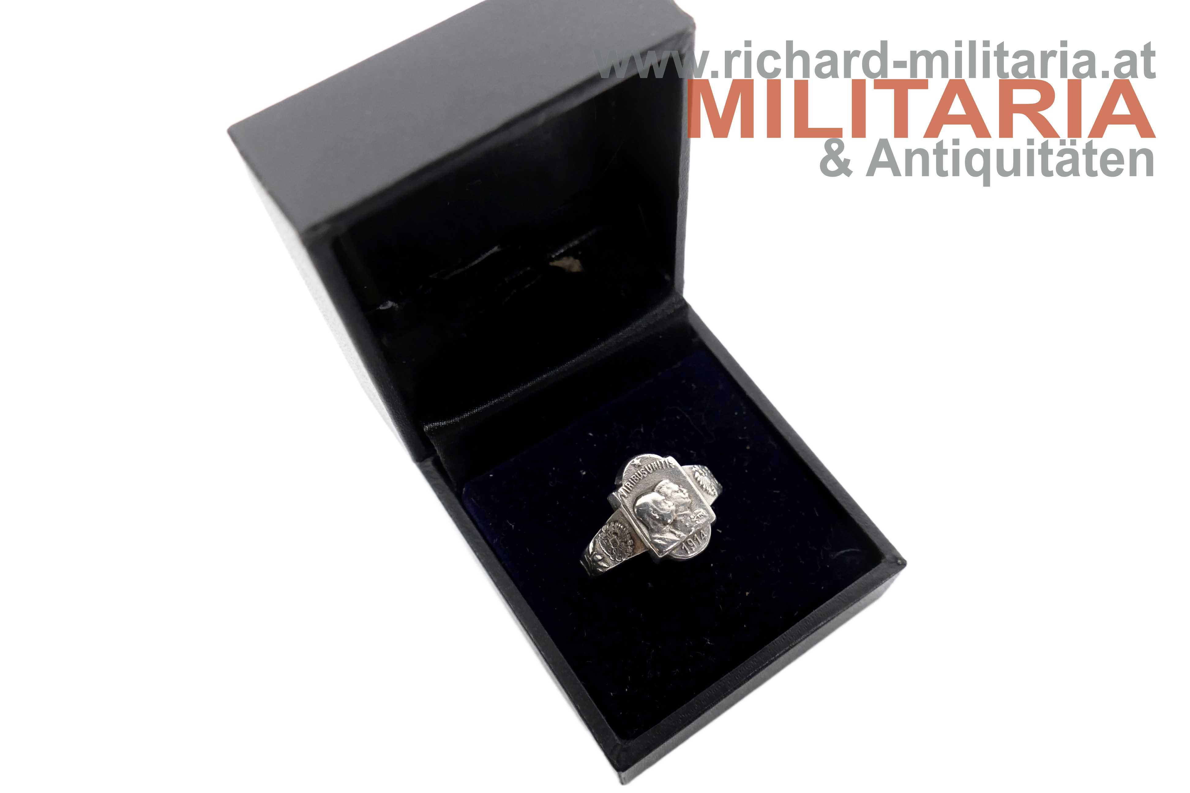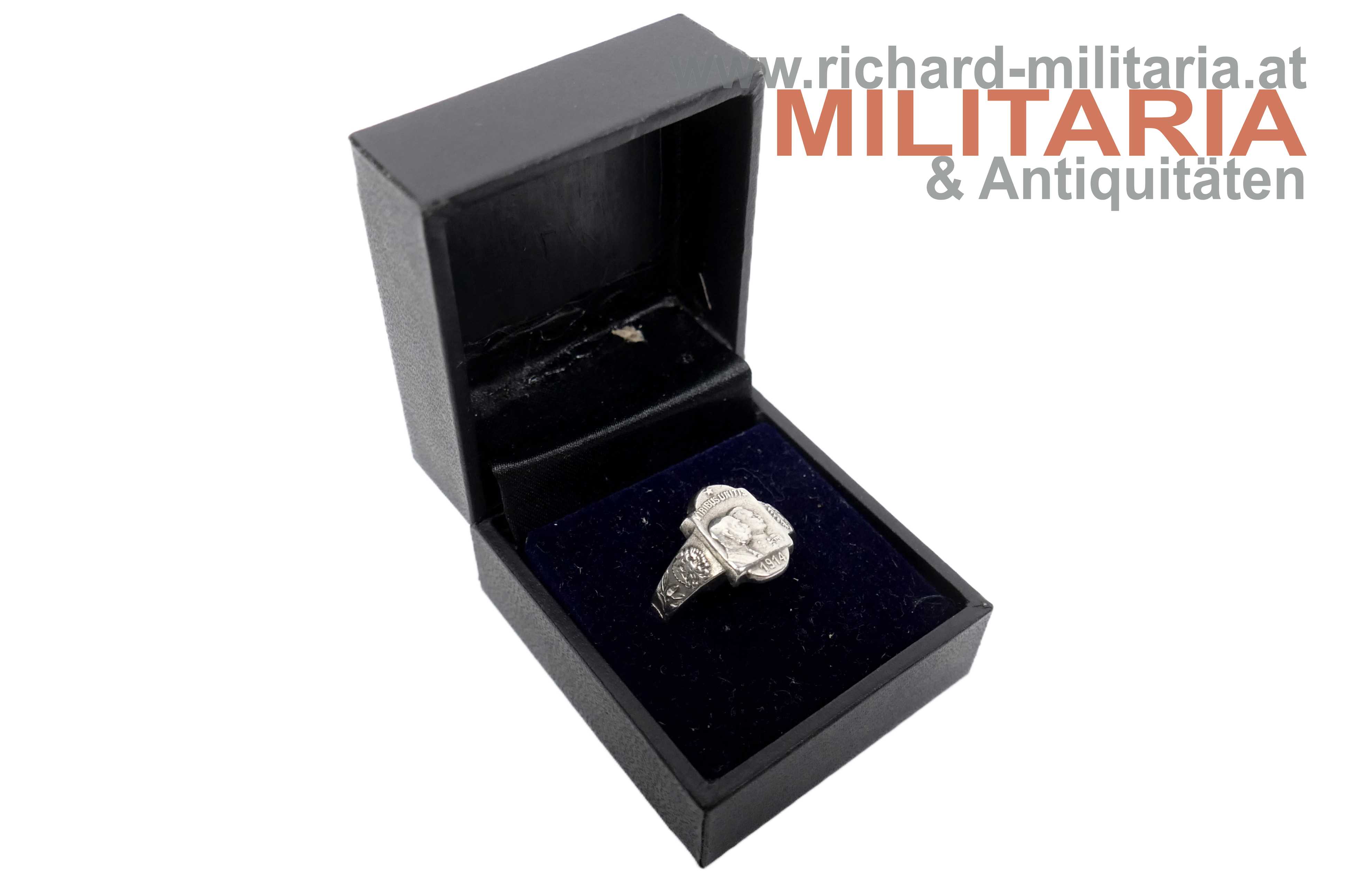 k.u.k. patriotischer Ring - Kaiser Franz Joseph & Kaiser Wilhelm; Windhundpunzierung; markiert "G. GSCH"; "Viribus Unitis" und "1914" oberhalb bzw. unterhalb der beiden Kaiser; beidseitig flankiert von einem kaiserlichen Doppeladler (links) und einem deutschen Reichsadler (rechts) sowie dezenter floraler Verzierung; mit neuzeitlichem Etui;
