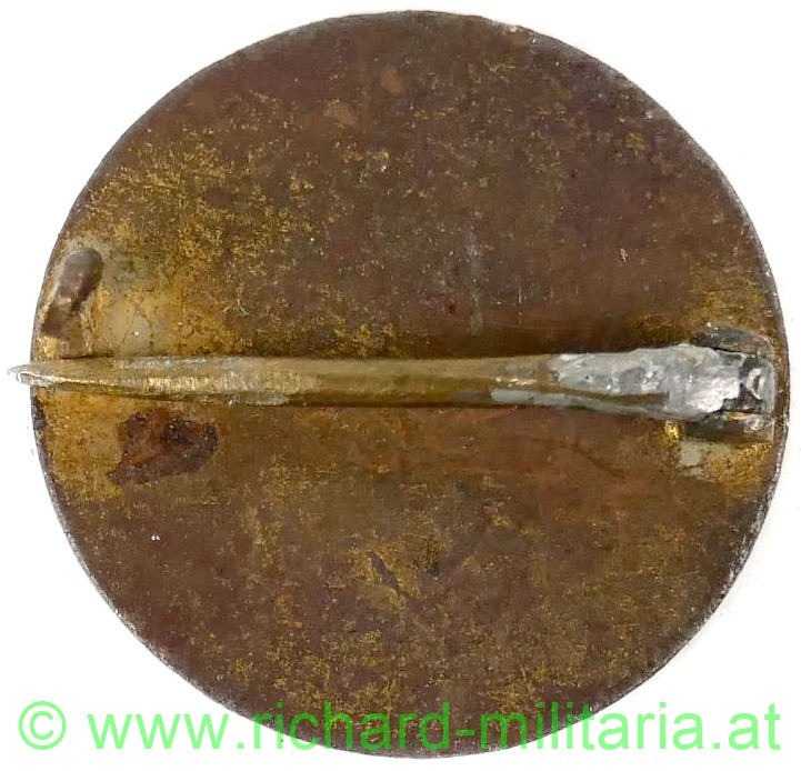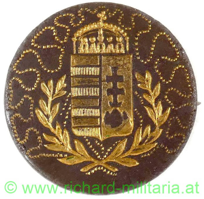 k.u.k. patriotisches Abzeichen, Bronze mit Gravur des ungarischen Wappens und Verzierungen, diese vergoldet, Durchmesser: 23mm, originale Nadel - diese repariert;