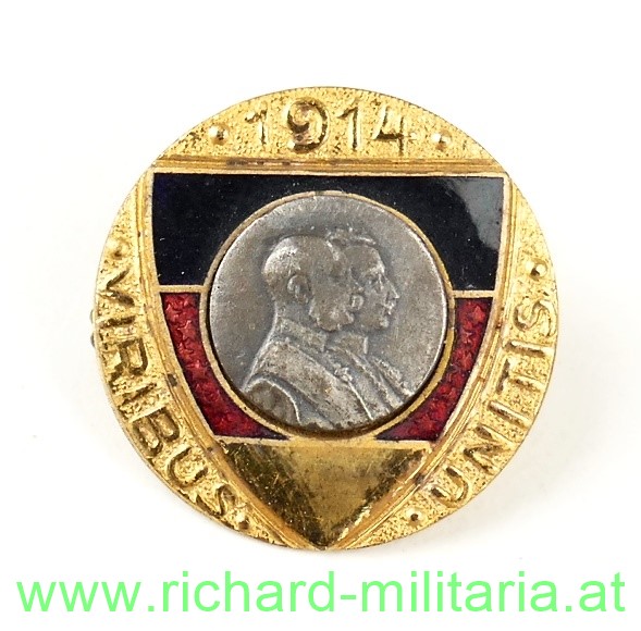 k.u.k. patriotisches Abzeichen - Viribus unitis 1914, Tombak vergoldet und mit polierten Flächen, beide Kaiser als Reliefbildnis aufgebracht, emailliert, interessantes Nadelsystem;