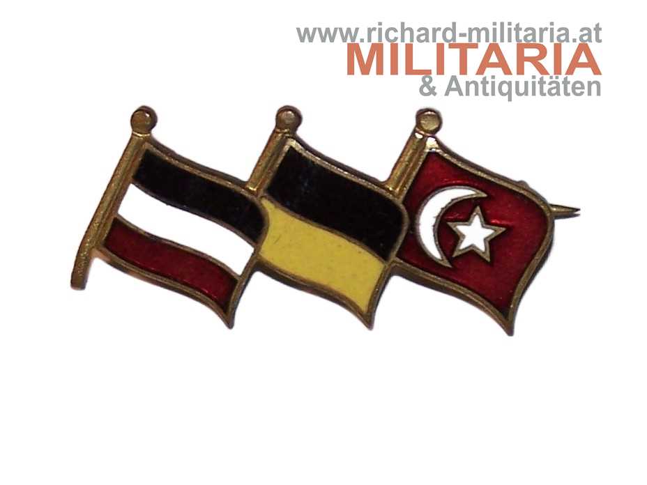 k.u.k. patriotisches Abzeichen - Flaggen - Deutschland Österreich Türkei; Tombak emailliert; originales Nadelsystem;