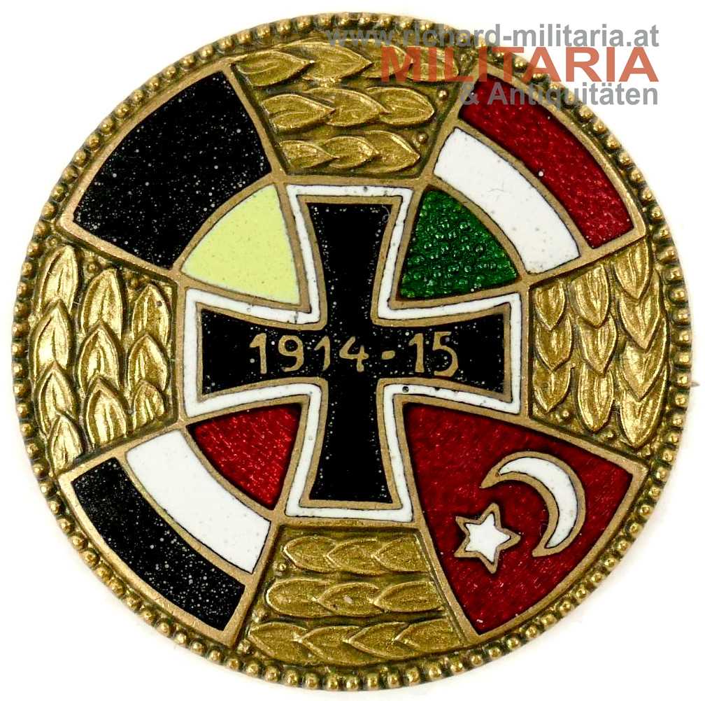 k.u.k. patriotisches Abzeichen - 1914-15 mit Wappen der 4 verbündeten Mächte; Tombak vergoldet und emailliert; Durchmesser 30,5 mm