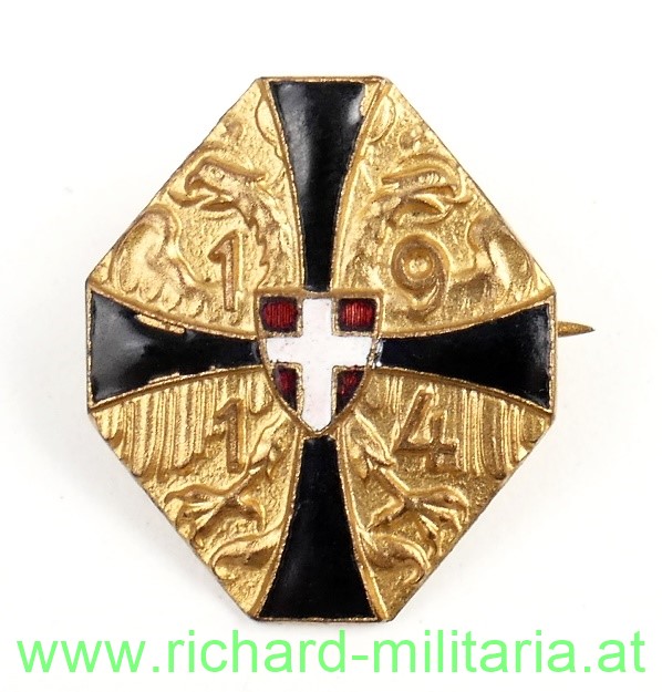 k.u.k. patriotisches Abzeichen "Schwarz-gelbes Kreuz", 1914, Tombak vergoldet und teilweise emailliert, originale Nadel,