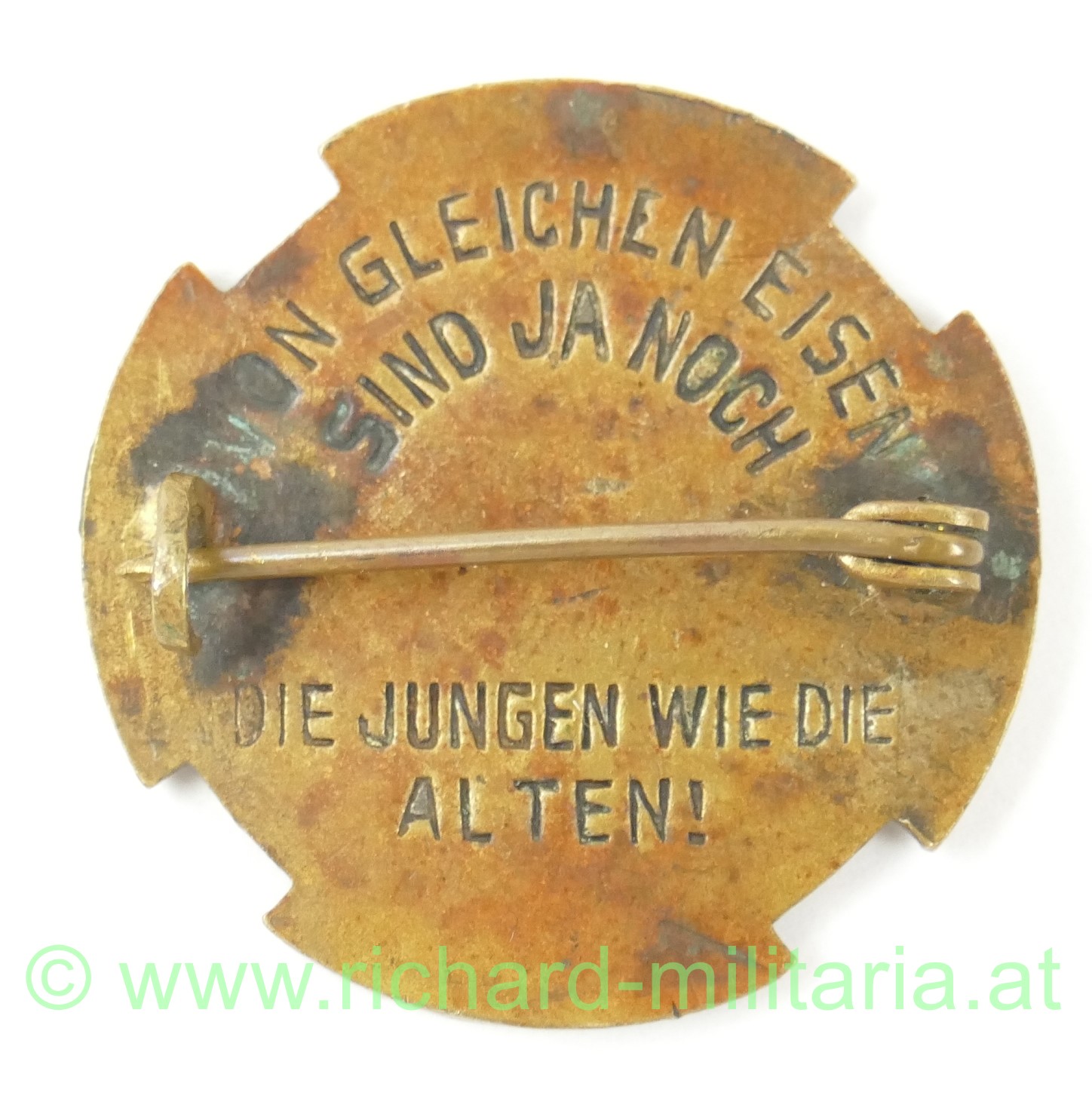 k.u.k. patriotisches Abzeichen "Tiroler Adler lebe hoch du wirst den Kranz behalten"; Tombak emailliert, originales Nadelsystem; auf der Rückseite: "Von gleichen Eisen sind ja noch die Jungen wie die Alten!"