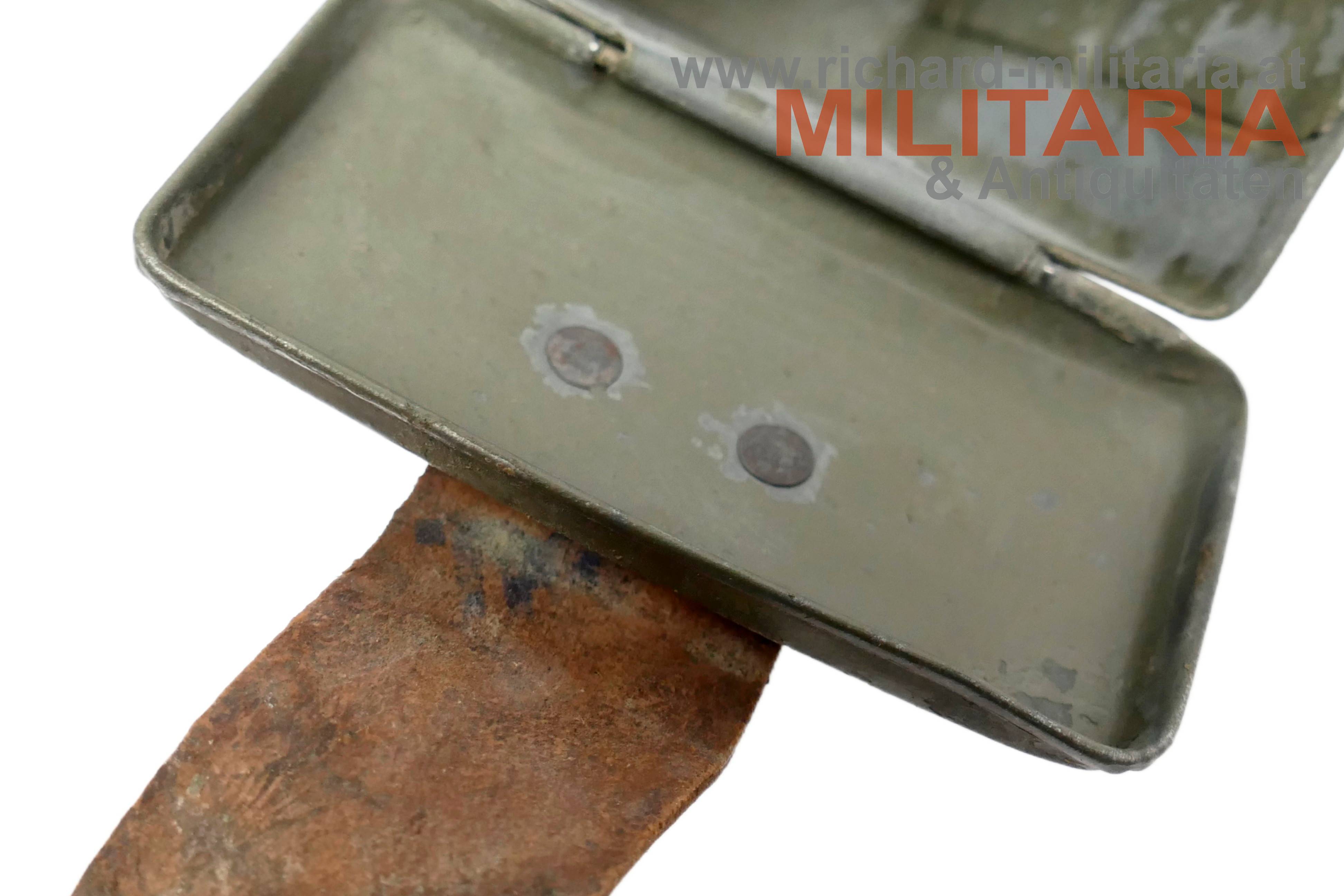 k.u.k. Patronentasche zum Karabiner M95; Eisenblech feldgrau lackiert; doppelt am Deckel vernietete Schließschlupfe; gut erhaltene Kriegsfertigung;